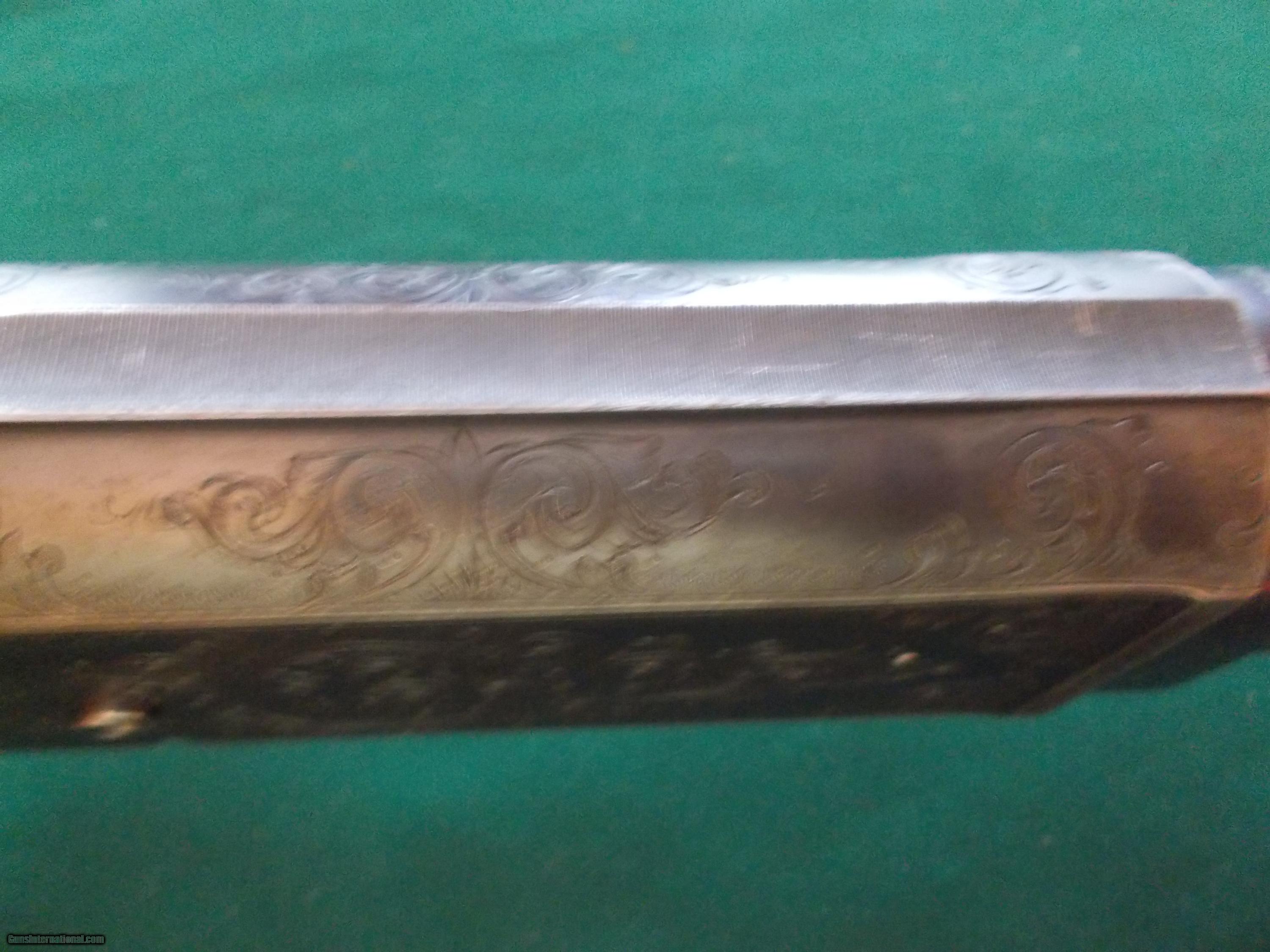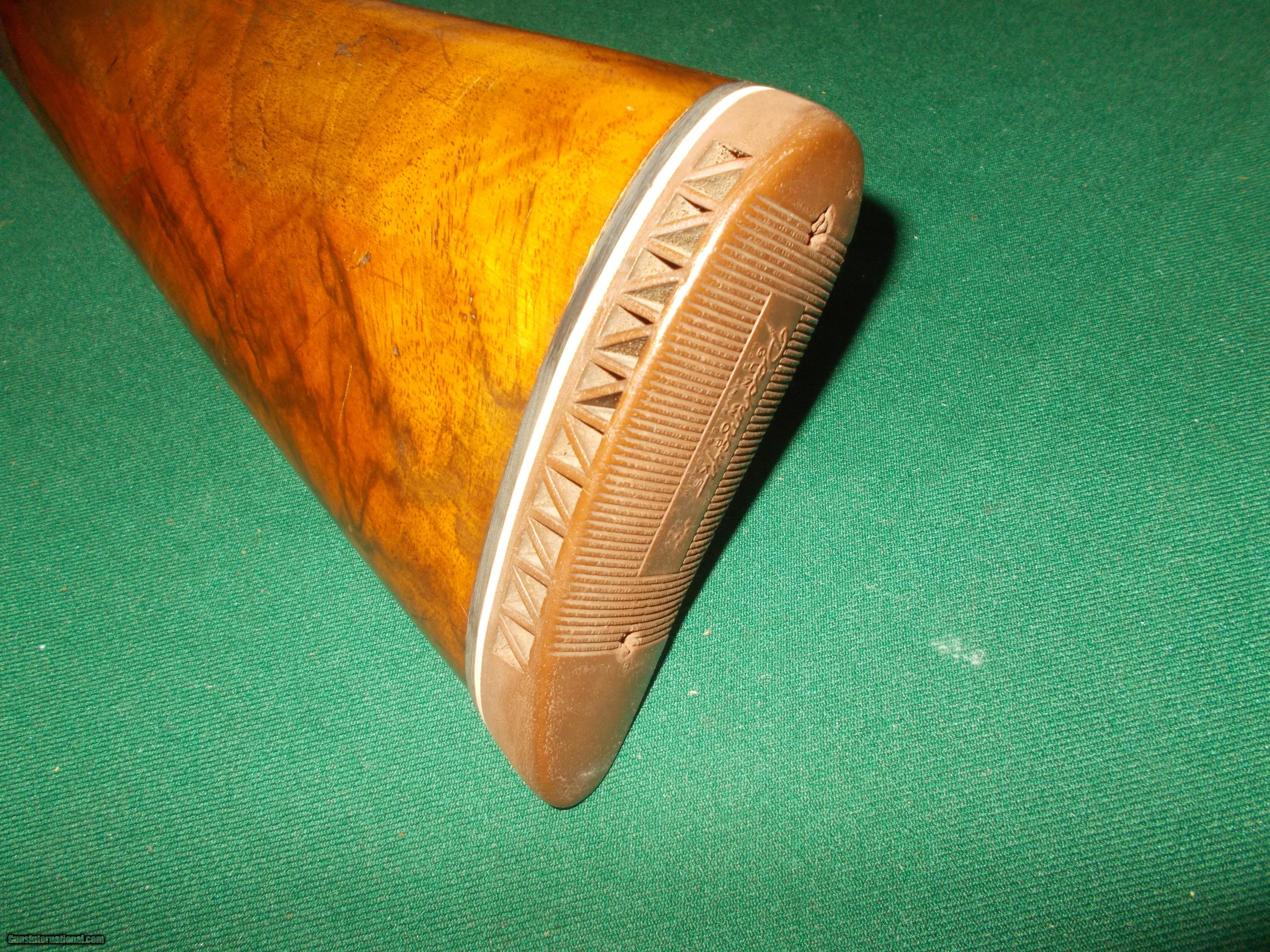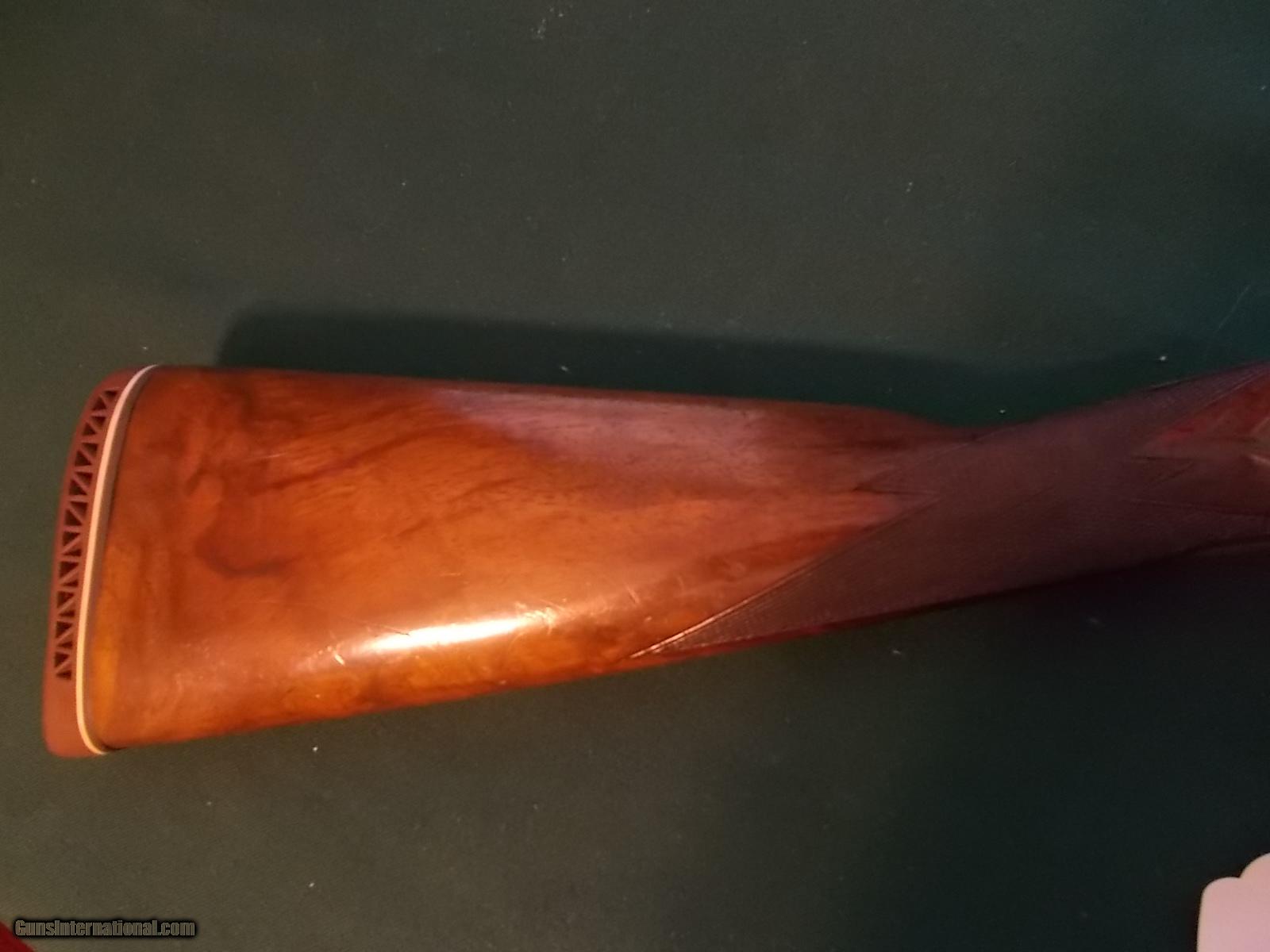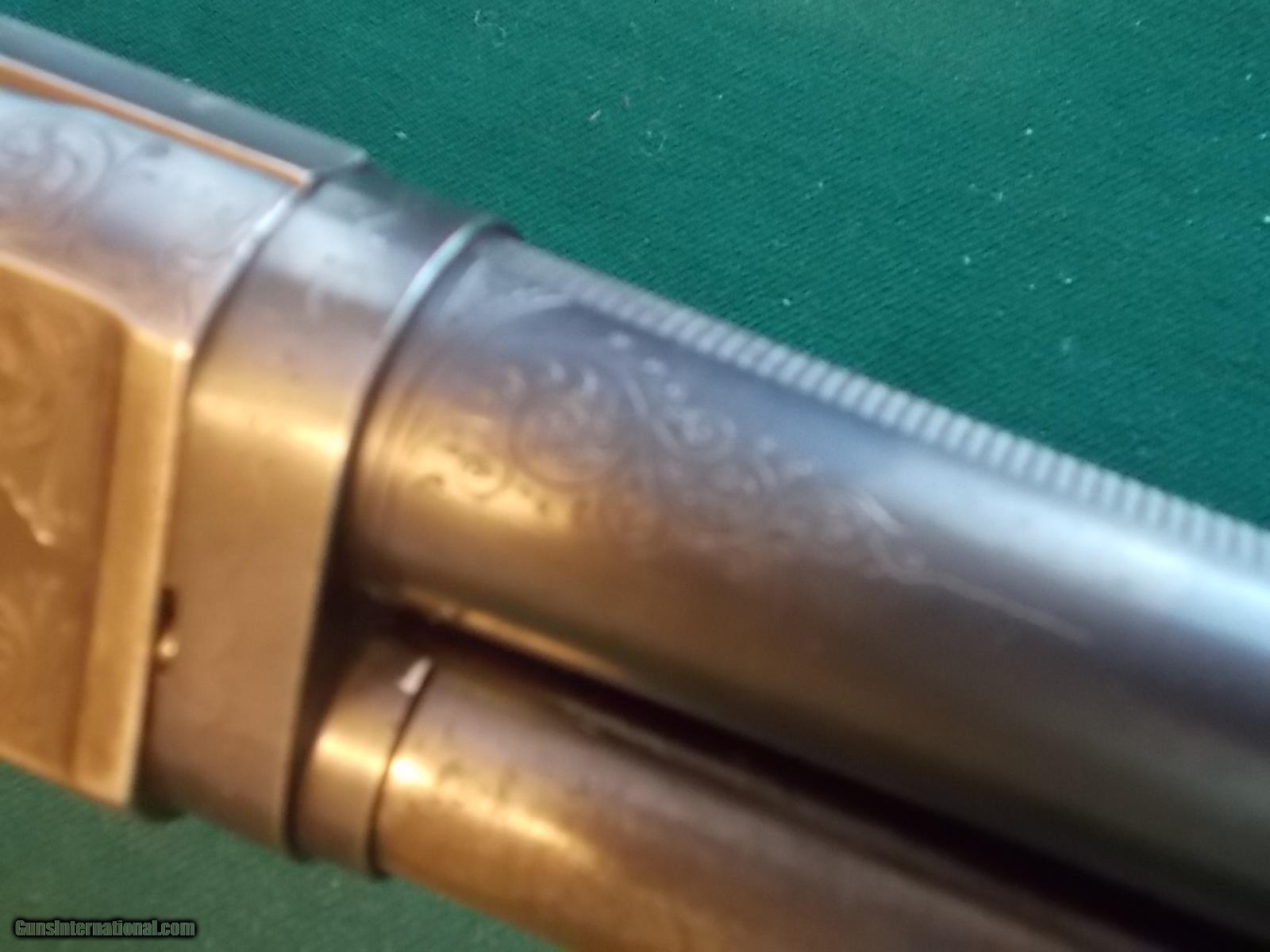 Description: 30" PB, choked Full, flat checkered bbl. rib extensive elaborate scrollwork hand engraved receiver, preminum grade American walnut checkered straight stock & forearm, factory 1" vented pad, 70% OA blue, stock solid with som ehandling & scratches, ( chip blemish left of top tang (pictured) SOLD |