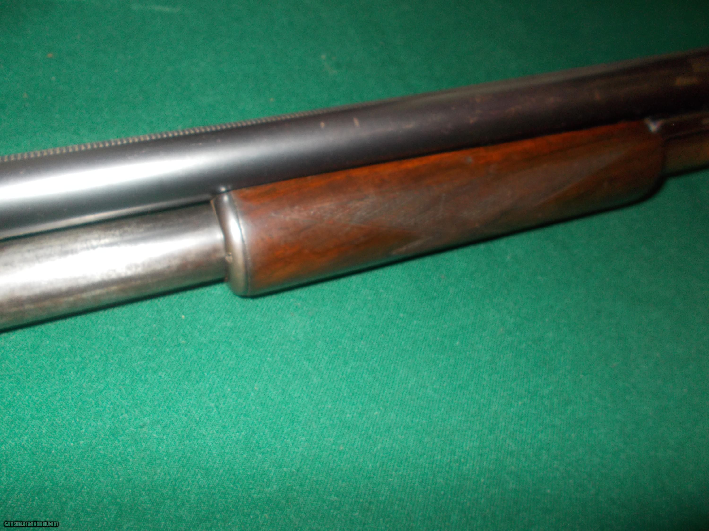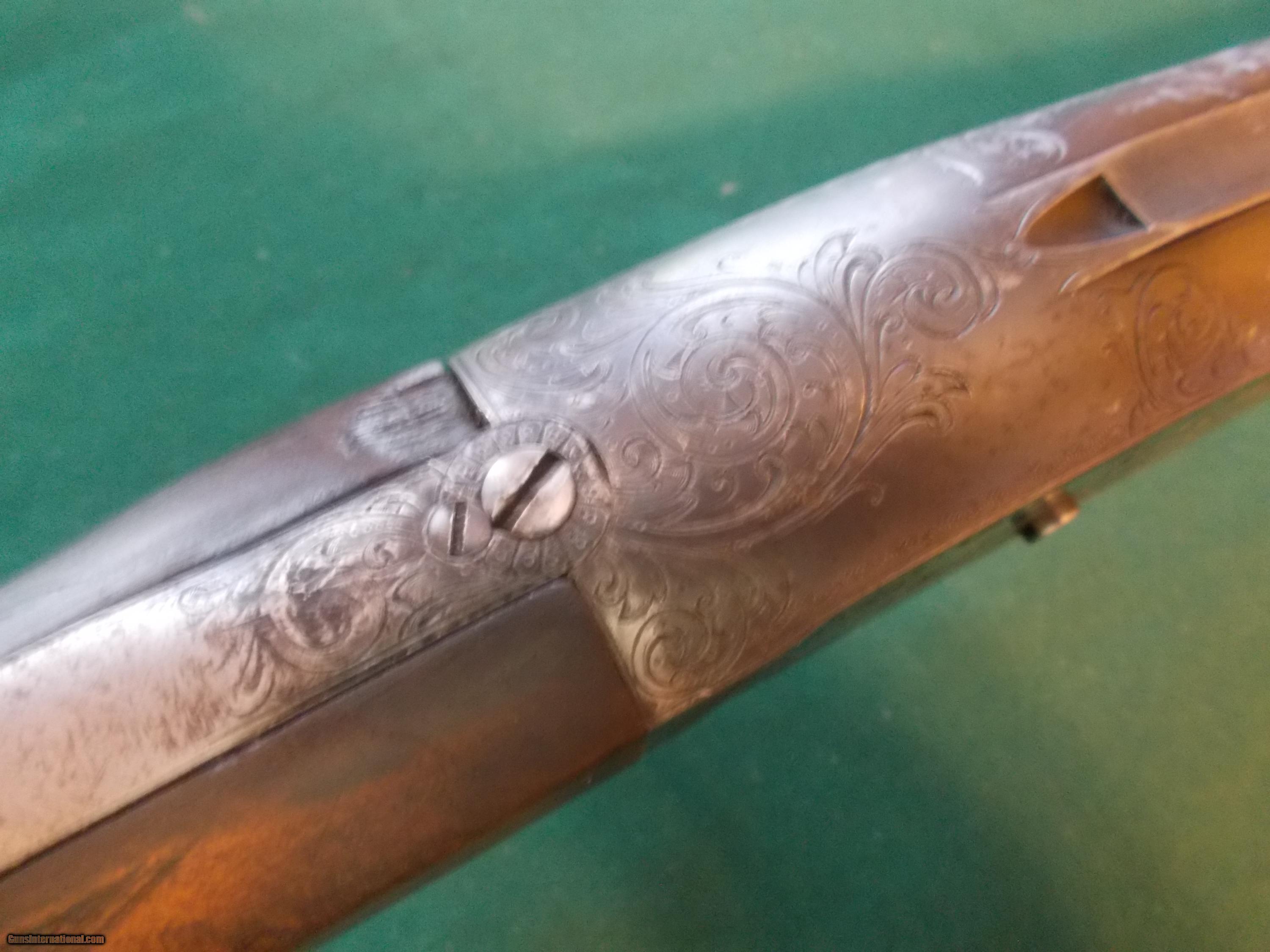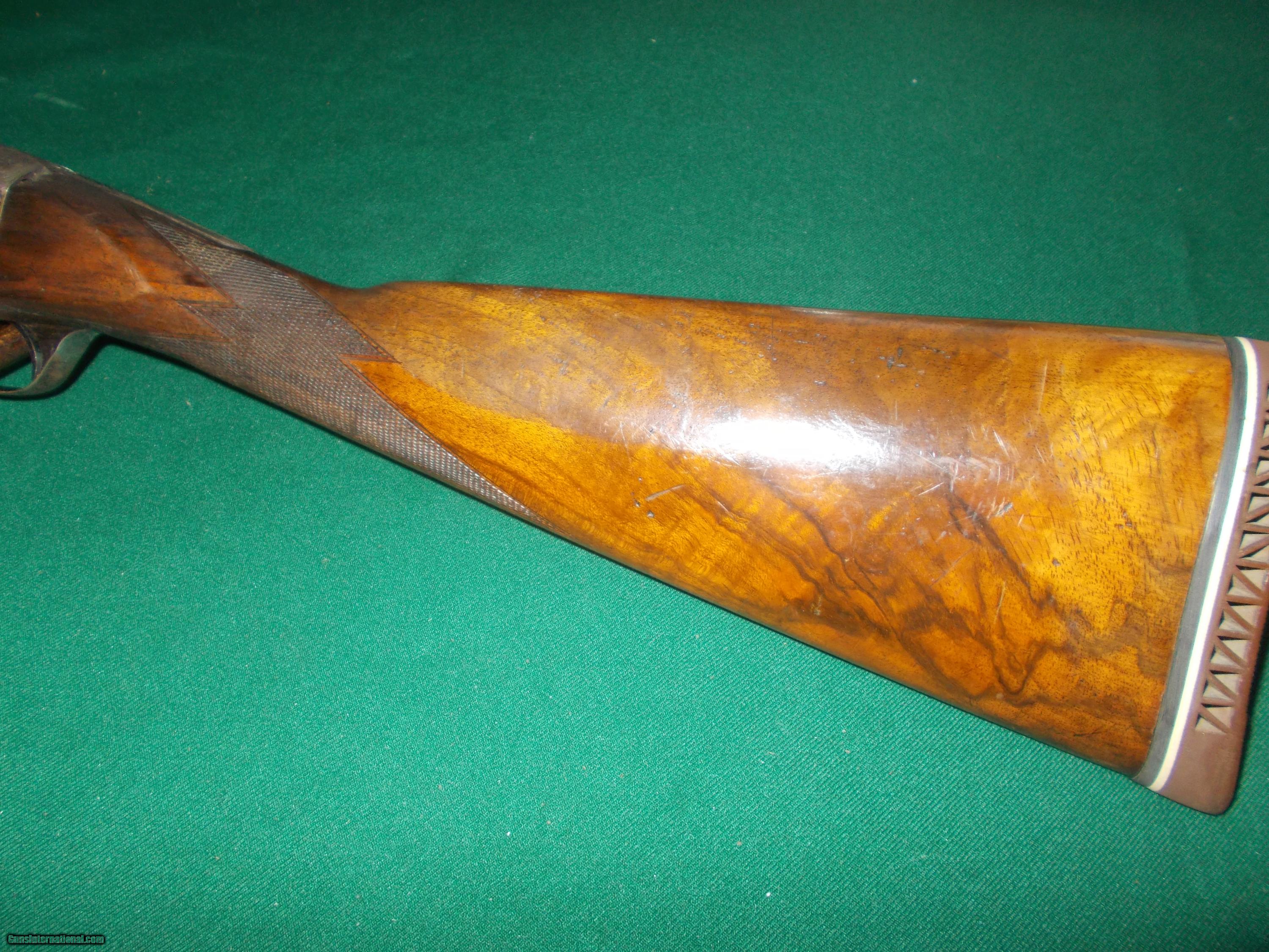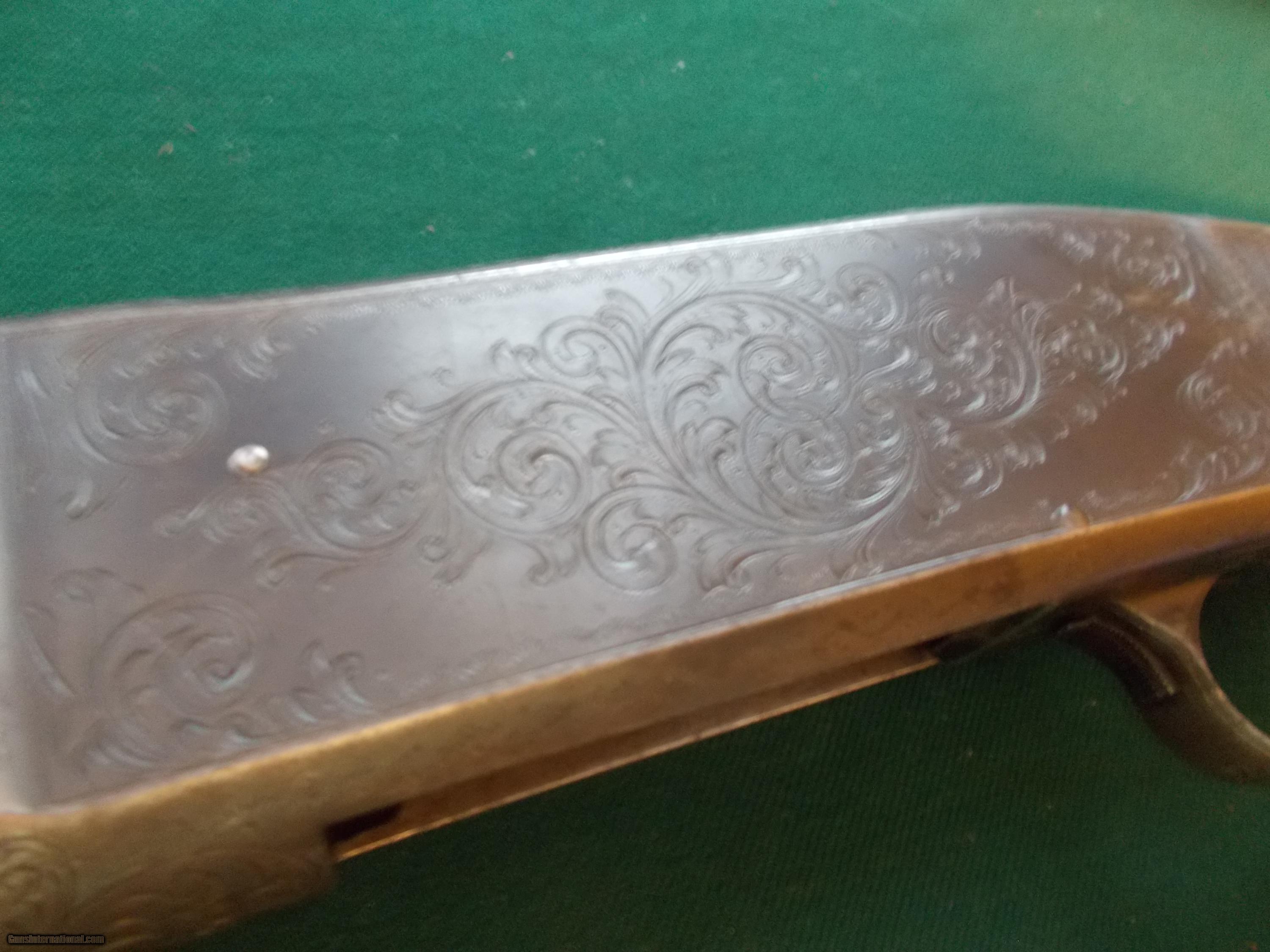Description: 30" PB, choked Full, flat checkered bbl. rib extensive elaborate scrollwork hand engraved receiver, preminum grade American walnut checkered straight stock & forearm, factory 1" vented pad, 70% OA blue, stock solid with som ehandling & scratches, ( chip blemish left of top tang (pictured) SOLD |