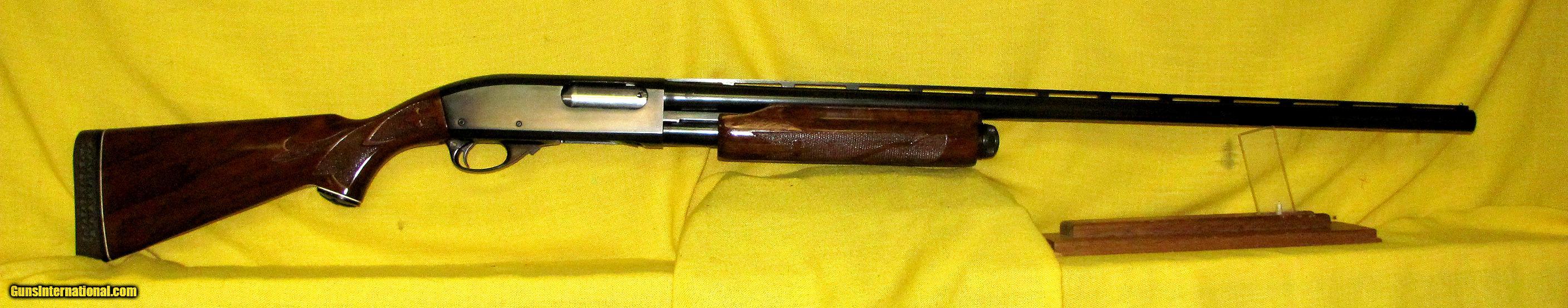 Description: REMINGTON model MAGNUM 870 WINGMASTER in 12 GA CAL., with 30" barrel. Color BLUE. REMINGTON MODEL MAGNUM 870 WINGMASTER, MIRROR BORE VENT RIB FIXED CHOKE BARREL, HANDLING MARKS ON FOREARM, STOCK EXCELLENT, 97% FACTORY BLUE ON RECEIVER AND BARREL. OUR NEW STOCK # D31531 Condition 95%+. Serial number V493141M. SOLD |
