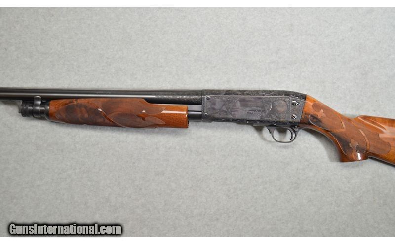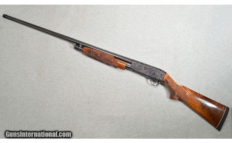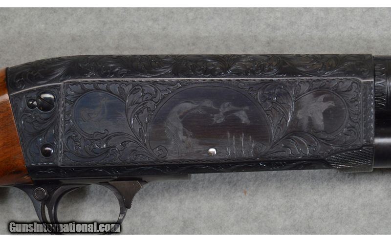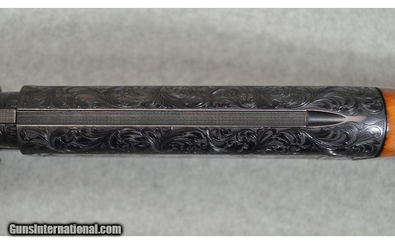 Description: Remington Rare Model 17, Engraved by Master Engraver Ken Hurst. Features beautiful game scene engraving and an upgraded stock. It features engravings by K. Hurst on the top of one of the barrels and frame. The frame has a scroll engraving around a dog and two game birds with "K. Hurst, Remington, Trade Mark, Model 17, 59624". The right side of the frame has a scroll pattern around four game birds. It has a LOP of 13 3/4". There is some wood repairs needed at the bottom of the tang near the trigger. It comes with a second barrel that does not have any engravings and shows signs of use. The right side of the frame has some slight wear on the engraving. SN: 59624 20 Gauge SOLD Metal Condition: Excellent condition with handing marks Wood Condition: Very good condition with handling marks Bore Condition: Clean and shiny Barrels: 30 Stock Dimensions: LOP 13 3/4 Fore End: Wooden with a checkered pattern Butt Pad: Rubber Weight: 6lbs 11oz Sights: Single bead Chokes: Improved Modified; Full Item Location: Fort Worth, TX |