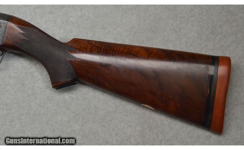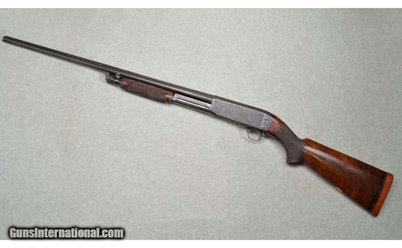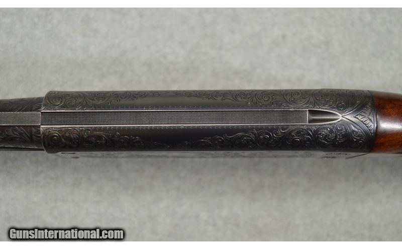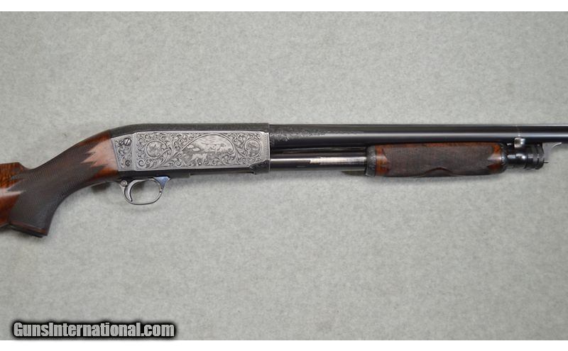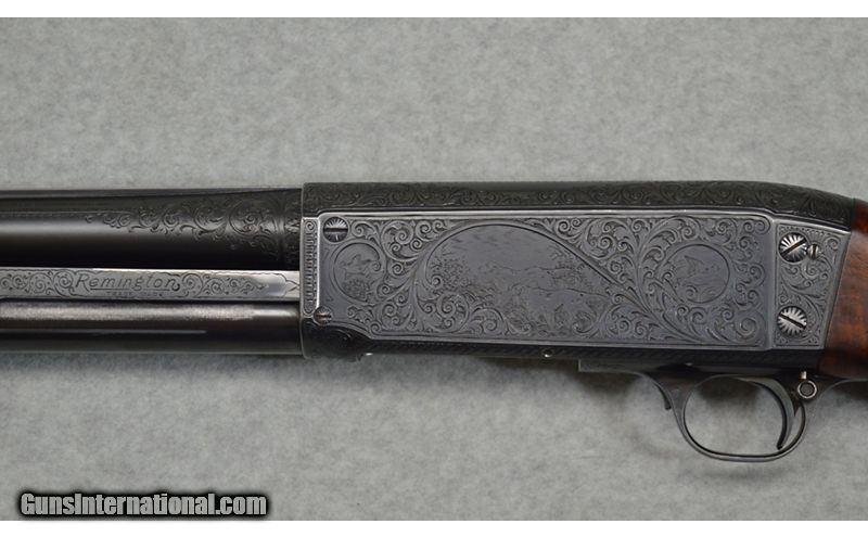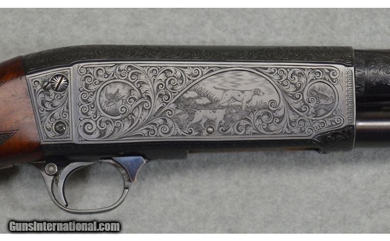 Description: Remington Model 17 F-Grade 20 gauge pump shotgun is in excellent condition. It features master engraving on the frame and top of the barrel, the left and right sides have scroll engraving wonderfully executed around two dogs and multiple game birds. The top and bottom have similar engraving with the model on the bottom and a dogs head on the trigger guard. There is a golden medallion inlaid into the bottom of the stock with the initial "J.F.W." It has handling marks on the barrel, frame, and stock. The Magazine tube has some slight bluing loss. SN: 25036 20 Gauge SOLD Metal Condition: Excellent condition with handling marks Wood Condition: Excellent condition with handling marks Bore Condition: Clean and shiny Barrels: 26 Stock Dimensions: LOP 14 Fore End: Wooden with a checkered pattern Butt Pad: Rubber Weight: 6lbs 5oz Chokes: Modified Item Location: Fort Worth, TX |