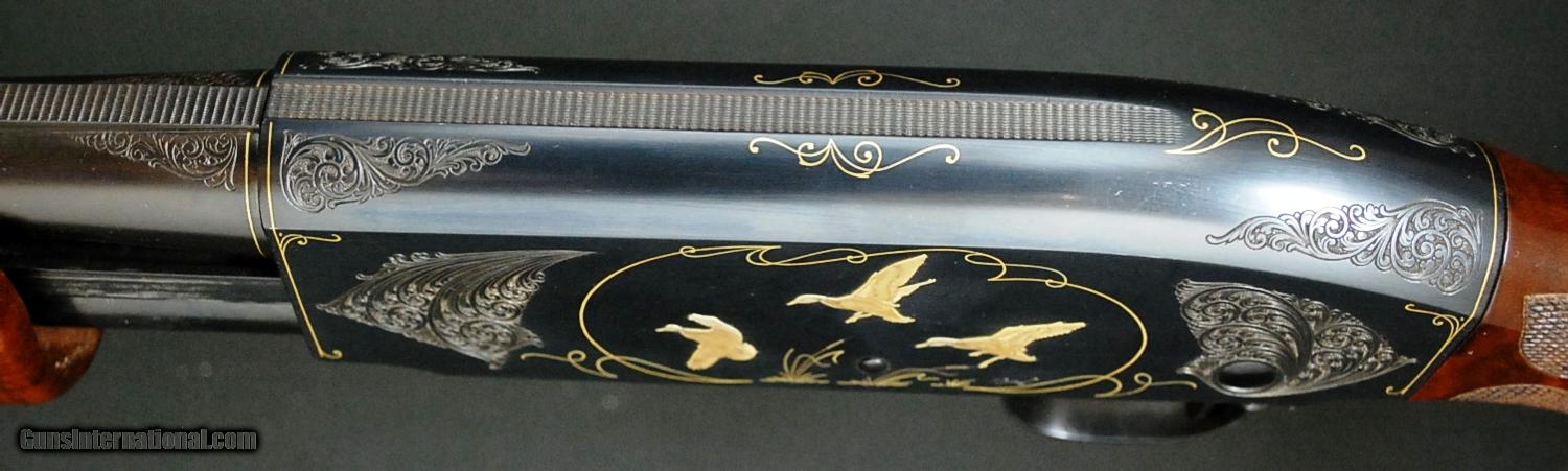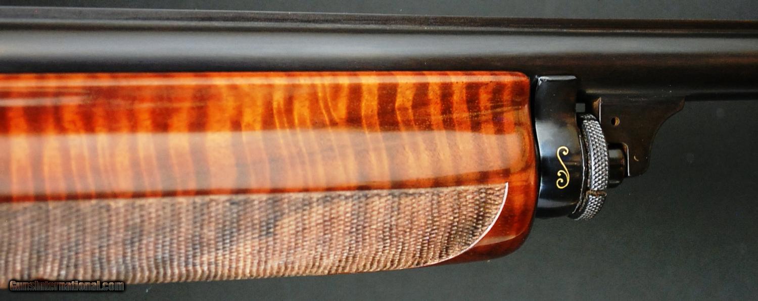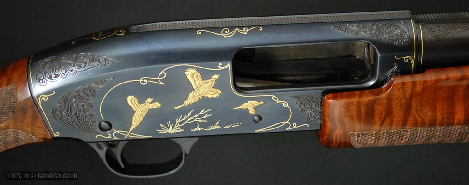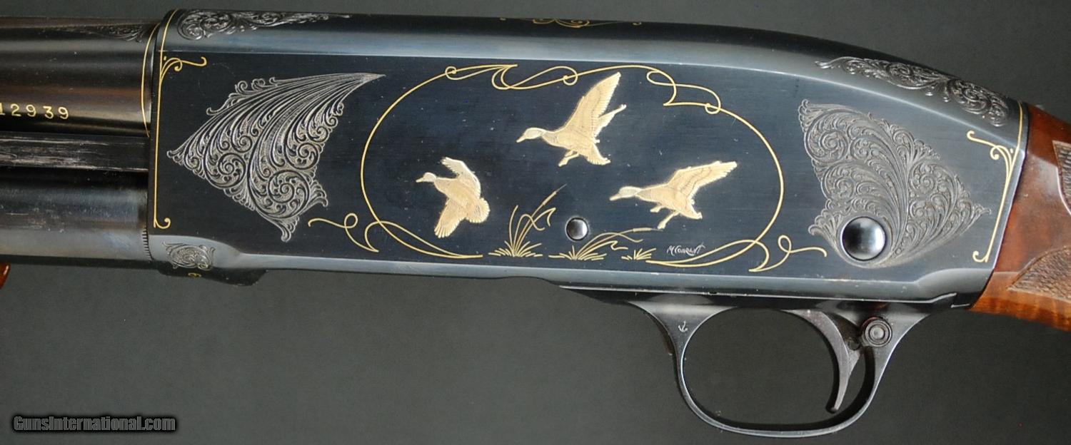 Description: REMINGTON – Model 31 Custom 20ga. 3 barrel set 26” SKEET, 28” IC, & 28” Modified, all having solid ribs, highly figured American black walnut pistol grip stock with a high gloss finish and beautiful checkering, Remington butt plate, magnificent highly detailed layered gold inlays of ducks and pheasants surrounded by gold line work and scroll by Belgian master engraver Michel Courant, high gloss finish, gun remains in pristine condition.