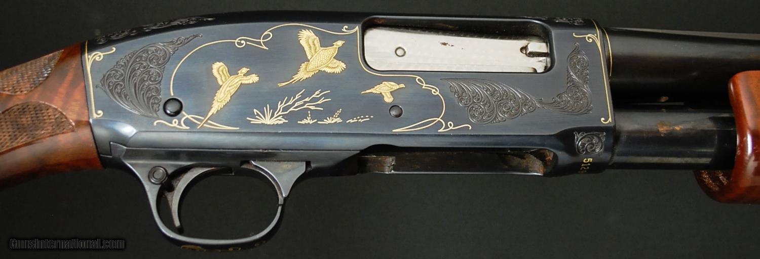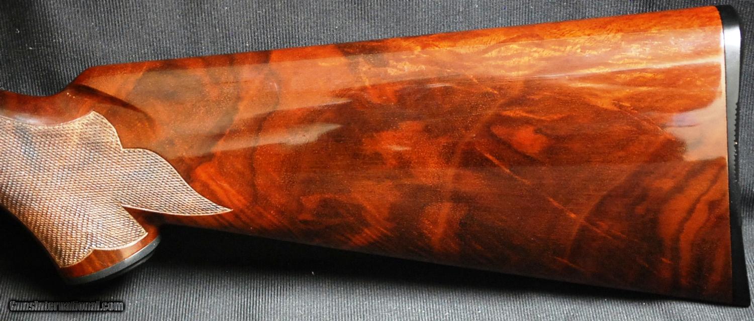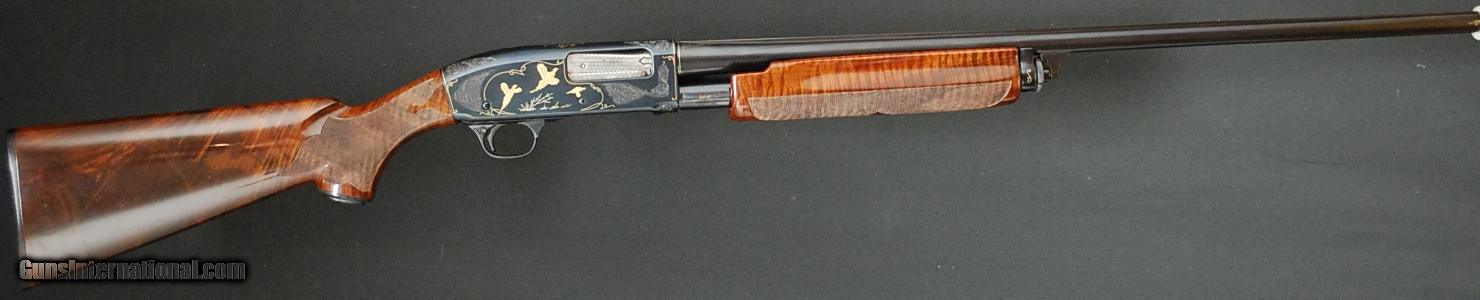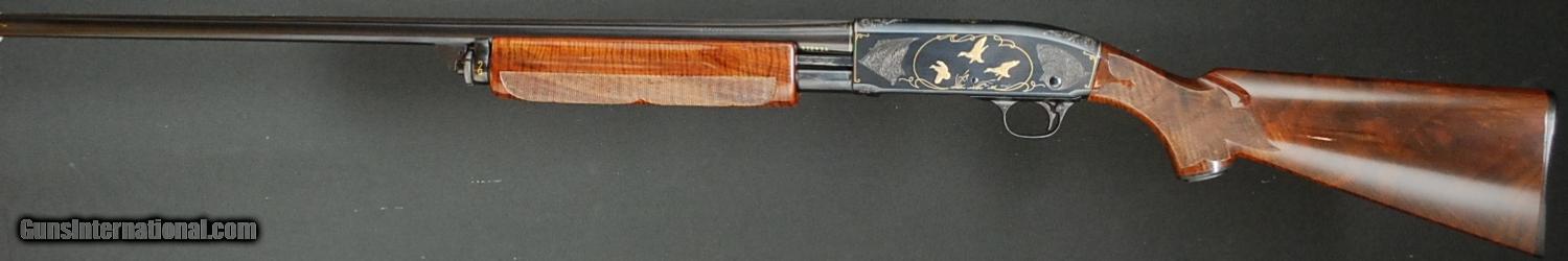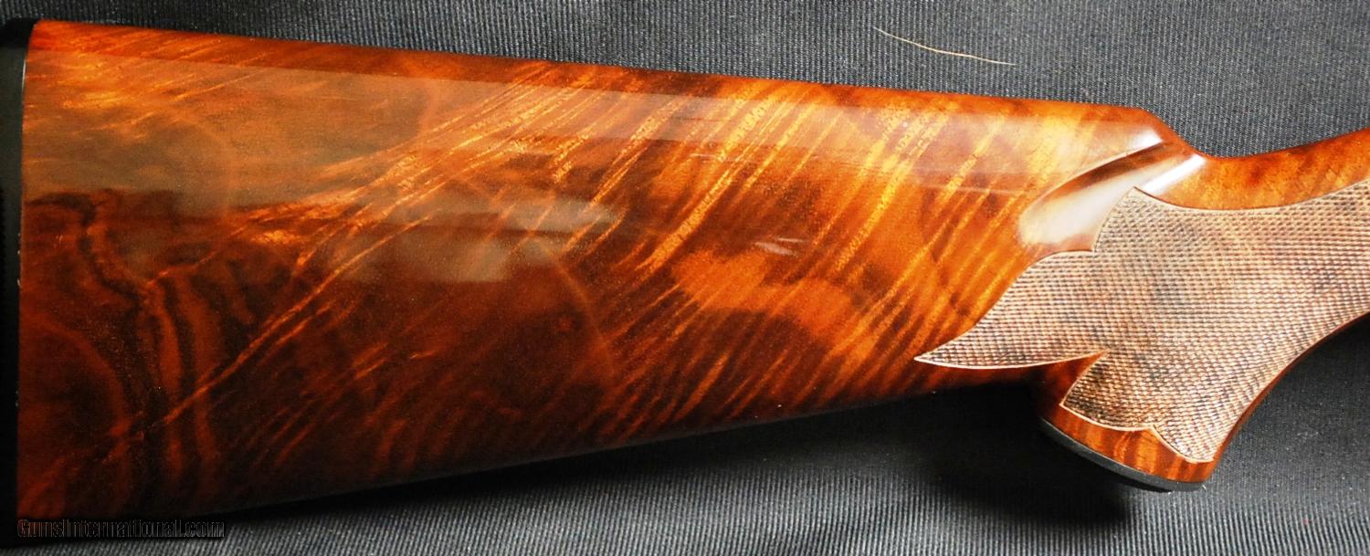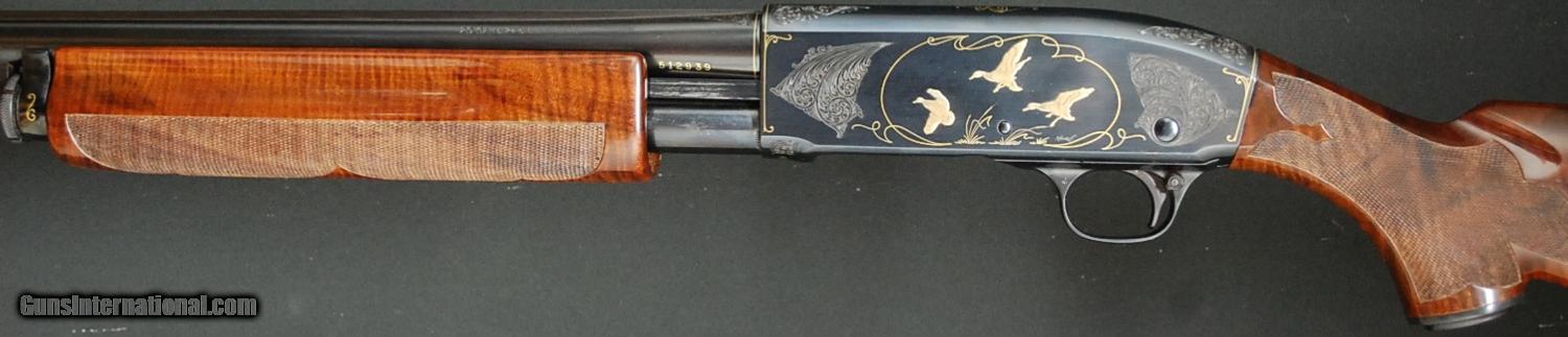 Description: REMINGTON – Model 31 Custom 20ga. 3 barrel set 26” SKEET, 28” IC, & 28” Modified, all having solid ribs, highly figured American black walnut pistol grip stock with a high gloss finish and beautiful checkering, Remington butt plate, magnificent highly detailed layered gold inlays of ducks and pheasants surrounded by gold line work and scroll by Belgian master engraver Michel Courant, high gloss finish, gun remains in pristine condition.