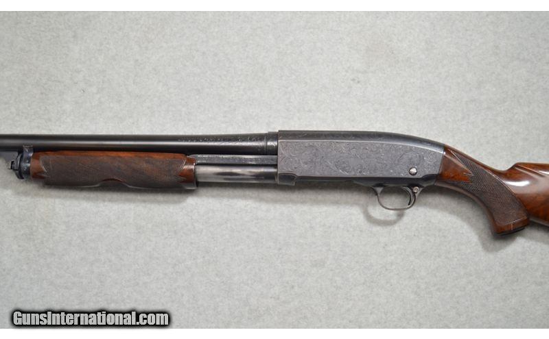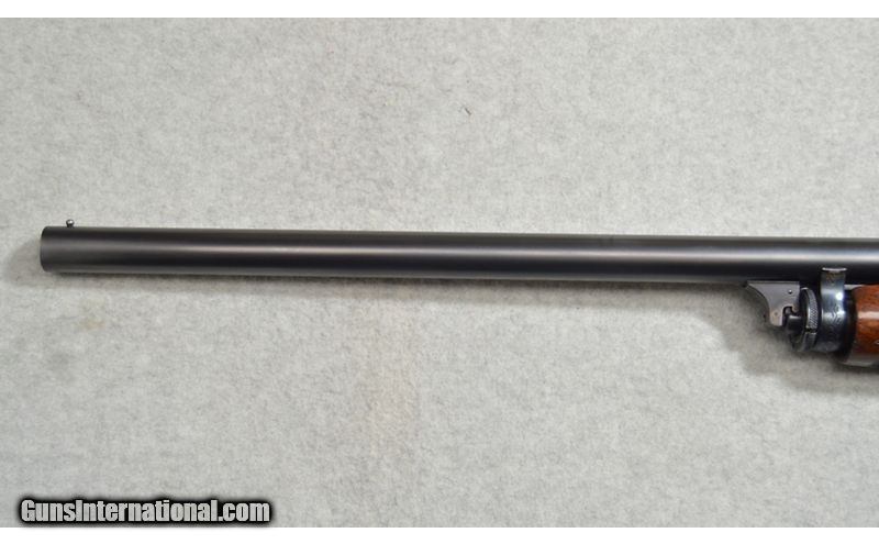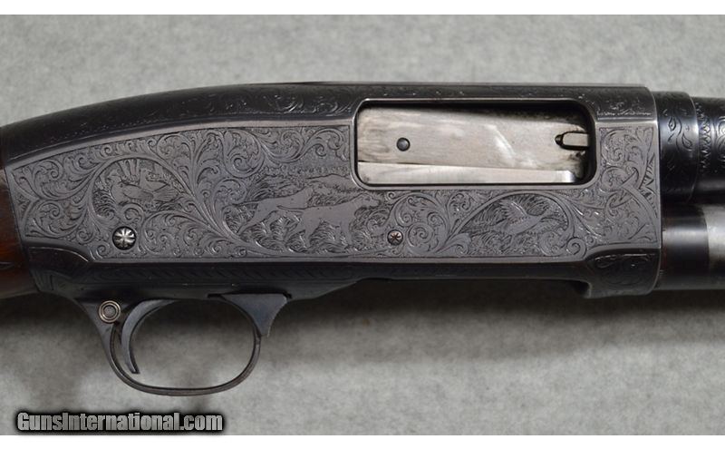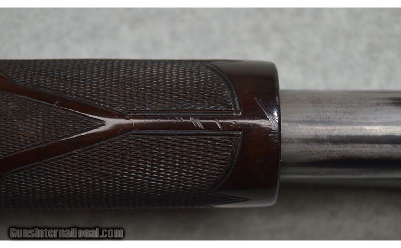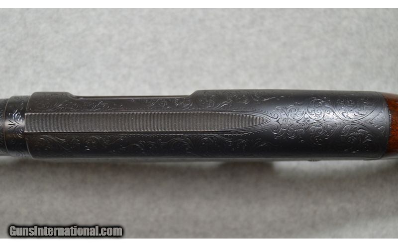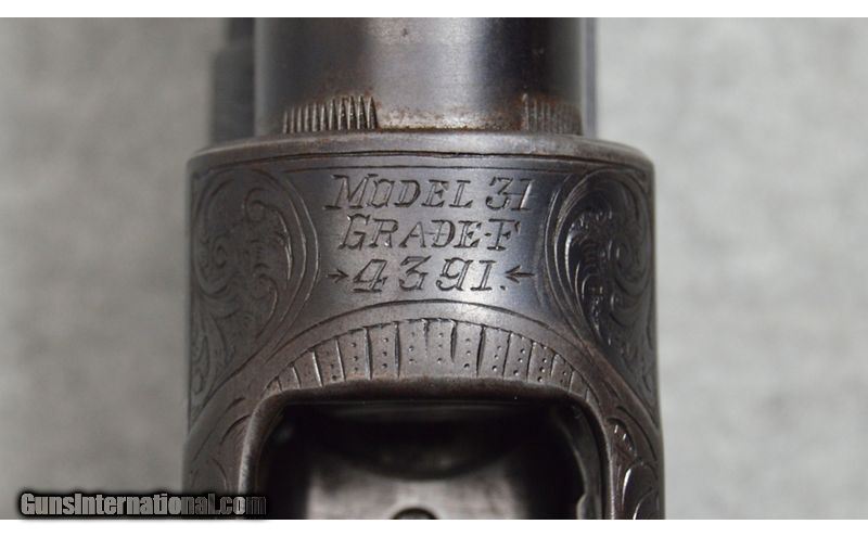 Description: Factory engraved Remington Model 31 F-Grade, 12 gauge shotgun is in very good condition. It features soft engravings on the top of the barrel and frame. The left side has a scroll engraving around two dogs and multiple game birds in a wooded scene. The right side has the same scroll engraving around two different dogs and multiple game birds in a grass scene. It has a wooden fore end and stock with a checkered pattern on the fore end and grip. The barrel, frame, and stock have handling marks. The magazine tube is retains 30% of its bluing. SN: 4391 12 Gauge SOLD Metal Condition: Very good condition Wood Condition: Good condition Bore Condition: Clean and shiny Barrels: 26 Stock Dimensions: LOP 14 1/2 Fore End: Wooden with a checkered pattern Butt Pad: Rubber Weight: 7lbs 5oz Sights: Single bead Chokes: Open Item Location: Fort Worth, TX |