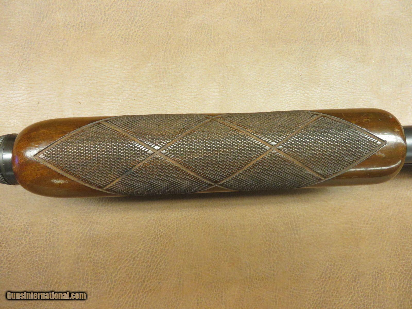 Description: 12 ga. 2 3/4 inch has 30 inch full choke barrel with matted top. Serial number 302xxxV. Silver shell lifter. Checkered walnut has 7 diamond pattern on forend with original butt plate and pistol grip cap on stock. Small chip from toe of butt plate only with no damaage to the wood. Barrel blue is 95% receiver is 90-95%. Wood finish is 85-90%. SOLD |