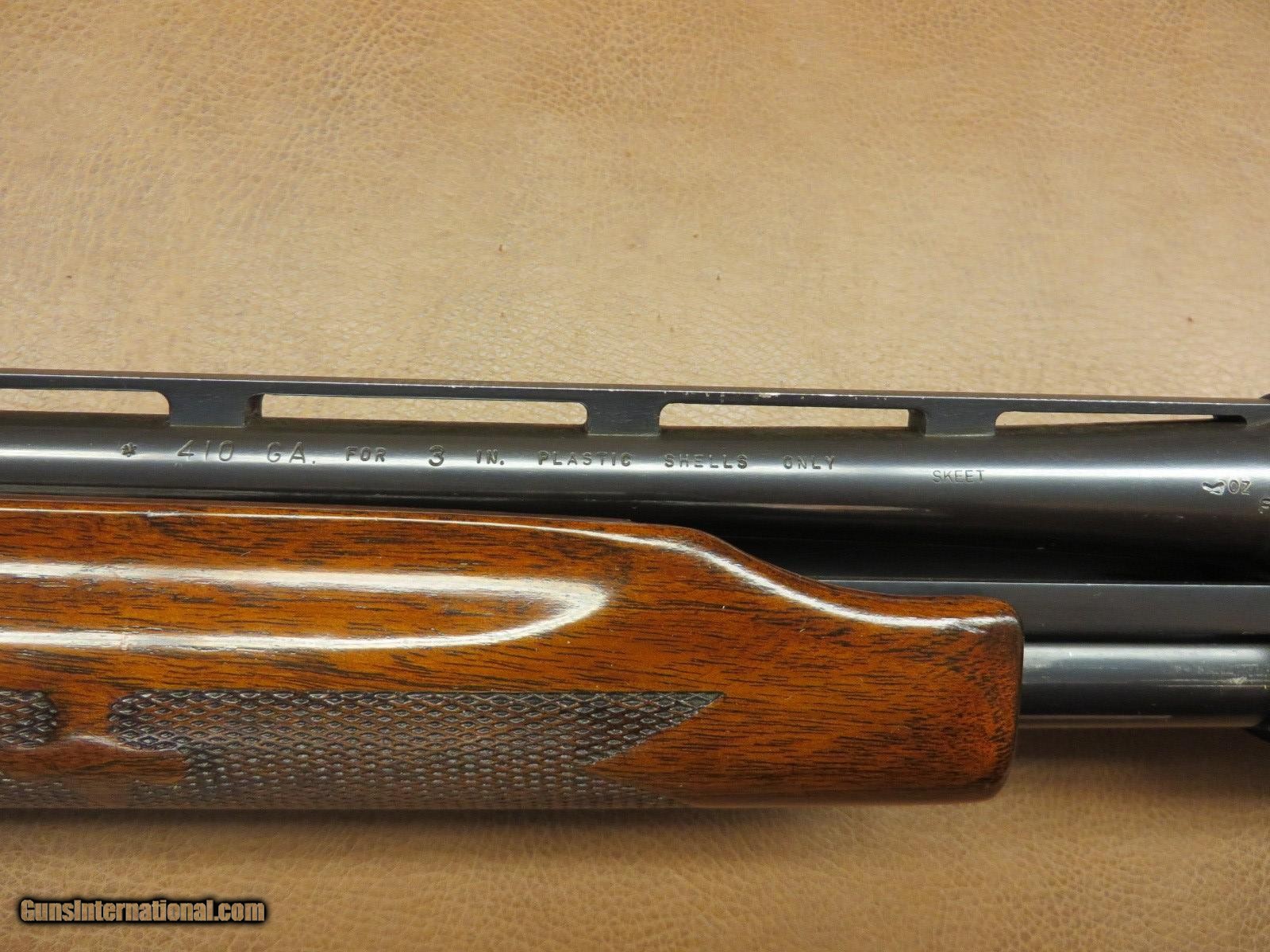 Description: 410 3 inch chamber has 25 inch skeet choke vent rib barrel. Checkered walnut has pistol grip cap and Pachmayr recoil pad with 14 inch length of pull. Silver shell lifter. All in 95% condition. SOLD |