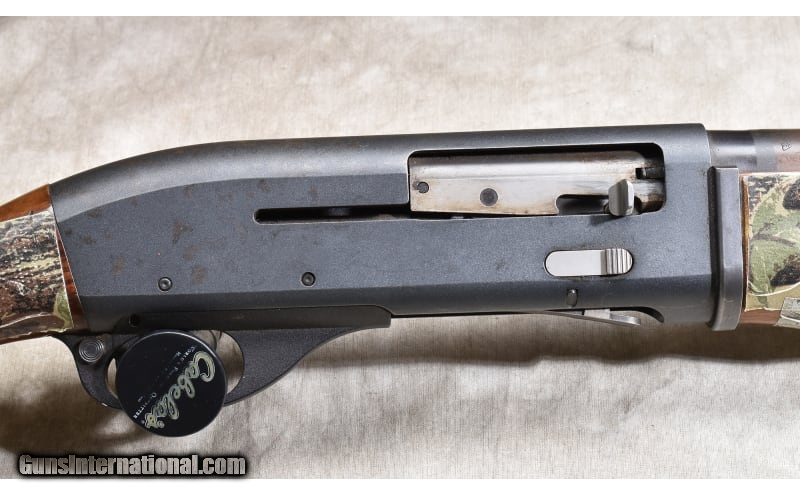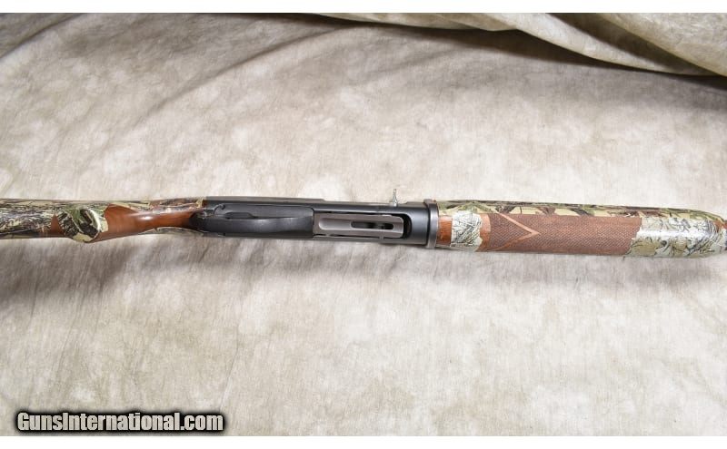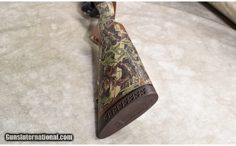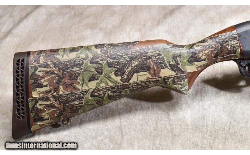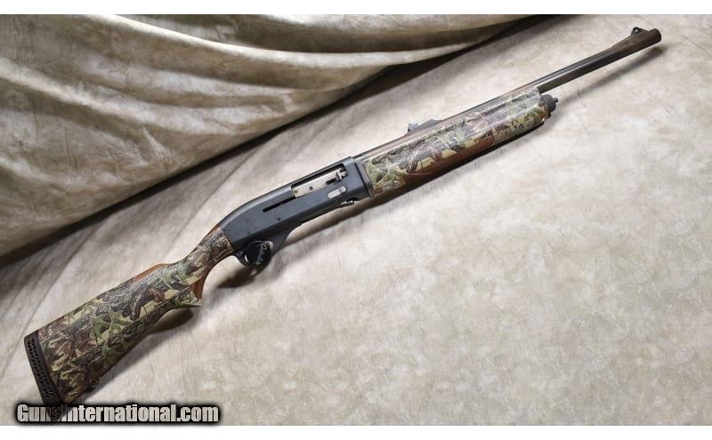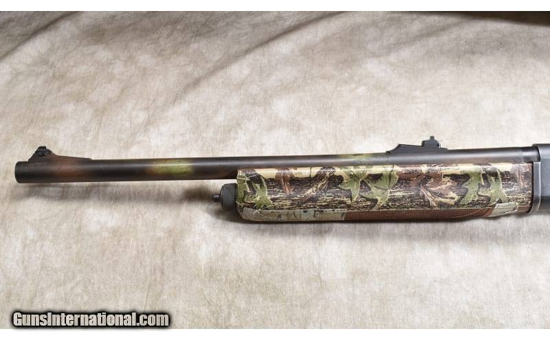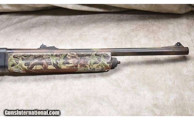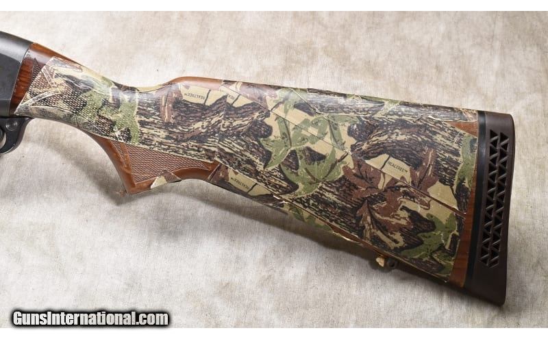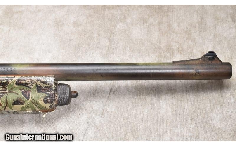 Description: It is hard to say whether this was set up for deer/turkeys or duck/geese. It is used but appears to have a lot of shooting left in it. It features camo cover over the walnut, rifle sights, and handy short barrel. 10 Gauge SOLD Chambers: "3 rounds, 10 gauge, 3-1/2 inch only Metal Condition: Good. There a number of 'rub' marks on the barrel which exhibit what appears to be thin surface rust. Wood Condition: Good. RealTree camouflage tape over checkered walnut. Bore Condition: A little dark but shiny. Barrels: 22 inch smoothbore Triggers: Factory trigger Stock Dimensions: 14-inch LOP Fore End: Beavertail Butt Pad: Ventilated rubber pad Weight: 10 lb - 1 oz Sights: Bead and notch "rifle-like" sights Chokes: Screw-in Full choke Item Location: Rogers |