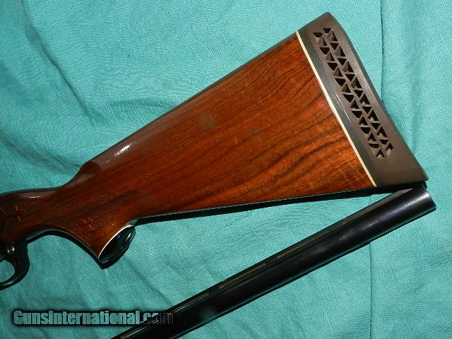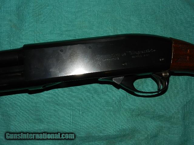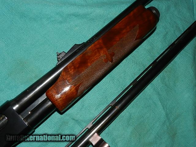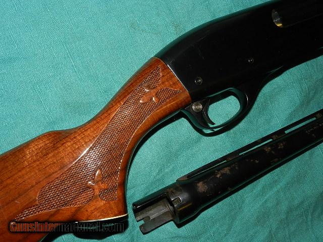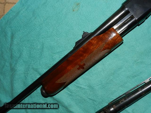Description: A clean Remington Wingmaster pump shotgun is 20ga and chambered for the 2 3/4" shell. The 20" barrel is a smooth bore for sabot slugs and has adjustable rear sight and front ramp sight, and has a choke of wide open CYL. The spare vent rib barrel is 28" long and has some spots of recent corrosion nearer the breech from handling and not wiping the metal before storing the gun bu has all it's blue and a front bead sight also.The choke on the 28" barrel is MOD. The American walnut checkered wood with the Remington Fleur-di-Leah patten is very good. The LOP with a brown rubber recoil pad is about 14 3/8". This gun has a bout all it's blue with a couple field dings and possibly a shallow scratch. We don’t have asite .I prefer money orders or a check. Item ships when funds come in. If you can only pay with a card let me know. I hope you like my wide selection of unusual guns, knives and gun parts. Shipping price determined by zip code. I try to keep the prices affordable, which means I make less money than most dealers. You won’t get altitude sickness with my prices! I consistently have the best selection of older guns If you BUY IT NOW you must still contact us for details buy it now doesn't end the sale, it just sends an email telling us you want to buy this gun. A phone call won’t secure a sale! Not home many times, the first buyer by email buys the gun !Thissite doesnot close down a sale when you do a BUY IT NOW like Ebay!I can get six buy it nows in an hour, first buyer to email gets the guns, others are in second place! Best to send another email . Sometimes not home to get calls. Some guns are required shipment to a gun dealer near you for a transfer to you when it arrives. With the widest selection of older guns at great prices, We don’t have a store, and sell on the internet only. SOLD |