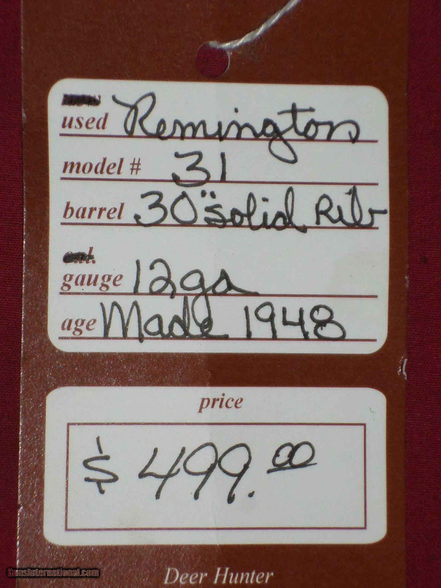 Description: SOLD For sale, Remington Model 31, 12 ga. Solid Rib 30" Full. Very good to exellent condition. Circa 1948 SOLD To see more of our inventory, visit deerhunterguns,com We collect 7% sales tax for Florida sales. We accept MC, Visa and Discover, no AmEx. No Sales to California. Like us on Facebook: Deer Hunter Guns SOLD |