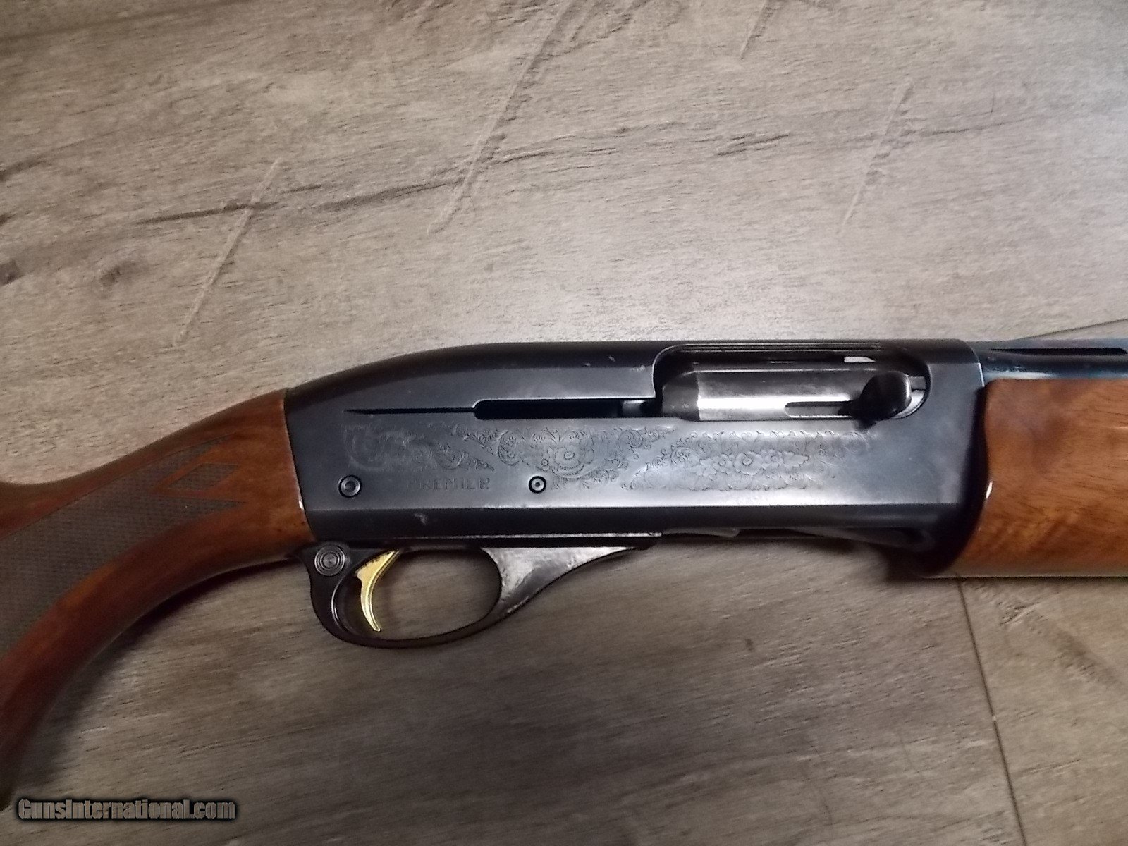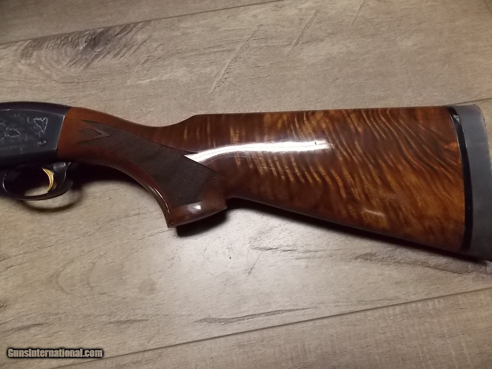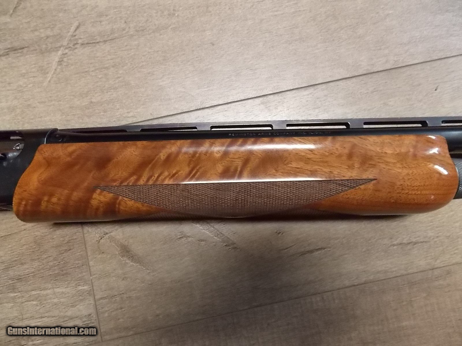 Description: Remington 11-87 Premier grade 12 gauge shotgun. 30" remchoke barrel with 3" chamber, and modified, and improved cyl tubes. Barrel has white bead front, and center bead. Metal shows slight flaking on receiver. Wood is high grade custom shop laminated walnut. They take high grade wood, split stock, and laminate prior to machining and then finish with high polish gloss finish. Gun shows little mechanical wear. Extra barrel (pictured) has been sold SOLD Shotgun Gauge: 12 Gauge Manufacturer: Remington Model: 11-87 Premier Barrel Length: 30/21 Chambers: 3 Condition: good Metal Condition: good Wood Condition: excellent Bore Condition: good Chokes: remchoke |
