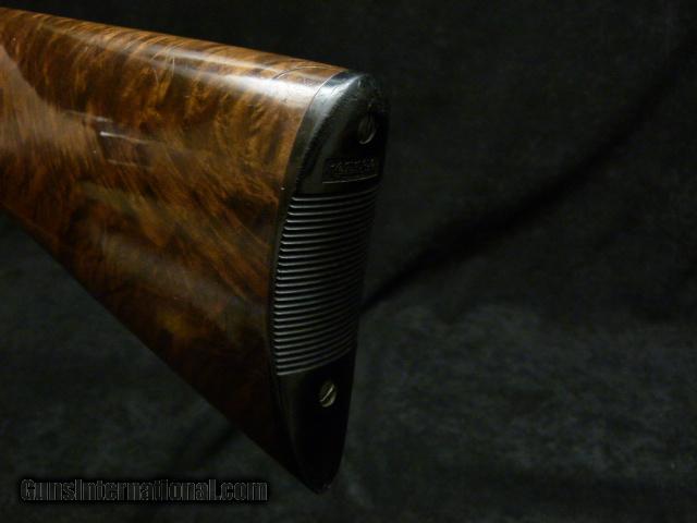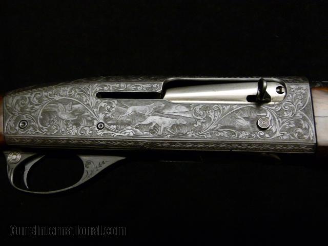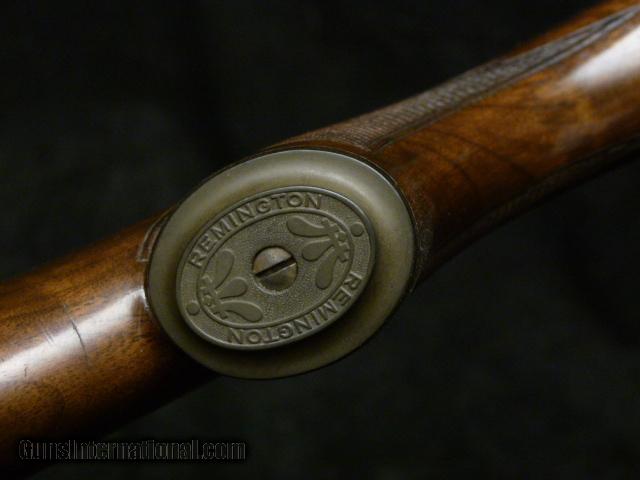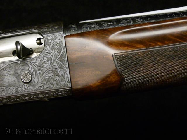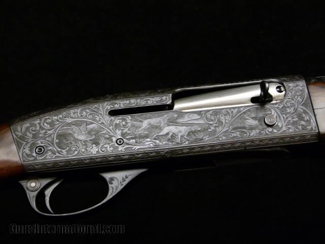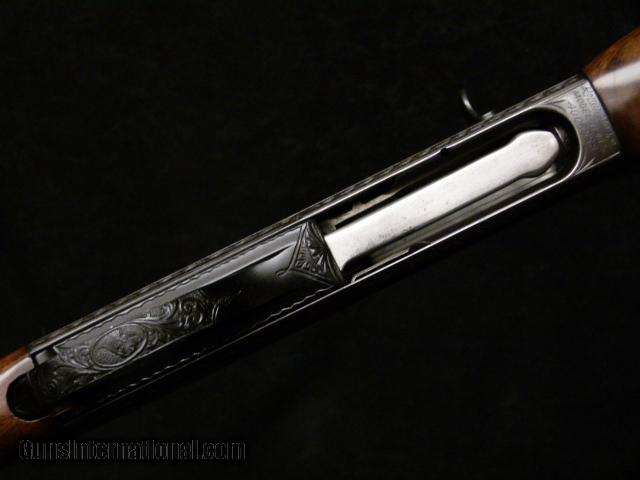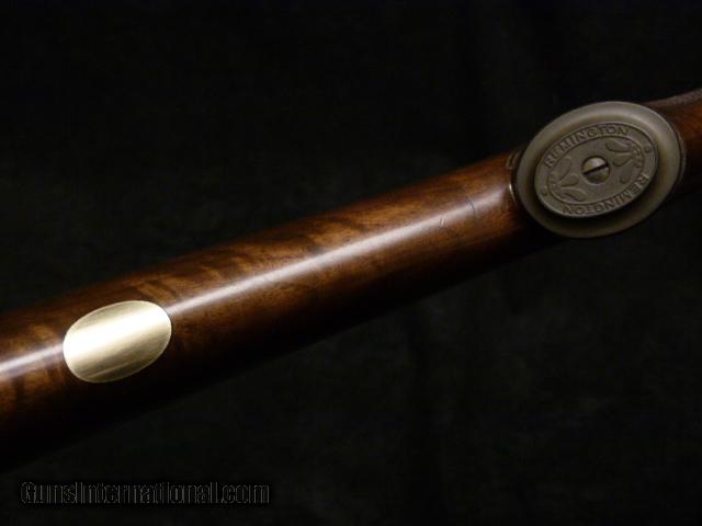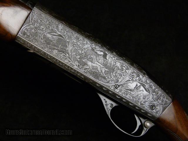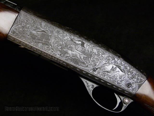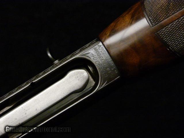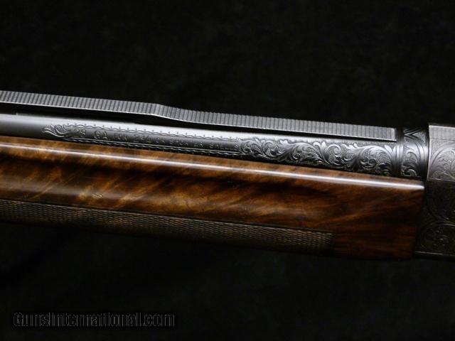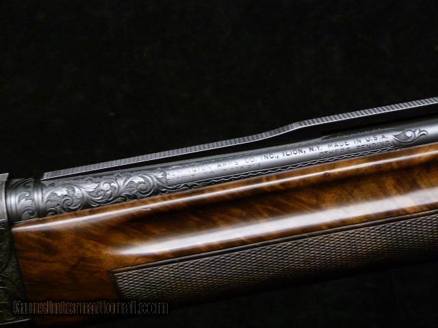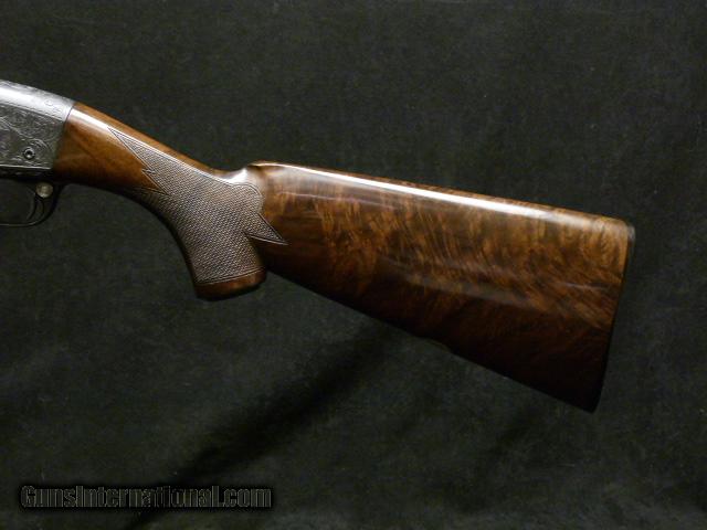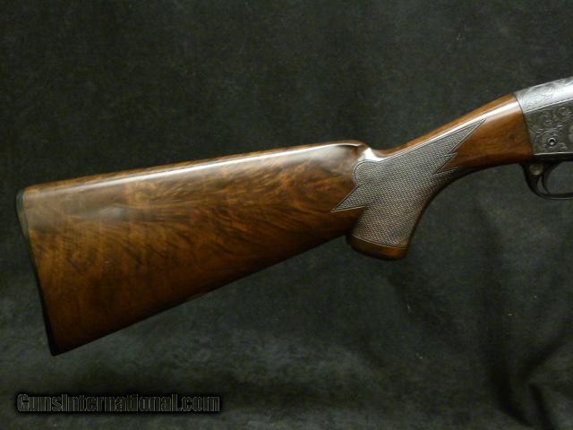 Description: Remington 11-48 SF Premier Grade Skeet 28ga, serial number 4006xxx with a date code "P" and "ZZ" which I believe is June of 1953 (the 11-48 was avaialble in 28ga starting in 1952). Gun has a 26" VR barrel marked "Skeet" on the bottom of the barrel by the date codes, white bead at the muzzle and small brass bead in center of rib. Highly figured walnut stock w/ hand checkered pistol grip and forend in complex "custom shop" pattern. Pistol grip is capped w/ the "high grade" grip cap of the era and has a hard rubber serrated "Remington" marked butt and a blank gold oval. The receiver is blue w/ very high quality factory engraving of full coverage scroll and game scene vignettes. A brace of setters and flushing quail and pheasant on left side, ducks, snipe and a brace of pointers on the ejection port side, trigger guard has the bust of a setter in the center of the bow. Manufacture, model and serial number are all engraved (not stamped or roll marked) in front of loading gate, there is no signature by an engraver that I can find. An old small crack on the right rear of the forearm is the only detrimental thing to say about the gun (can be seen in the photos) as the gun is in very high original condition. This gun retains 99% of the original blue and varnish, cycles flawlessly, and has a perfect bore. It is a lively 6 lbs 6 oz. w/ a 14" LOP and 1 1/2" x 2 9/16" dimensions. An excellent example of a rare and desirable little gun. SOLD |
