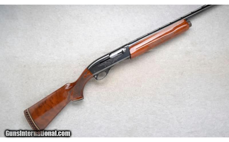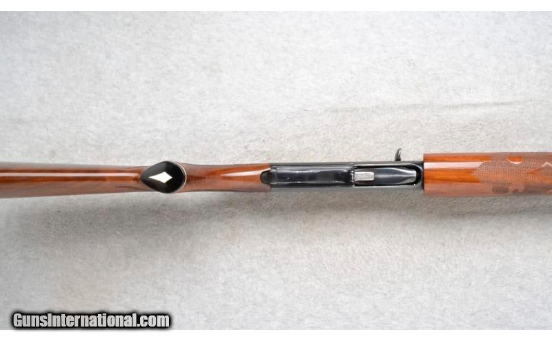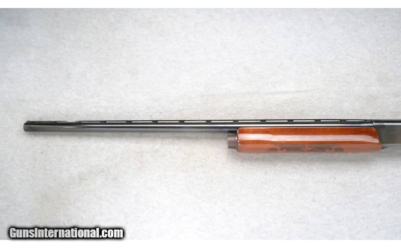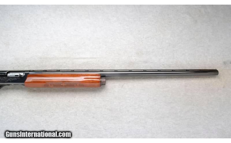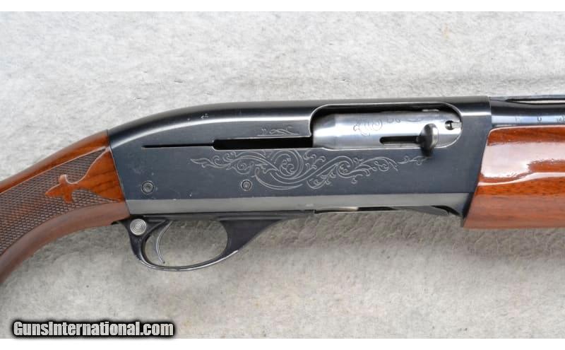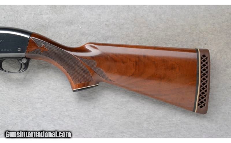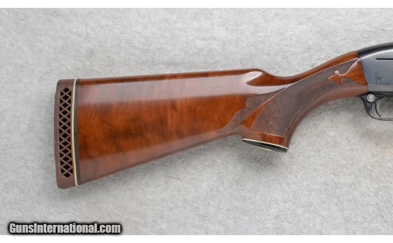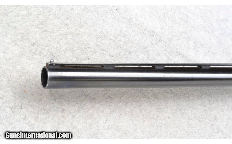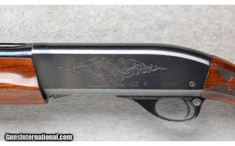 Description: This Remington Model 1100 is a right hand semi-auto shotgun in 12 Ga. It has a 30 inch ventilated rib barrel with a metal bead front sight. With a 2 3/4 inch chamber it has a fixed full choke. The butt stock is a checkered grip walnut pistol grip with a black cap. The forearm is a checkered grip walnut with finger grooves. The receiver is lightly engraved. 12 Gauge SOLD Chambers: 2 3/4 inch. Metal Condition: Has a lot of minor handling/use marks. Wood Condition: Good. Some minor use marks. Bore Condition: Shiny. Barrels: 30 inch barrel with a ventilated rib. Stock Dimensions: LOP 13 3/4 inches. Fore End: Checkered grip walnut with finger grooves. Butt Pad: Pachmayr White Line rubber recoil pad. Weight: 8 lb. 2 oz. Sights: Metal front bead. Chokes: Fixed full Item Location: Richfield, WI |