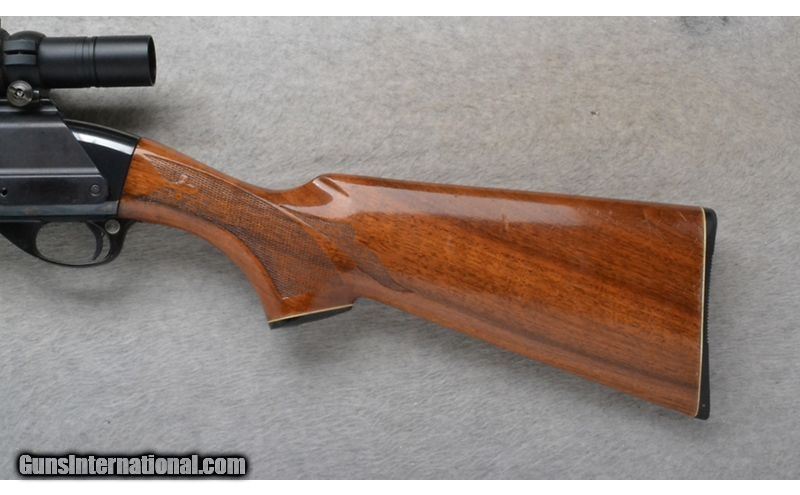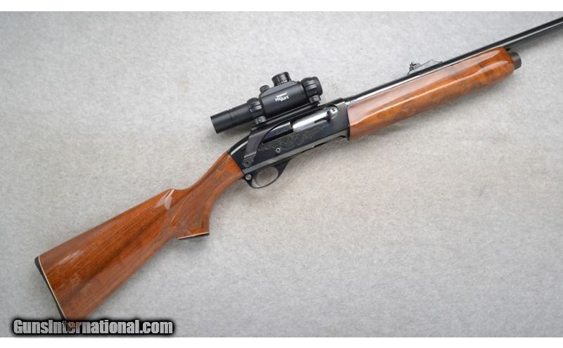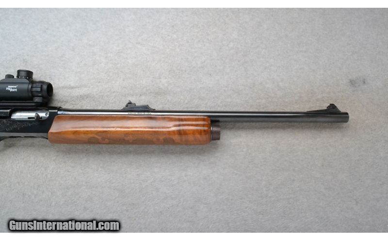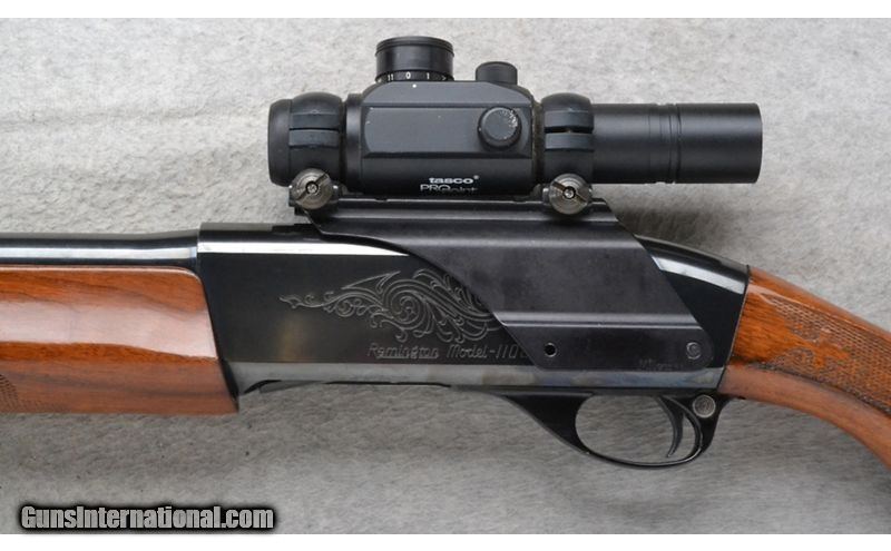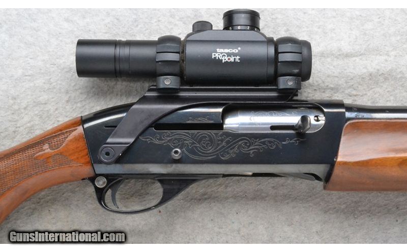 Description: This Remington Model 1100 is a right hand semi-auto shotgun in 12 Ga. It comes with a 22 inch and a 30 inch barrel. Both barrels have a 2 3/4 inch chamber. The butt stock is a checkered grip walnut pistol grip. The forearm is a checkered grip walnut with finger grooves. The receiver is lightly engraved. 12 Gauge SOLD Chambers: 2 3/4 inch both barrels. Metal Condition: Very Good. Some minor handling/use marks. Wood Condition: Fair. Many light handling marks. Bore Condition: Very Good. Barrels: 22 inch and 30 inch. Stock Dimensions: LOP 14 inches. Fore End: Checkered grip walnut with finger grooves. Butt Pad: Remington grooved black plate. Weight: 8 lb. 2 oz. Sights: 22 inch has a raised blade front and an adjustable notch middle. 30 inch has a ventilated rib with a metal front bead sight. reciever has a Tasco Pro point red dot sight. Chokes: 22 inch is CYL. 30 inch is Full. Item Location: Richfield, WI |
