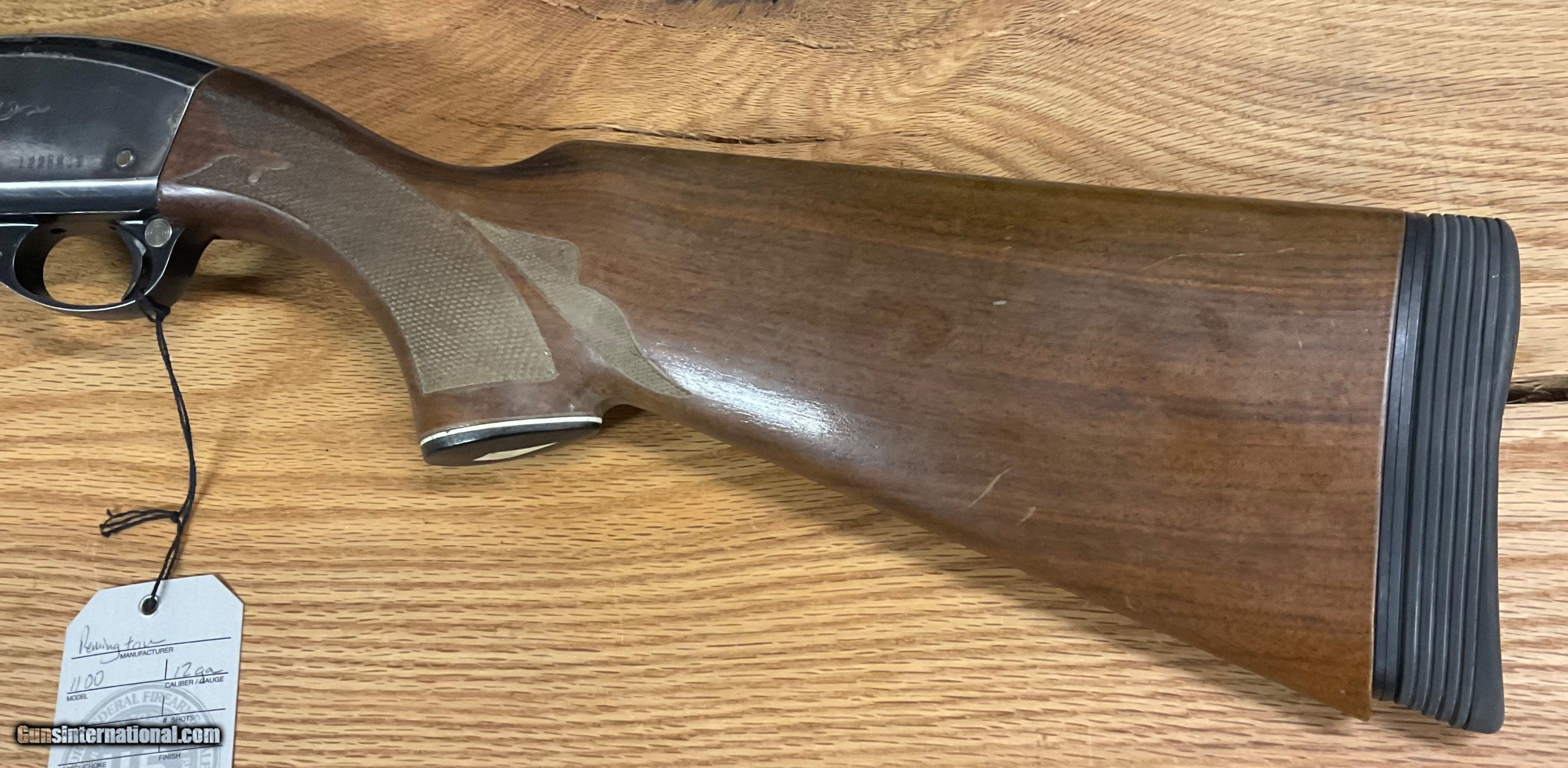 Description: This Remington 1100 12 gauge semi-auto has wear, scuffs and scratches on the bluing and woods. Please see all photos for cosmetic details. Buyer is responsible for a 35 dollar shipping charge. SOLD Shotgun Gauge: 12 Gauge Manufacturer: Remington Model: 1100 Serial Number: 122561V Barrel Length: 28” |