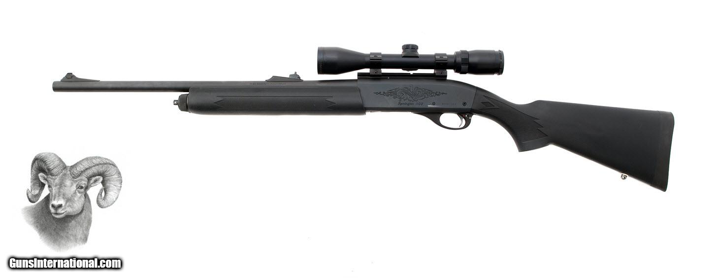 Description: Remington - 1100 - 20 ga - Item Number: REMR206110K Shotgun type: Semi-Auto Action: Semi-Auto Ejectors: Yes Trigger: Single Grip: Pistol Grip Forend: Checkered Lop: 13 7/8 " Pad thickness: 1 " Type of butt: Factory Drop comb: 1 1/4 " Drop heel: 2 " Cast amount: 0 " Cast: Weight: 8 lbs, 6 oz Manufactured in: USA Manufacture Year: Finish: Black Overall condition: Very Good Stock condition: Very Good Metal condition: Very Good Stock: Original finish Metal: Original finish Type of Case: none Extra barrels: 0 Barrel info: Gauge: 20 ga Chamber: 2 3/4 " Length: 20 " Chokes: Cyl Comments : Some light handling marks, Bushnell scope, rifled barrel. R-305 SOLD |