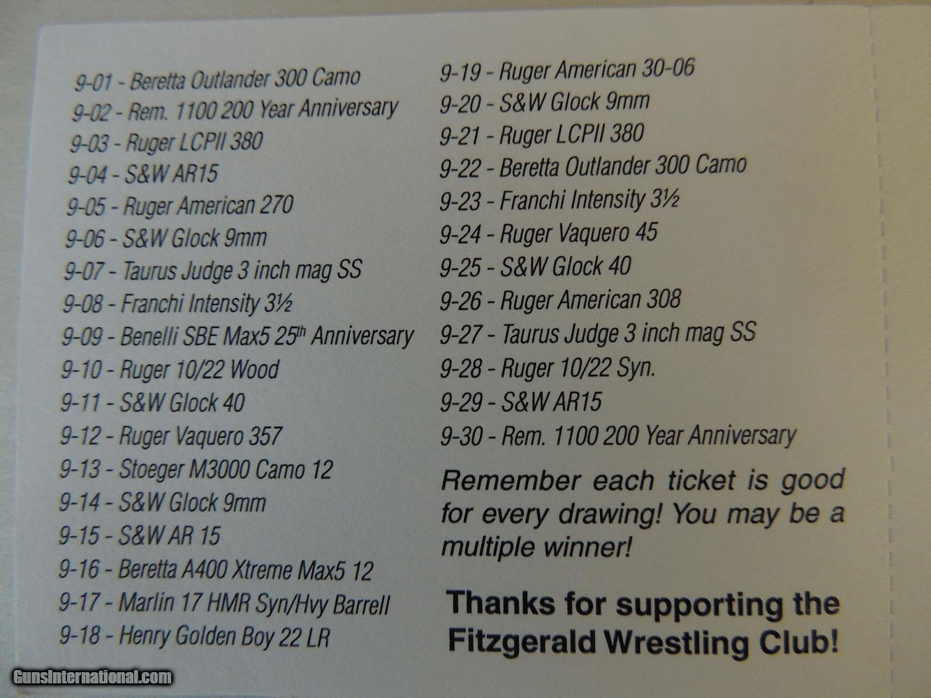 Description: CHARITY GUN RAFFLE 30 GUN RAFFLE IN 30 DAYS ( ALL ITEMS LISTED ON CALENDAR PICTURE), ALL PROCEEDS BENEFIT THE FITZGERALD,GA WRESTLING CLUB TICKETS $50.00, 30 GUNS WILL BE RAFFLED OFF IN THE MONTH OF SEPTEMBER 2017, EACH TICKET HAS THE CHANCE FOR EACH NIGHTLY DRAWNING, THE WINNING NUMBERS WILL BE THE GEORGIA CASH 3 NIGHTLY NUMBERS, WINNERS DO NOT NEED TO BE PRESENT TO WIN, WE WILL CONTACT YOU. FIREARMS ARE NEW FROM DISTRIBUTOR PLEASE BE GENEROUS AND SUPPORT THESE BOYS ANY QUESTIONS PLEASE EMAIL OR CALL THANKS MIKE BISHOP LLC PO BOX 1429 FITZGERALD, GA 31750 ******* MAKE FUNDS PAYABLE TO THE FITZGERALD WRESTLING CLUB (PAYMENT OPTIONS) (Postal Money Order) (Cashiers Checks) (Personal Checks) (Credit Cards: Visa or Master Cards) (BEST PHONE/TEXT 229-424-8450) (Winning Ticket holders will get free shipping to the FFL of your choice ) SOLD |