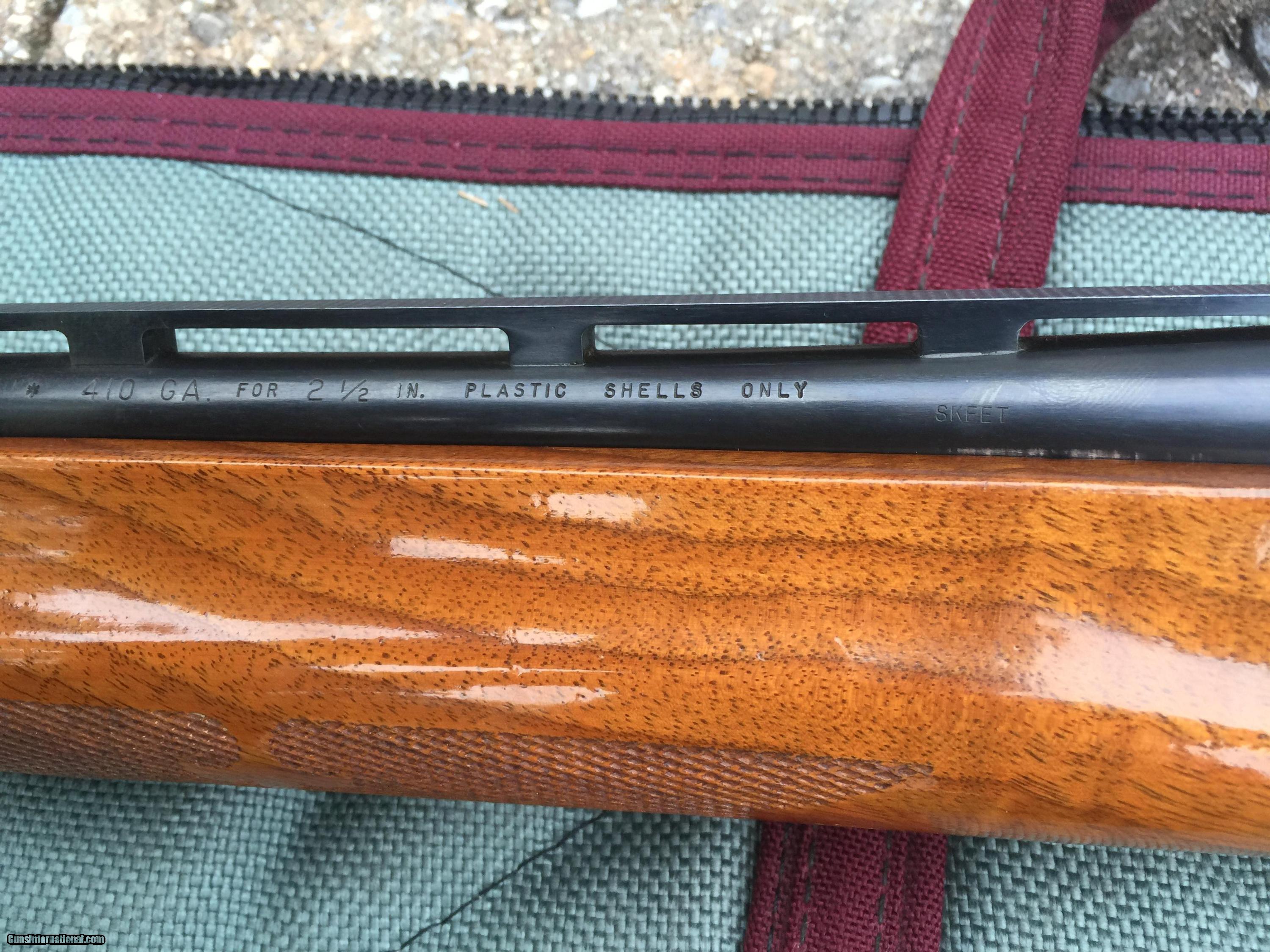 Description: SOLD PENDING FUNDS--Here's a pair of small bore 1100 Remingtons in 28 gauge and 410 bore that will please the buyer. Both guns are 100% original and in excellent shape.The 410 is a 2 1/2 inch chambered gun and has B grade wood on it. Your choice $795, plus $25 shipping or $1550 for the pair shipped to your dealer--lower 48. SOLD |