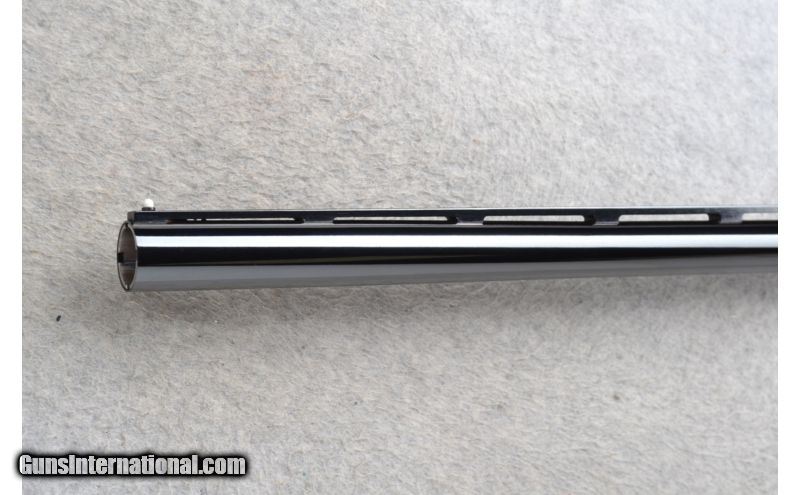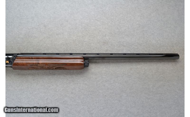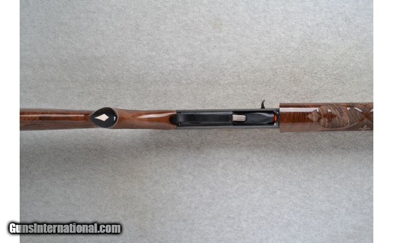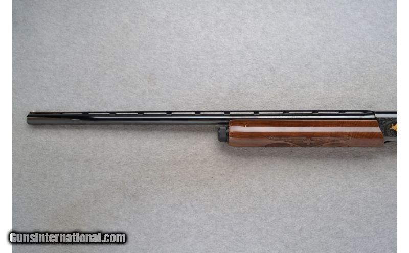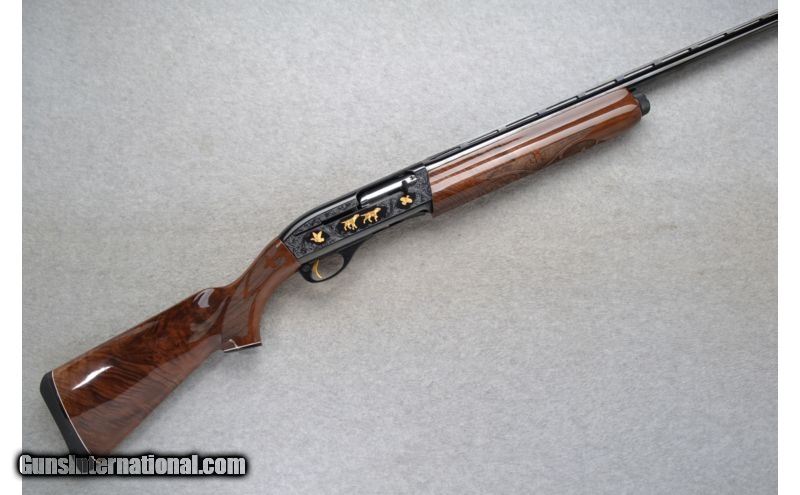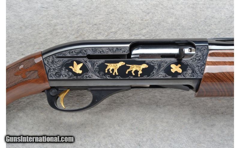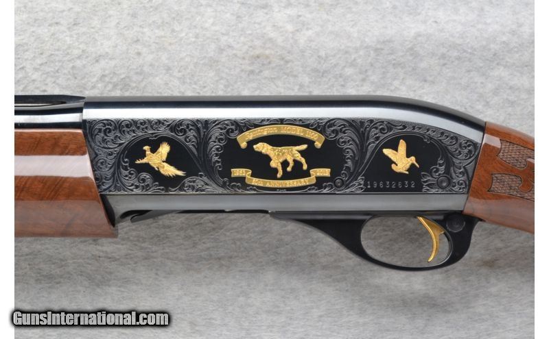 Description: This Remington Model 1100 is a right hand semi-auto 12 Ga. 50th Anniversary shotgun. It has a 28 inch Target Contour barrel with a ventilated rib. A white bead front sight and metal middle bead. The stock is a checkered high gloss walnut pistol grip. The receiver is nicely engraved and has gold pheasant, hunting dogs, snipe, duck and quail inlays. The is a gold banner with Remington Model 1100 50th Anniversary 1963 - 2013. This shotgun is in excellent condition. SOLD Caliber Info: 12 Ga. Chambers: Semi-Auto 2 3/4 inch. Metal Condition: Excellent. Wood Condition: Excellent with a couple of minor handling marks. Bore Condition: Bright and shiny. Barrels: 28 inch blued Target Contour with a ventilated rib. Triggers: Golden. Stock: Checkered high gloss walnut pistol grip with a black cap. Stock Dimensions: LOP 14 1/8 inches. Fore End: Checkered high gloss walnut with light finger grooves. Butt Pad: Remington black rubber recoil pad. Weight: 8 lbs. 1 oz. Sights: White bead front. Metal middle bead. Chokes: Tubes. Comes with 3 - F, M & Imp Cyl. Extras: Comes in a Remington hard case with Owners Manual, gun lock, 3 choke tubes and a choke wrench. Item Location: Richfield, WI |