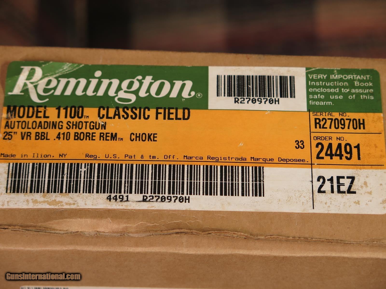 Description: Remington 1100 Classic Field 410. 25 inch vent rib barrel. 3 screw in choke tubes. F, M, IC. 99% excellent condition in original box with manual. SOLD Shotgun Gauge: .410 Gauge |