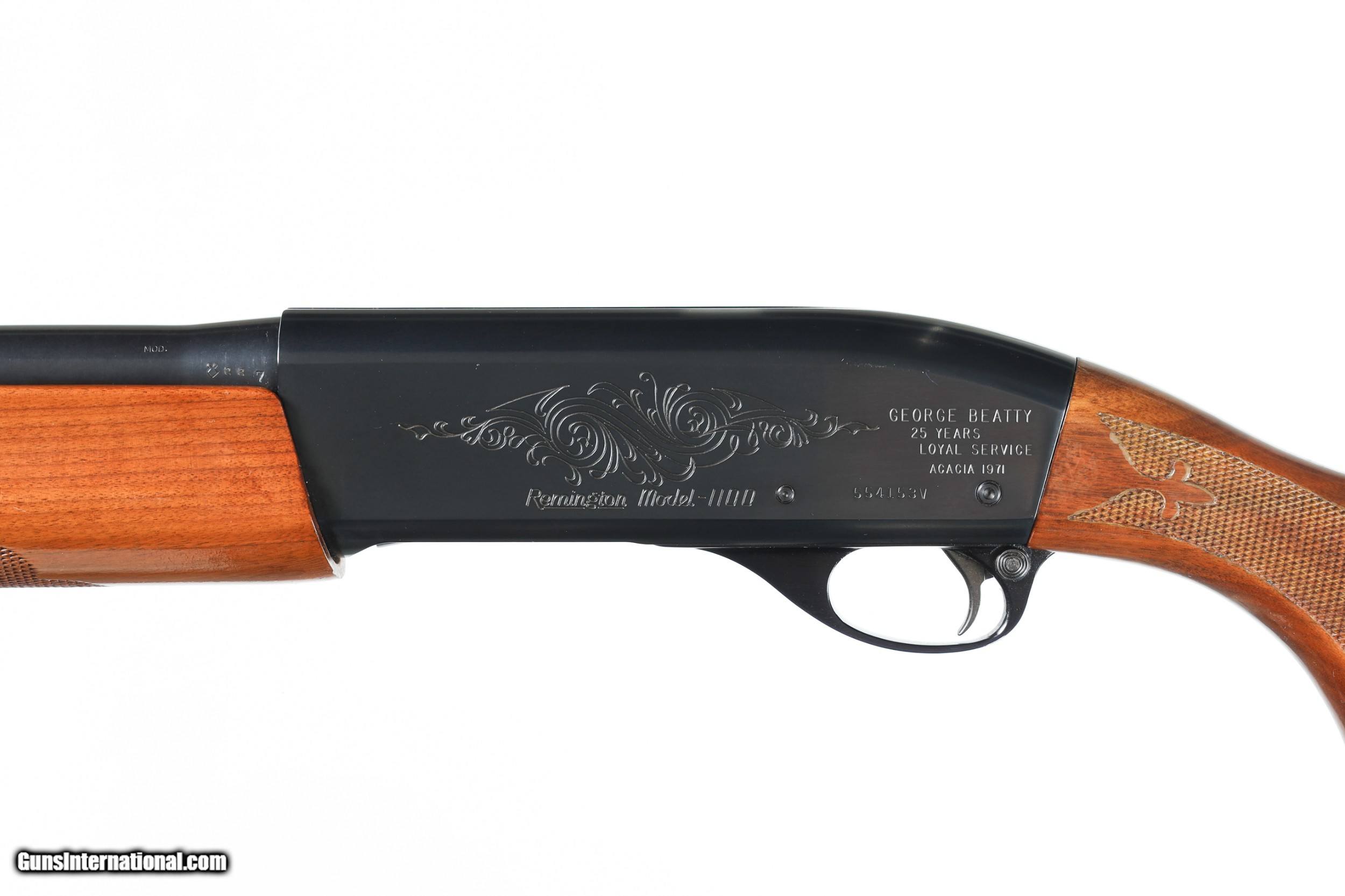 Description: Excellent overall condition, appears unfired. Custom engraved George Beatty 25 Years Loyal Service 1971. • Free Shipping, No Credit Card Fees. • Lay-a-way available for this firearm. • 1/3 Down, a 1/3 in 30 Days 1/3 in 60 Days. SOLD Manufacturer: Remington Model: 1100 Field Serial Number: 554153V Barrel Length: 28 |