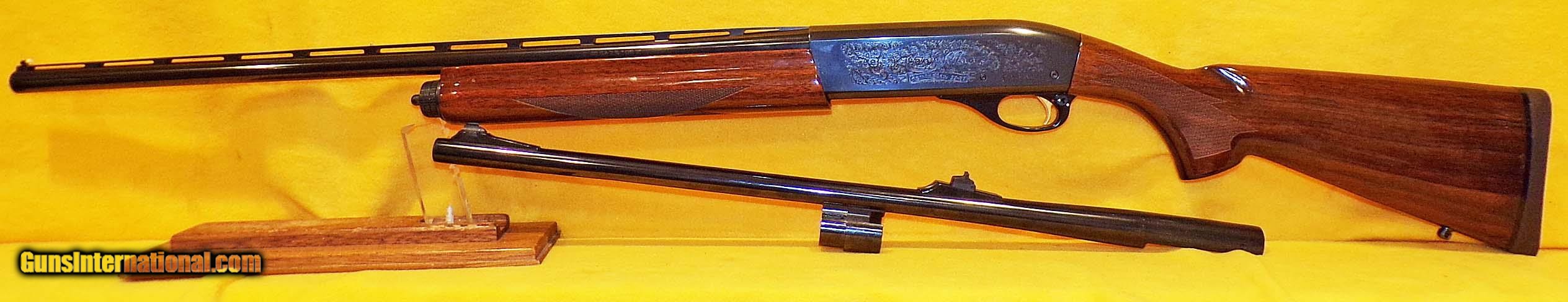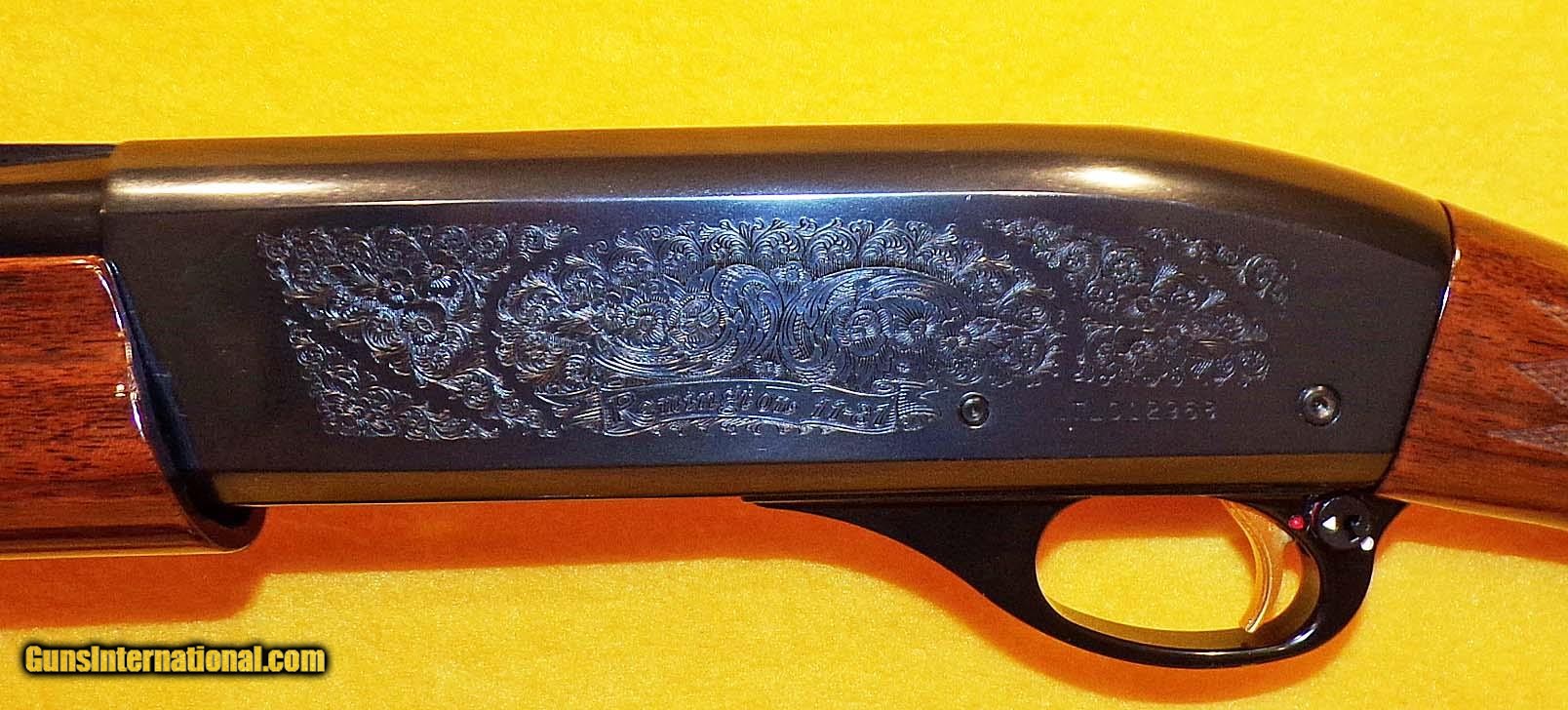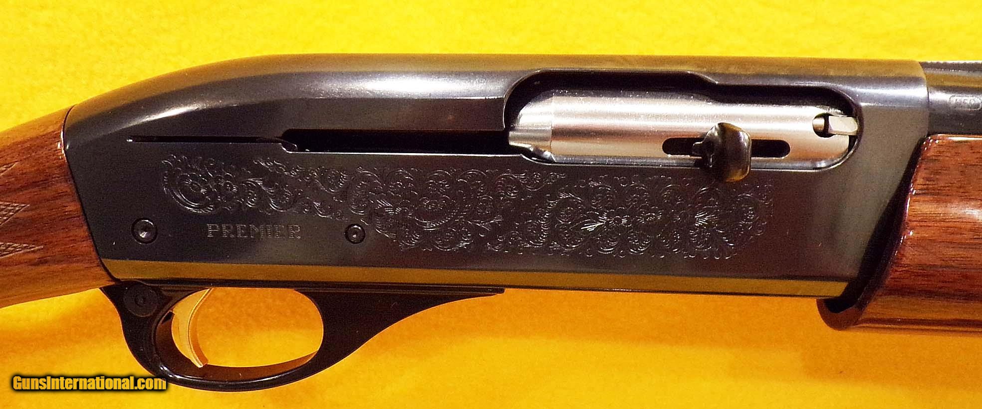Description: REMINGTON 1187 PREMIER IN 20 GA CAL., WITH 26" AND 21 BARREL. COLOR BLUE. CONDITION 98%+ LIKE NEW. SERIAL NUMBER TLO12968. REMINGTON MODEL 1187 PREMIER IN TWENTY GAUGE CALIBER, COMES WITH TWO BARRELS THE FIRST BEING A 26” SINGLE BEAD VENT RIB WITH SCREW IN MODIFIED CHOKE AND THE SECOND IS A 21” RIFLED BORE WITH FRONT BLADE AND ADJUSTABLE REAR SIGHT, NICELY ENGRAVED RECEIVER WITH CHECKERED FORE ARM AND STOCK, BELIEVE THIS TO BE UNFIRED, 98%+ LIKE NEW OVERALL CONDITION, OUR STOCK # D1829 SOLD |