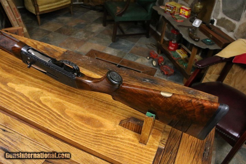 Description: Remington Model 48 Sportman F Grade Premier 20 Gauge Remington Custom shop engraved by Robert Runge. Serial number is 3815192. This fine Premier grade Remington Shotgun features extensive and highly detailed scroll and game scene engraving by Remington's Master Engraver Robert Runge. His initials RR, are found on the left receiver beneath the pair of English Pointer dogs. Condition is excellent with nearly all of the factory finishes remaining. The XXX fancy walnut stock and fore end are very attractive with sharp original checkering. The serial number and model are hand engraved on the bottom the receiver. The vent rib barrel is 28 inches long and choked full. Length of pull is 14 1/2 inches from the trigger over the Decelorator pad. This is one of the very best Remington Premier Grade 20 gauge shotguns that you will find. It's factory Runge engraved and absolutly stunning in its detail and beauty. Go to ironmenarms . c o m for additional photos SOLD Curio/Relic: Yes |