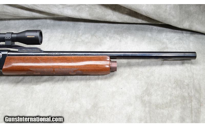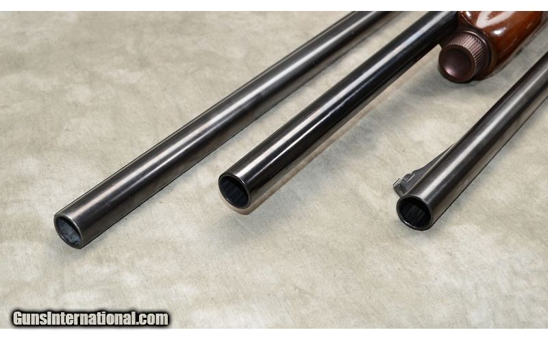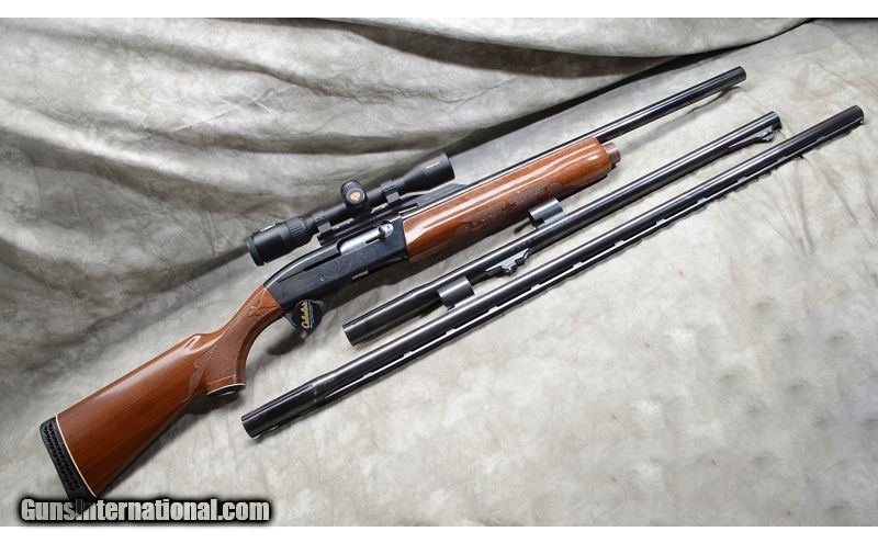 Description: Features include three barrels, walnut stock and forearm, receiver is the Magnum length so the barrels can control the shell length up to 3 inch. 12 Gauge SOLD Chambers: 4+1 capacity (unplugged) Metal Condition: Good to very good. Wood Condition: Good to very good. Bore Condition: All are shiny and bright. Barrels: "21"" rifled with open sights, 21"" rifled cantilever with scope, 30"" ""bird"" barrel. Triggers: Factory trigger. Stock Dimensions: 14 inch LOP. Fore End: Walnut beavertail. Butt Pad: Ventilated rubber pad. Weight: 9 lb 1 oz with cant bbl and sc Sights: "Bead and notch ""rifle""sights, cantilever bbl with Nikon Prostaff slug scope. Chokes: Fixed Full bird barrel Item Location: Rogers |