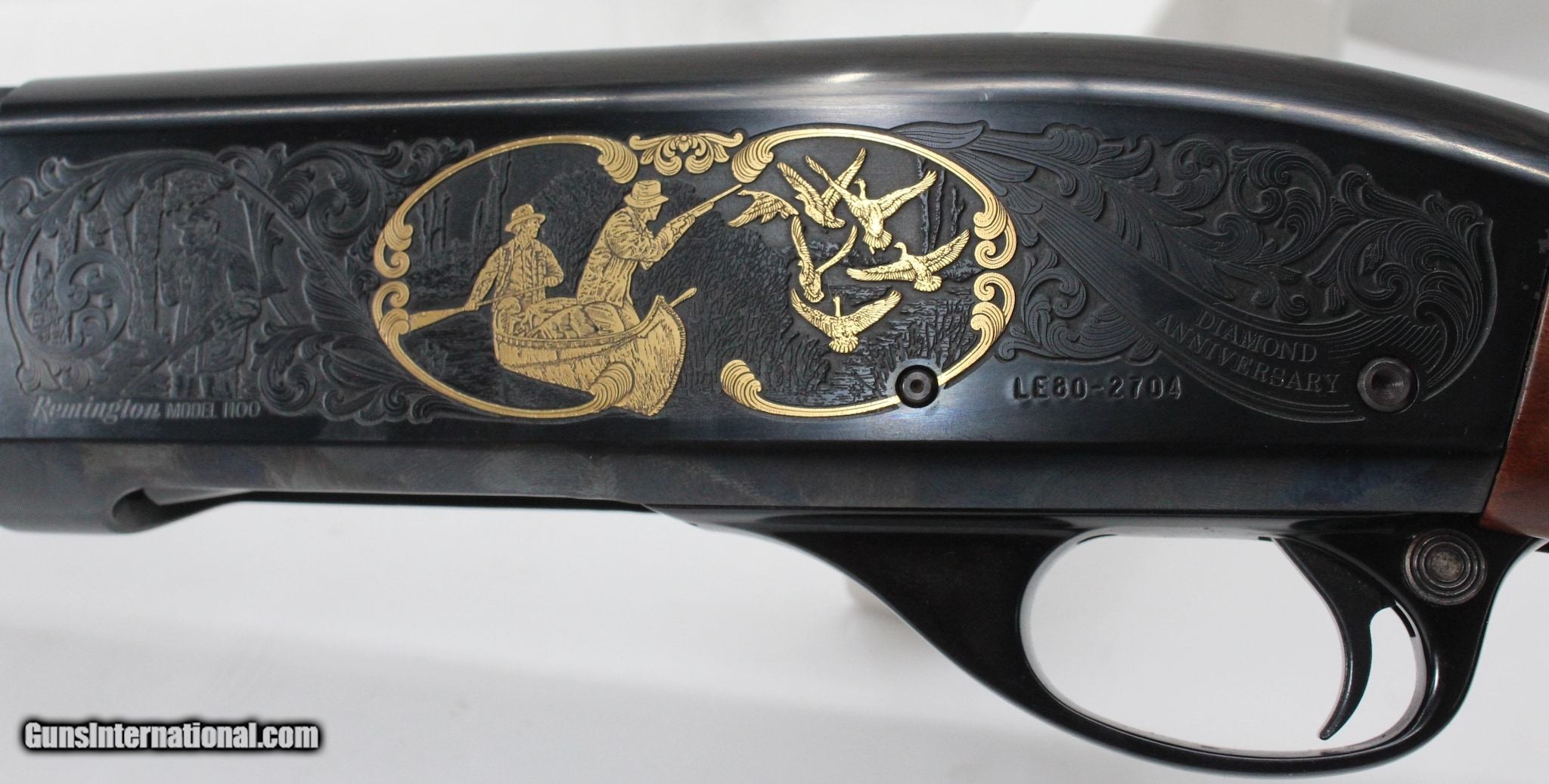 Description: Guns Listing ID: 523475 MODEL 1100 \"1 OF 3,000\" FIELD 12 ga. only, limited edition, serial numbered 1-3,000, deluxe walnut, gold washed etched hunting scenes on receiver, 28 in. modified VR barrel. Mfg. 1980 only. Very beautiful firearm in very good condition. It does have some very light pitting starting on the barrel and the top of the receiver. It is to light to show up in photos. The wood is near immaculate. Comes with the original box. The original label on the box has fallen off and is included. There is some damage to the end of the box that can be seen in the last photo. SOLD Manufacturer: REMINGTON Model: 1100 One of Three Thousand Condition: Used - Non-Certified Barrels: 28 BARREL Gauge Info: 12 GA Finish: BLUED |
