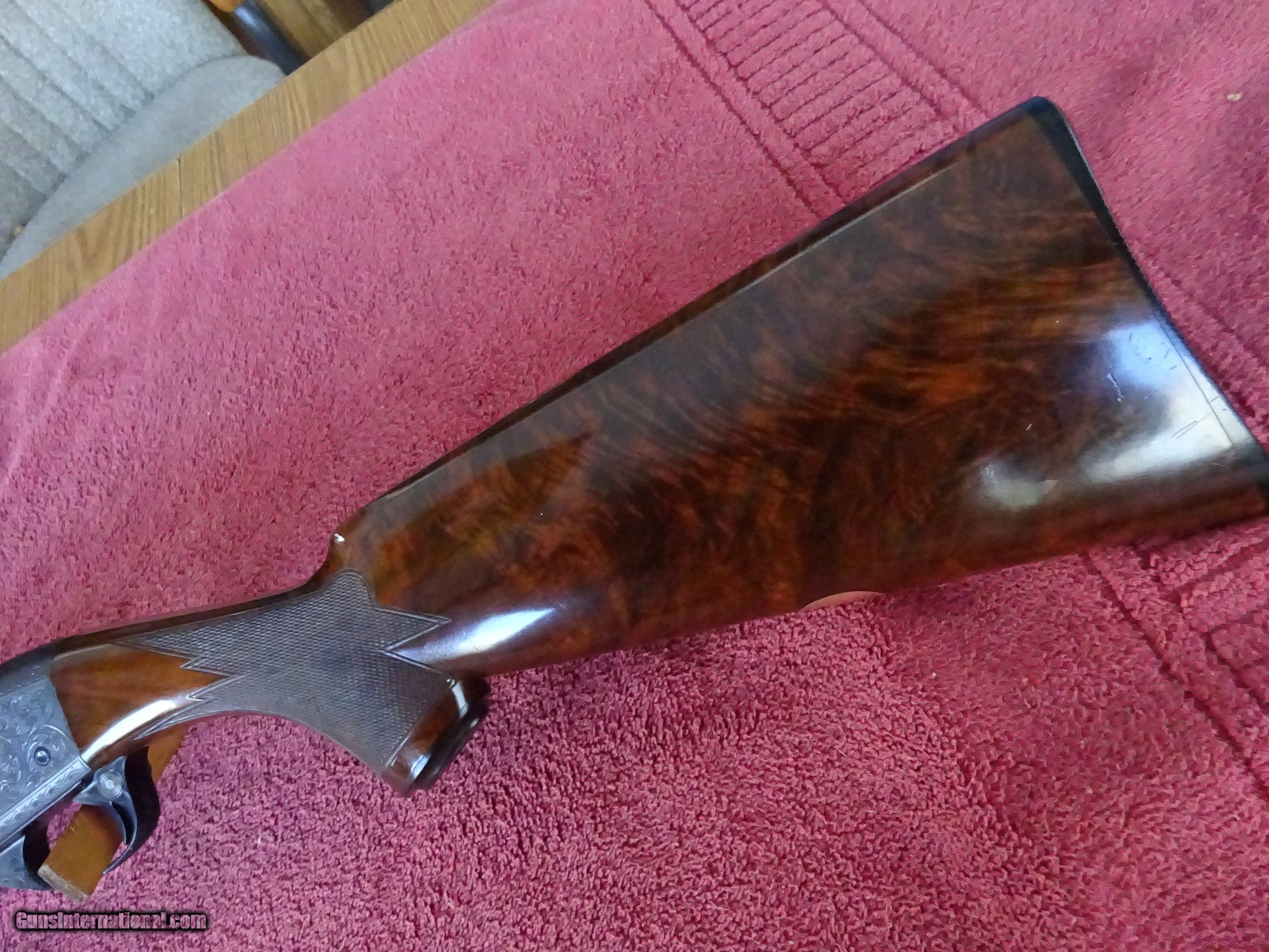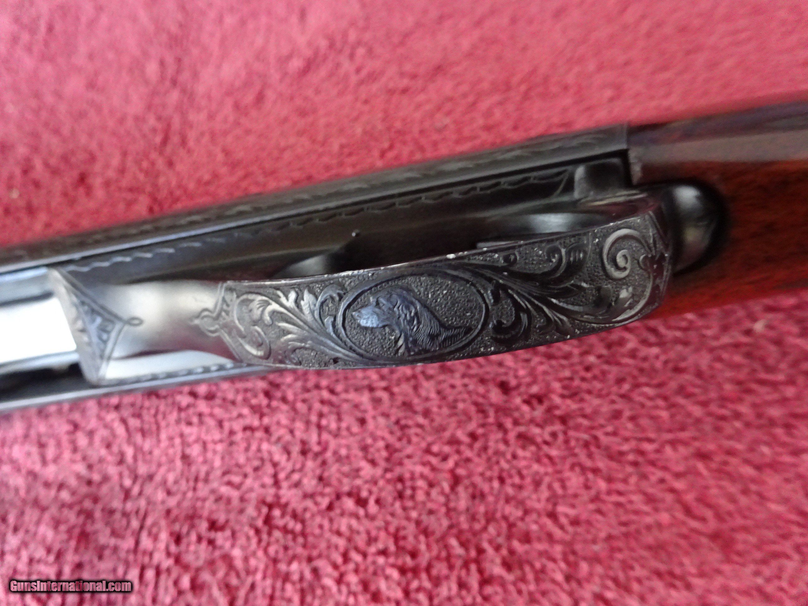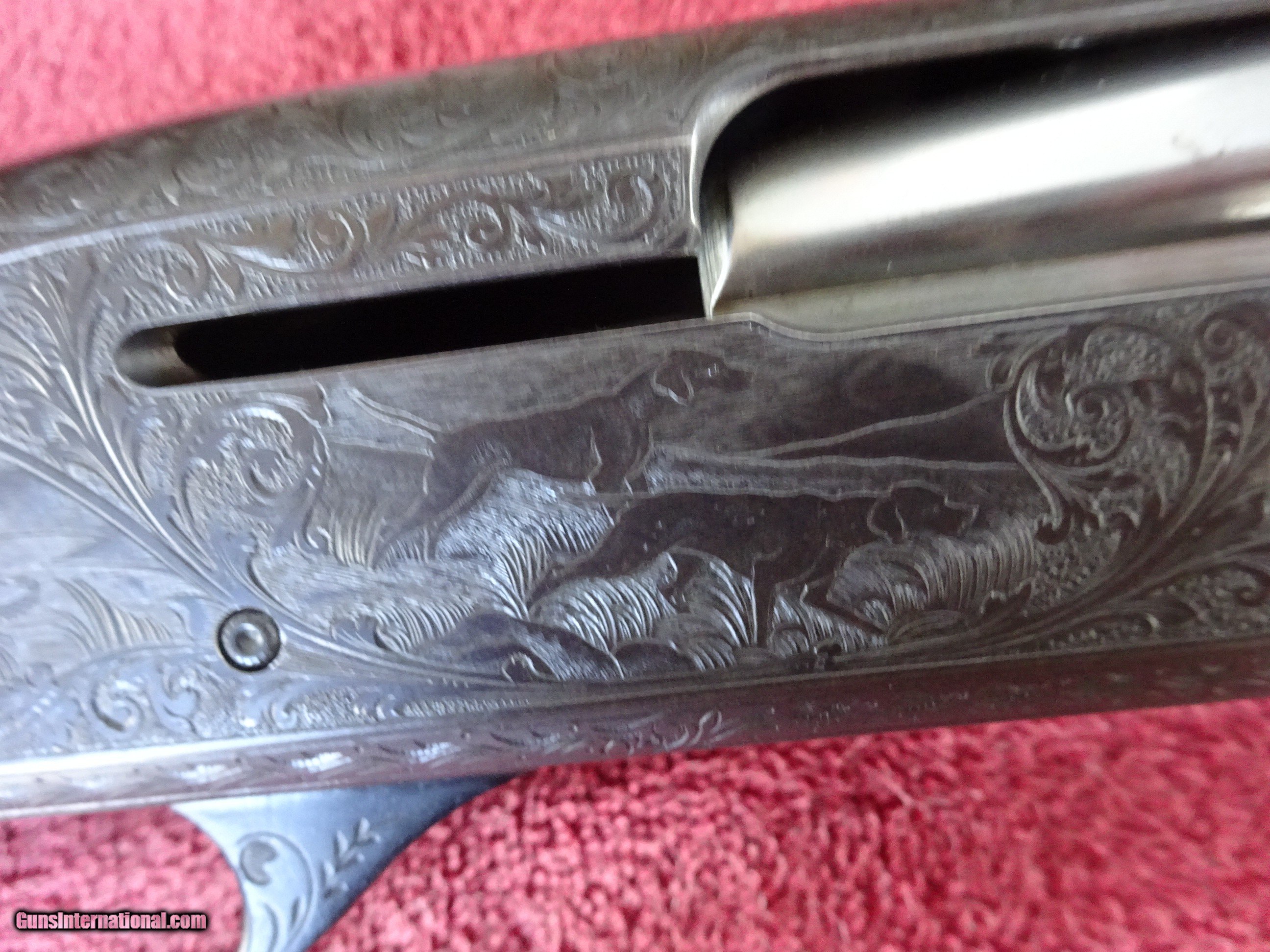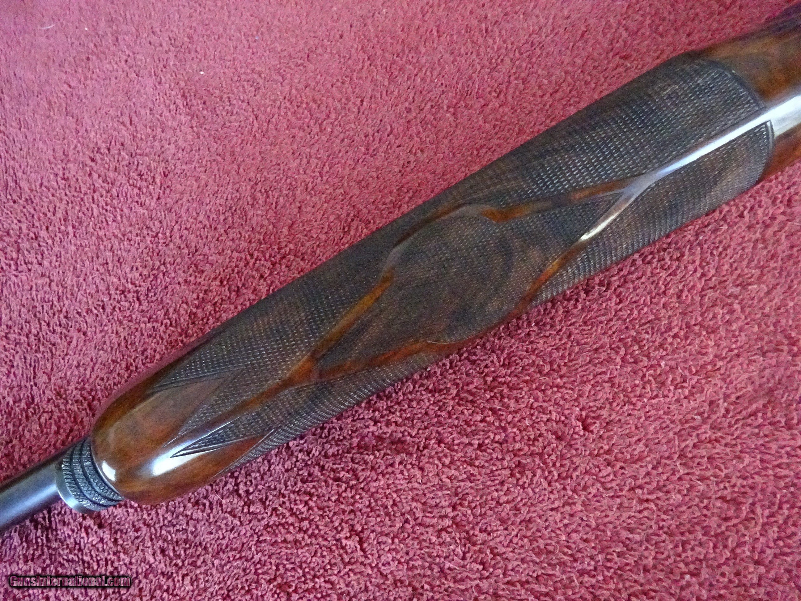 Description: REMINGTON MODEL 11-48 F GRADE 28 GAUGE. MARKED "SKEET" ON THE UNDERSIDE OF THE 25" VENT RIB BARREL. TWIN SIGHTS, 100% BRIGHT BLUE, MIRROR PERFECT BORE, 6 " LONG ENGRAVING PATTERN AT BREECH END, DEEP CUT VINE AND SCROLL WITH A STIPPLED BACKGROUND. THE FRAME IS PROFUSELY ENGRAVED - THE RIGHT SIDE SHOWS 3 VIGNETTES, A STANDING WOODCOCK AT THE FRONT, A PAIR OF ENGLISH POINTERS AT THE CENTER AND A MALLARD IN FLIGHT AT THE REAR. THE LEFT SIDE ALSO HAS 3 SCENES, THE FRONT HAS A QUAIL FLYING OVER A RAIL FENCE, TWO ENGLISH SETTERS ON POINT AT CENTER, HIGHLY DETAILED ROOSTER PHEASANT IN FLIGHT AT REAR. ALL THE GAME SCENES ARE SURROUNDED BY DEEP CUT LEAF AND VINE WITH A STIPPLED BACKGROUND. TRIGGERGUARD SHOWS A BUST OF A HUNTING DOG, AGAIN SURROUNDED BY DEEP-CUT SCROLL ENGRAVING. REMINGTON 11-48 S.F. PLUS SERIAL NUMBER ENGRAVED ON THE BOTTOM. PISTOL GRIP STOCK, SEMI-BEAVERTAIL FOREARM, HIGHEST QUALITY DELUXE AMERICAN WALNUT, GORGEOUS FIGURE AND COLOR. VERY FINE CUT CHECKERING, FOREARM IS EXCEPTIONALLY ATTRACTIVE. EMBOSSED REMINGTON MARKED GRIP CAP, GOLD OVAL STOCK INLAY (NOT ENGRAVED), REMINGTON MARKED RIBBED BUTTPLATE. THIS IS THE FINEST QUALITY, HIGHET GRADE SHOTGUN OF THIS TYPE REMINGTON PRODUCED. SUPERB, 100% ORIGINAL CONDITION, 14" LENGTH OF PULL, 6 POUNDS 9 OUNCES, CIRCA 1950s. $9950.00 + $100.00 Insured shipping to an FFL address. Layaway is available. See all Pats gun listings on this site! We also have hundreds of ORIGINAL gun company advertising & memorabilia pieces available for sale on our site SPORTINGCOLLECTIBLES. We have no reprints or reproductions. Email for more information. If you need to call, morning or evening is best, and please note the Seller's Inventory number. SOLD Curio/Relic: Yes |
