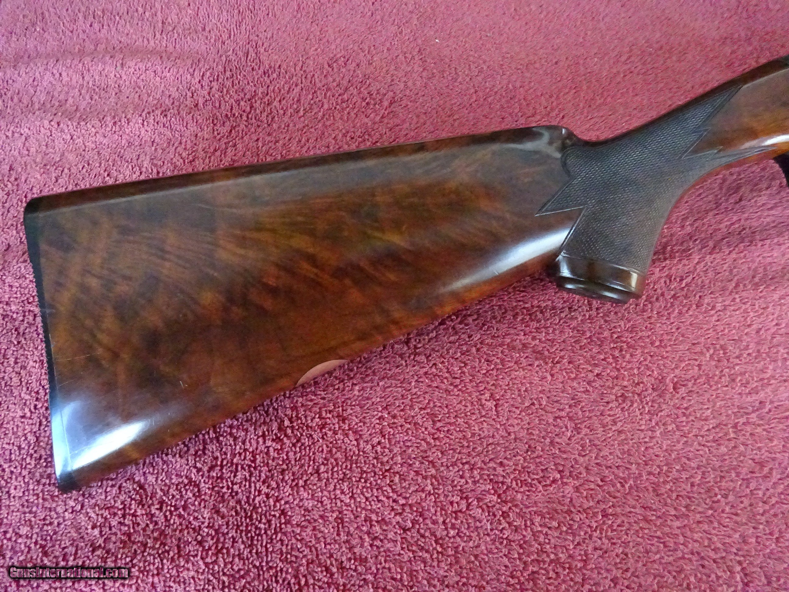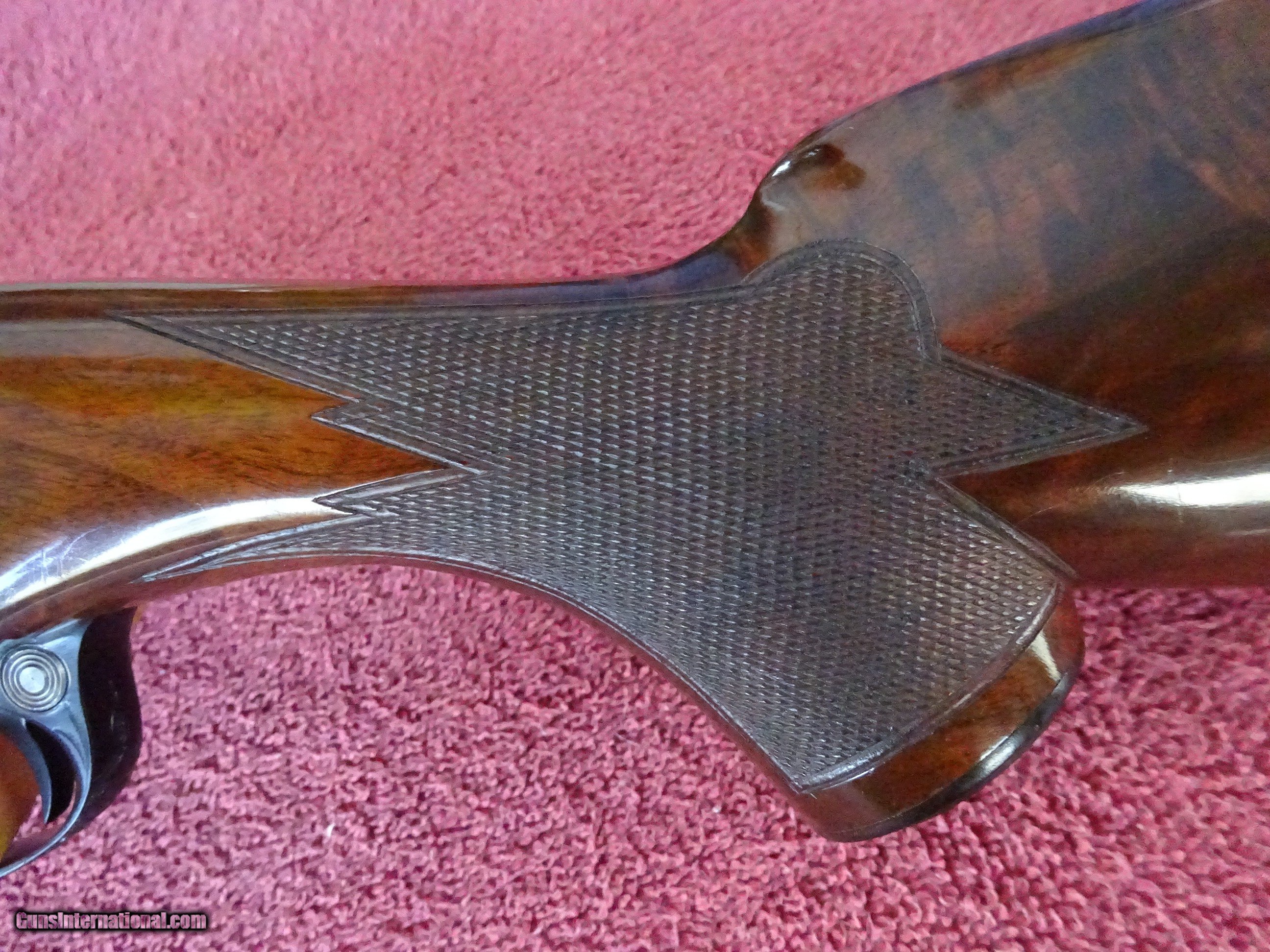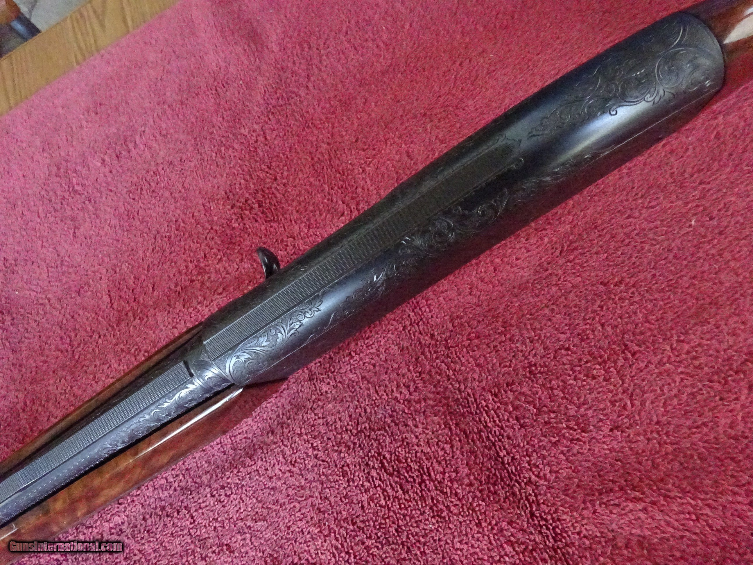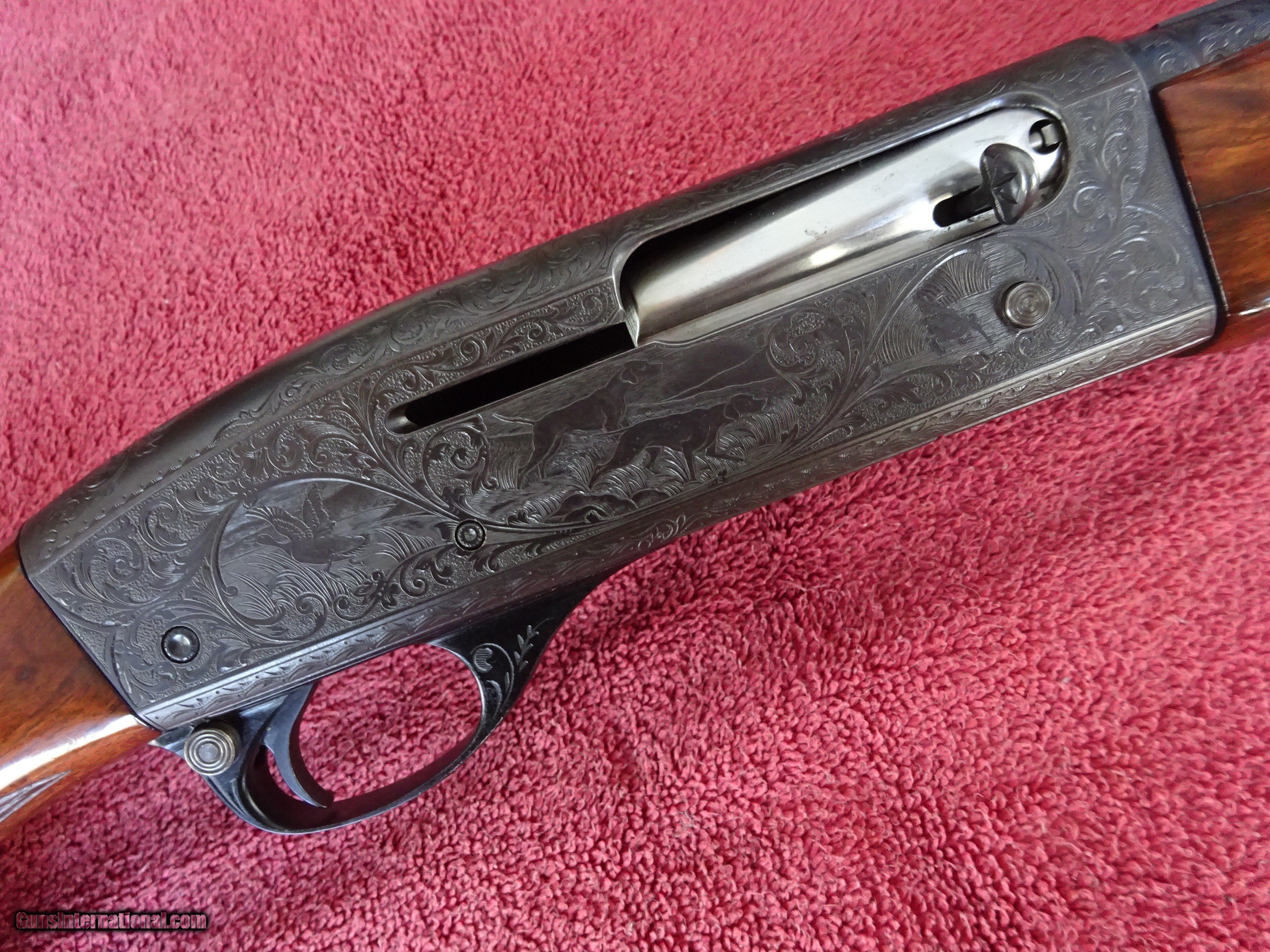 Description: REMINGTON MODEL 11-48 F GRADE 28 GAUGE. MARKED "SKEET" ON THE UNDERSIDE OF THE 25" VENT RIB BARREL. TWIN SIGHTS, 100% BRIGHT BLUE, MIRROR PERFECT BORE, 6 " LONG ENGRAVING PATTERN AT BREECH END, DEEP CUT VINE AND SCROLL WITH A STIPPLED BACKGROUND. THE FRAME IS PROFUSELY ENGRAVED - THE RIGHT SIDE SHOWS 3 VIGNETTES, A STANDING WOODCOCK AT THE FRONT, A PAIR OF ENGLISH POINTERS AT THE CENTER AND A MALLARD IN FLIGHT AT THE REAR. THE LEFT SIDE ALSO HAS 3 SCENES, THE FRONT HAS A QUAIL FLYING OVER A RAIL FENCE, TWO ENGLISH SETTERS ON POINT AT CENTER, HIGHLY DETAILED ROOSTER PHEASANT IN FLIGHT AT REAR. ALL THE GAME SCENES ARE SURROUNDED BY DEEP CUT LEAF AND VINE WITH A STIPPLED BACKGROUND. TRIGGERGUARD SHOWS A BUST OF A HUNTING DOG, AGAIN SURROUNDED BY DEEP-CUT SCROLL ENGRAVING. REMINGTON 11-48 S.F. PLUS SERIAL NUMBER ENGRAVED ON THE BOTTOM. PISTOL GRIP STOCK, SEMI-BEAVERTAIL FOREARM, HIGHEST QUALITY DELUXE AMERICAN WALNUT, GORGEOUS FIGURE AND COLOR. VERY FINE CUT CHECKERING, FOREARM IS EXCEPTIONALLY ATTRACTIVE. EMBOSSED REMINGTON MARKED GRIP CAP, GOLD OVAL STOCK INLAY (NOT ENGRAVED), REMINGTON MARKED RIBBED BUTTPLATE. THIS IS THE FINEST QUALITY, HIGHET GRADE SHOTGUN OF THIS TYPE REMINGTON PRODUCED. SUPERB, 100% ORIGINAL CONDITION, 14" LENGTH OF PULL, 6 POUNDS 9 OUNCES, CIRCA 1950s. $9950.00 + $100.00 Insured shipping to an FFL address. Layaway is available. See all Pats gun listings on this site! We also have hundreds of ORIGINAL gun company advertising & memorabilia pieces available for sale on our site SPORTINGCOLLECTIBLES. We have no reprints or reproductions. Email for more information. If you need to call, morning or evening is best, and please note the Seller's Inventory number. SOLD Curio/Relic: Yes |