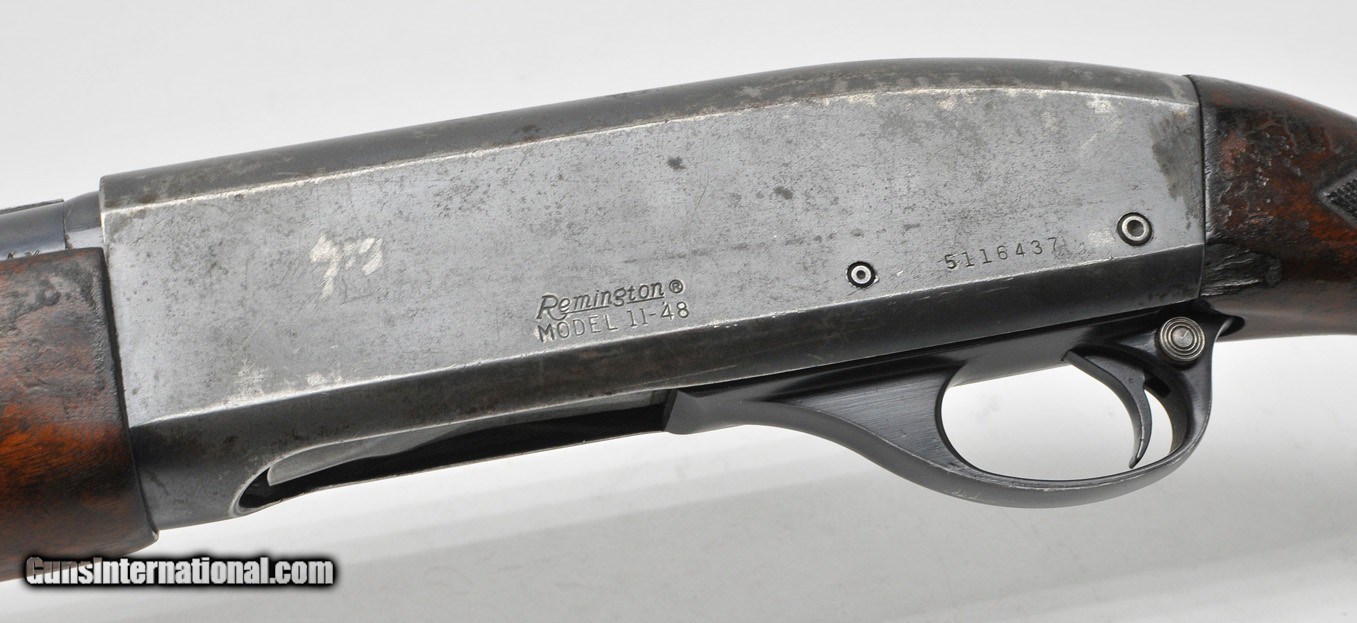 Description: Remington Model 11-48 Semi-Auto 12 Gauge Shotgun The Remington Model 11-48 is a semi-automatic shotgun manufactured by Remington Arms as the first of the "New Generation" semi-autos produced after World War II.[1] The Remington Model 11-48 was released as the replacement for Remington's Model 11. It was manufactured from 1949 to 1968 and was produced in 12, 16, 20 and 28 gauge and .410 variations. The 11-48 was revolutionary in that it ushered in stamped steel components for a lower cost of assembly, and featured truly interchangeable parts not requiring fitting by a gunsmith, and it was reliable in the extreme. Nice Used Condition SPECIFICATIONS