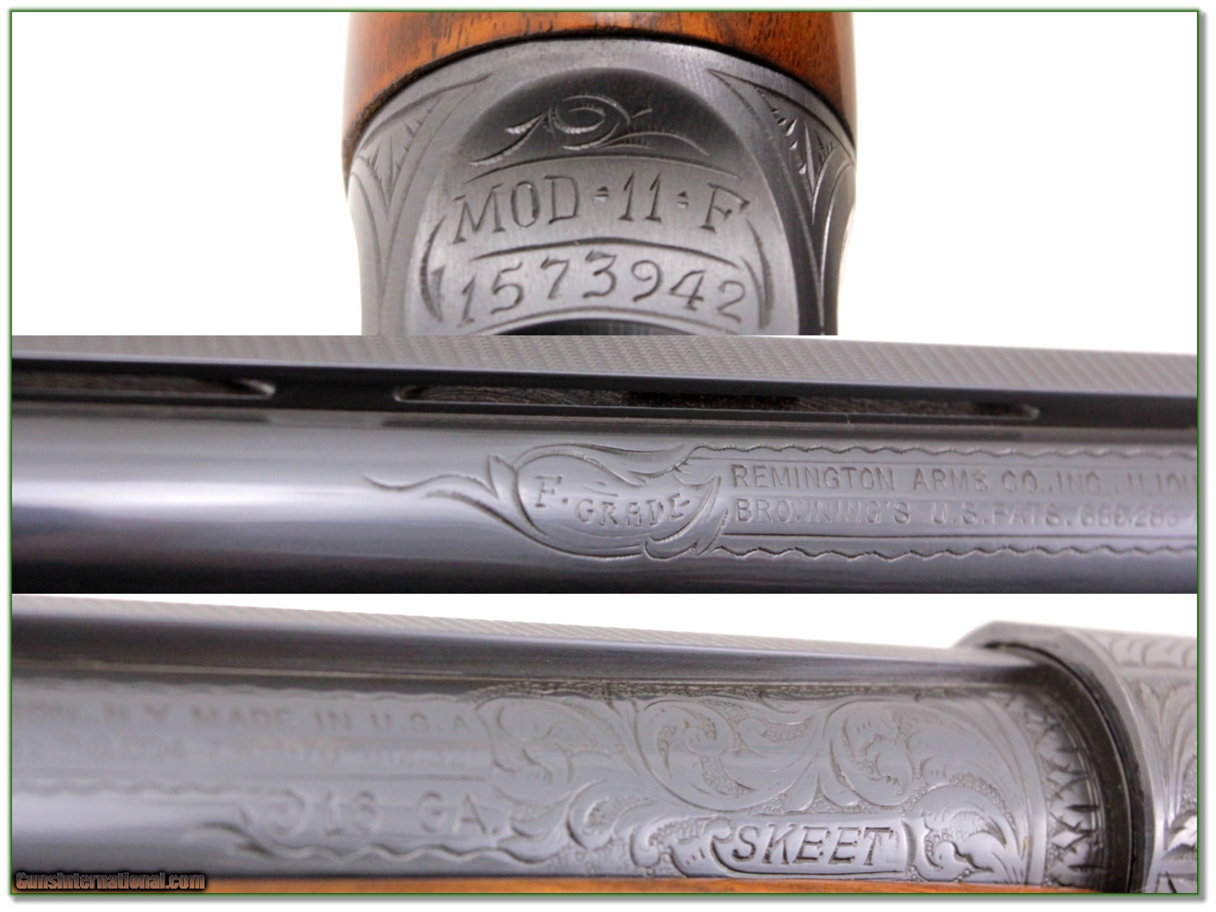 Description: This is a VERY RARE Remington Model 11 F Grade, and even more Rare 16 Gauge with even more Rare Skeet Vent Rib barrel. You may never find another one. It has near new original blue with perfectly executed engraving. At most a few shells fired. It has XXX Wood with 14in LOP over pad. The original owner had his initial engraved in the grip cap. I am selling this one on consignment and as such lay-a-way can’t be used. It does of course have the standard 3-day inspection. Shipping with insurance is $99. Please email me with any questions or larger pictures. (Consign your quality firearms with Shooting Investments for only 12%! Let me know if you have any you would like to sell!) 19-0924 Payment: Payment is by Money Order, Cashiers Check or Personal Check. I can now also accept Credit Cards (MasterCard, Visa, Discover & American Express) with a 3% convenience fee. PayPal can be used for some items but never for firearms. Shipping: The shipping charge will be listed in each description. It is $39 for most firearms. Some heavy guns or those insured for over $2000 will be higher. Shipments to Alaska and Hawaii are higher because air shipment is required. Most firearms are shipped on Tuesday and Thursday and usually in 5 days of receipt of payment. We package all shipments carefully and insure them. Optics are shipped Priority Mail and most other non-firearm shipments are shipped First Class. Returns: Our return policy is simple. If for any reason you are not pleased with your purchase, you may return your item for a full refund of purchase price. Ammunition cannot be returned. It is important to us that you are happy. Guns cannot be fired or dissembled before returning them and they must be returned in the same condition as received. Notification of a return must occur with-in 3 days of receipt at your dealer. Shipping, convenience and dealer fees are not refundable and are the responsibility of the buyer. Lay-a-way: If needed, we offer a 60 day lay-a-way option on most firearms. It is 1/3 now, 1/3 in 30 days and 1/3 in 60 days. Lay-a-way firearm sales are final and if not completed the first payment cannot be returned. Consigning your firearms with Shooting Investments: We will help you get top dollar for your firearms. While most local guns shops charge 20% or more, our fee is only 12% with a minimum of $75. At your local gun shop it might take months to sell. Selling on-line provides instant access to thousands of interested buyers. You won’t find any other on-line dealer willing to sell your firearms for only 12% or listing every gun on 3 separate s. Selling through an House typically costs the seller 15% and the buyer an addition 15% (so 30%) and you have to wait several months to sell and longer to receive funds. If properly priced, we will sell your firearms in a few weeks. Send us an email or give us a call and we’ll explain how easy it is for you to get top dollar. Trading: Trading for use is really just buying your gun to re-sell. If you have a gun you want to trade, please email a picture and we will let you know what we can give or it. You will always get more if we sell it for you on consignment. Help for California Buyers: We are happy to ship to California. It is the buyer’s responsibility to make sure any item you buy is legal in your state. We are also happy to help with your purchase of a firearm from someone other than us. If you see a gun you would like to buy but the seller can’t or won’t ship to California they can ship to use and we’ll then ship it to your California dealer. The cost for this service is only $30 + shipping. Let us know if we can help! SOLD |