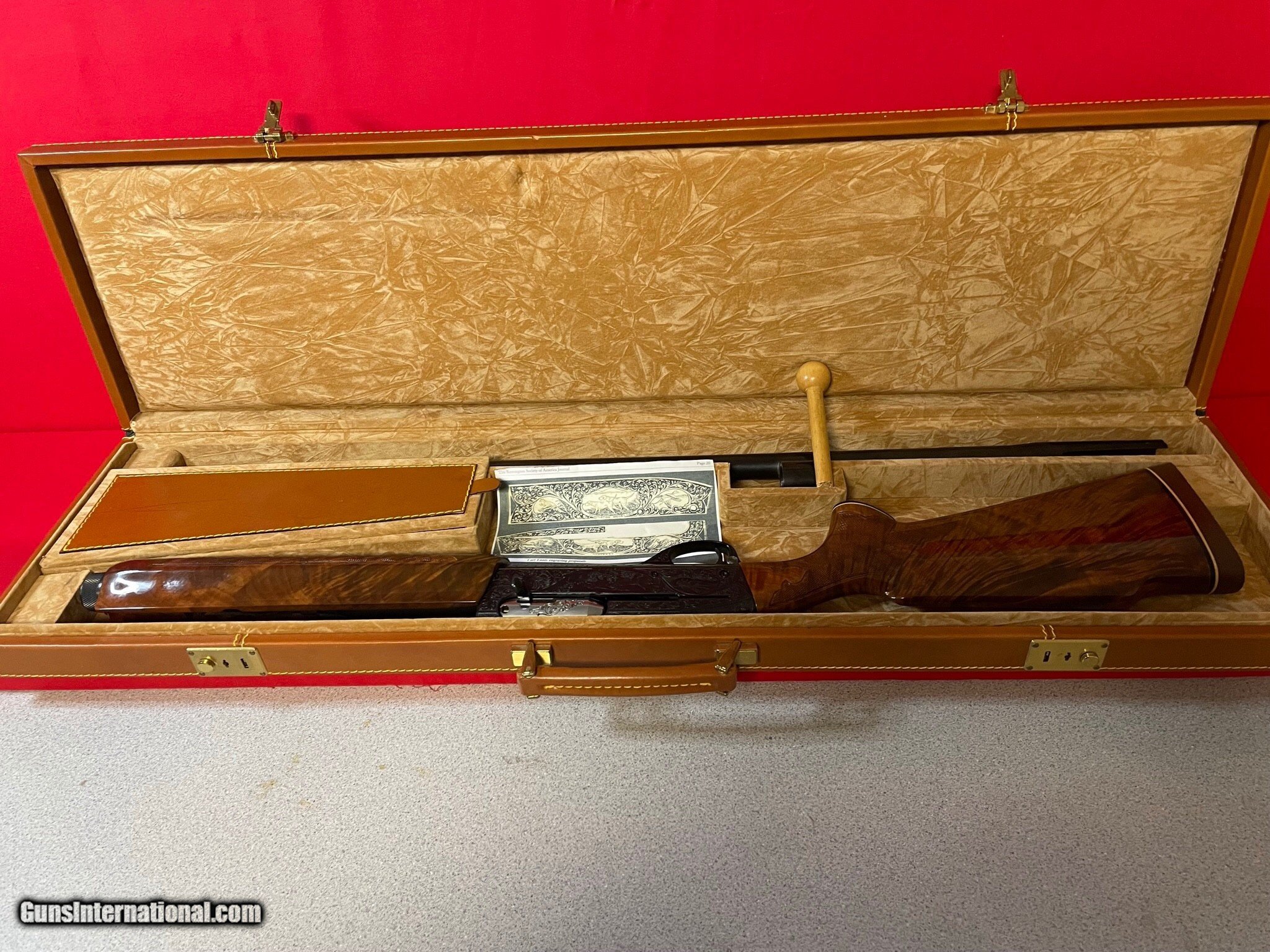 Description: Remington-Model 1100, F Grade, 12 ga 30” Vent Rib 2 beaded Barrel Choked Full. Outstanding feathercrotch American black walnut presentation grade wood. F grade hand checkering, gold name plate no initials. Engraved by MASTER ENGRAVER CARL ENNIS Who engraved special order guns at Remington,you can see the E just above 94 of the serial number on the right side. Highest level of engraving from Remington featuring pointers, setters, woodcock, duck, grouse, surrounded by full coverage scroll work. Extremely rare shogun. Comes with a Emmebi Fabbrica Pelletterie Verclanuoa Case with keys. Reduced to $8500.00 + shipping SOLD |