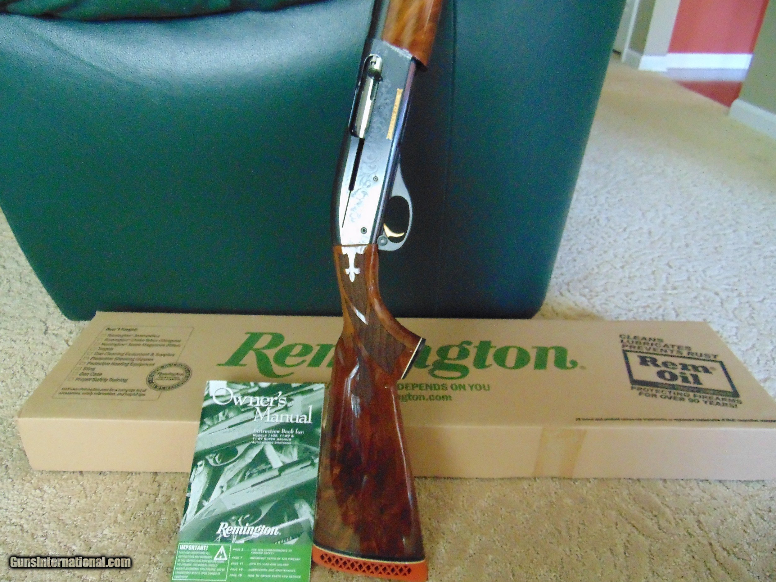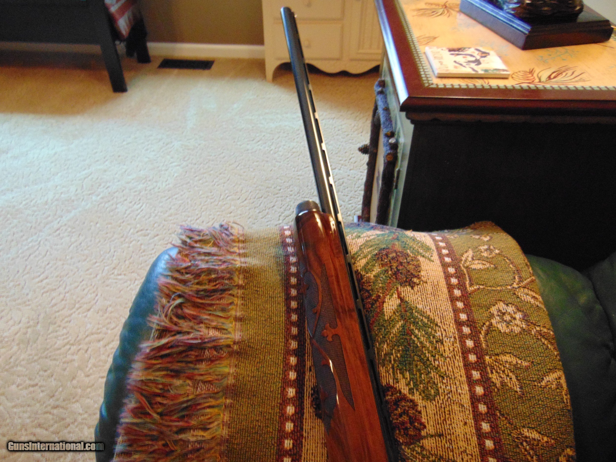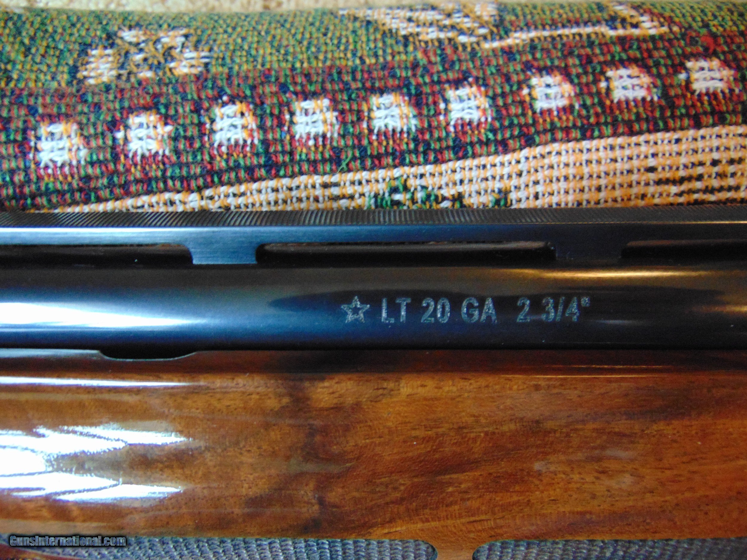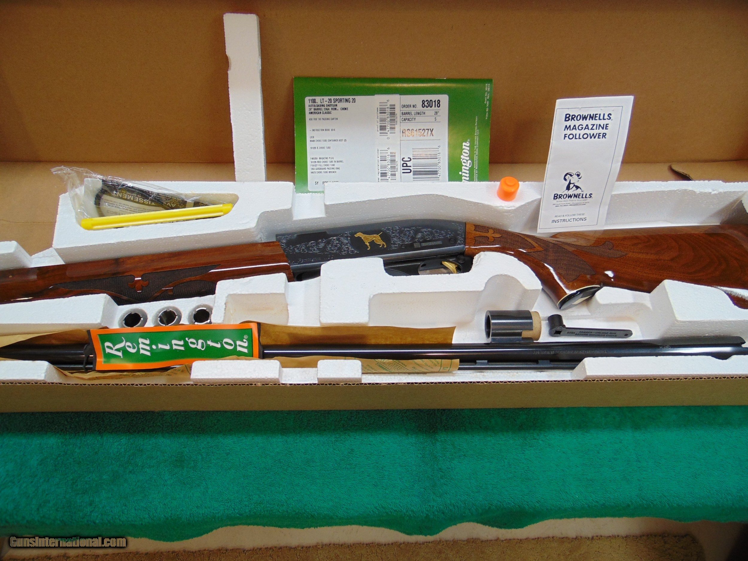 Description: ***SOLD*** PENDING RECEIPT OF FUNDS. Here is a Beautiful, Unfired, New-in-the-Box, Remington Model 1100 "American Classic" LT Sporting 20 Shotgun. Manufactured: 2014-2015. Exceptional High Gloss Wood and Bluing. 2.75" Chamber, 28" Dual Bead Vent Rib Barrel with Rem-Choke Muzzle System. Includes 3 Choke Tubes plus Wrench, Magazine Plug, Gun Lock, and Owners Manual with Packing Slip attached. Original "Excellent" Condition Box. Gold Trigger, along with Scrolled Engraving and Gold Inlays on both sides of Receiver. Perfect "White Diamond" Grip Cap. Classic Remington Red/Orange Ventilated Recoil Pad. Cosmoline removed, Cleaned, Lubed, and ready for the Field, Marsh, Woods, or Range. Shotgun shipped with an Orange Plastic Follower. I have replaced it with a Brownell's Custom Burnt Orange Aluminum Alloy Follower (see pictures). Will reinstall Factory Follower if you prefer. Please note 3 marks located on bottom (rearward) right side of Forend in photos. Shotgun arrived in Box that way. No modern-style "J-Lock" Trigger Safety. $60.00 USPS Insured Priority Shipping to Lower 48 United States. May cost more to far Western States. No International Shipping. SOLD |
