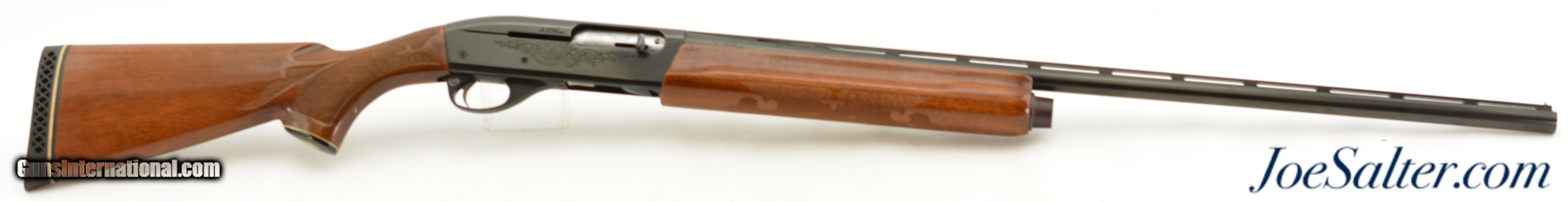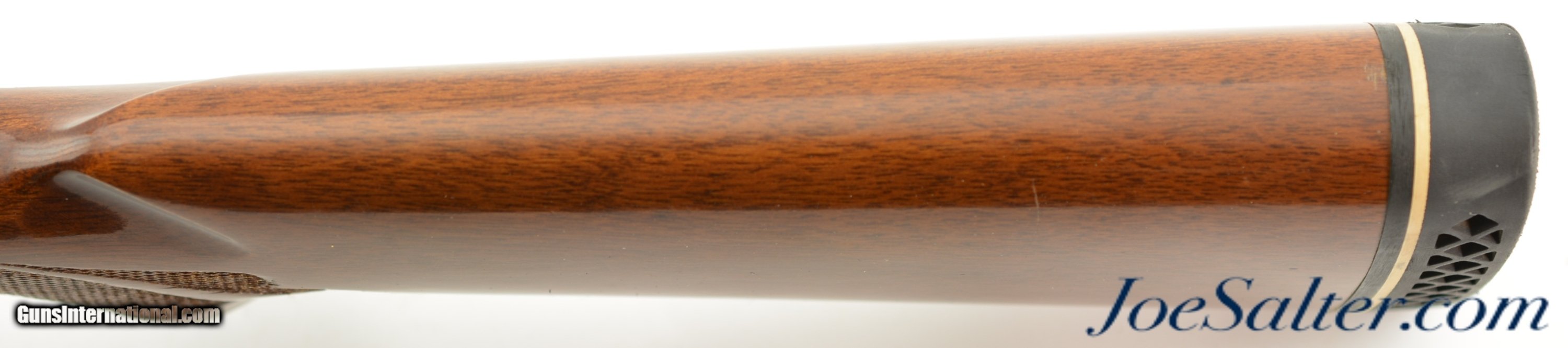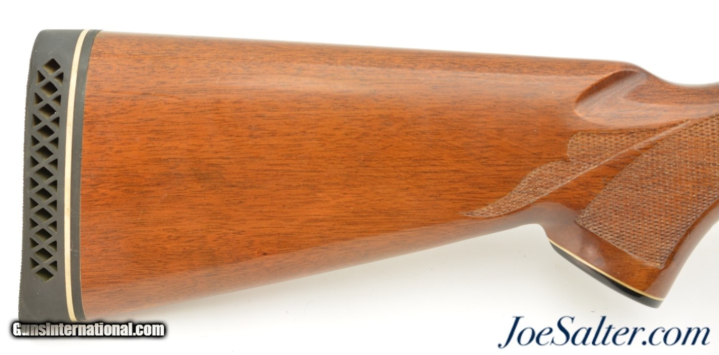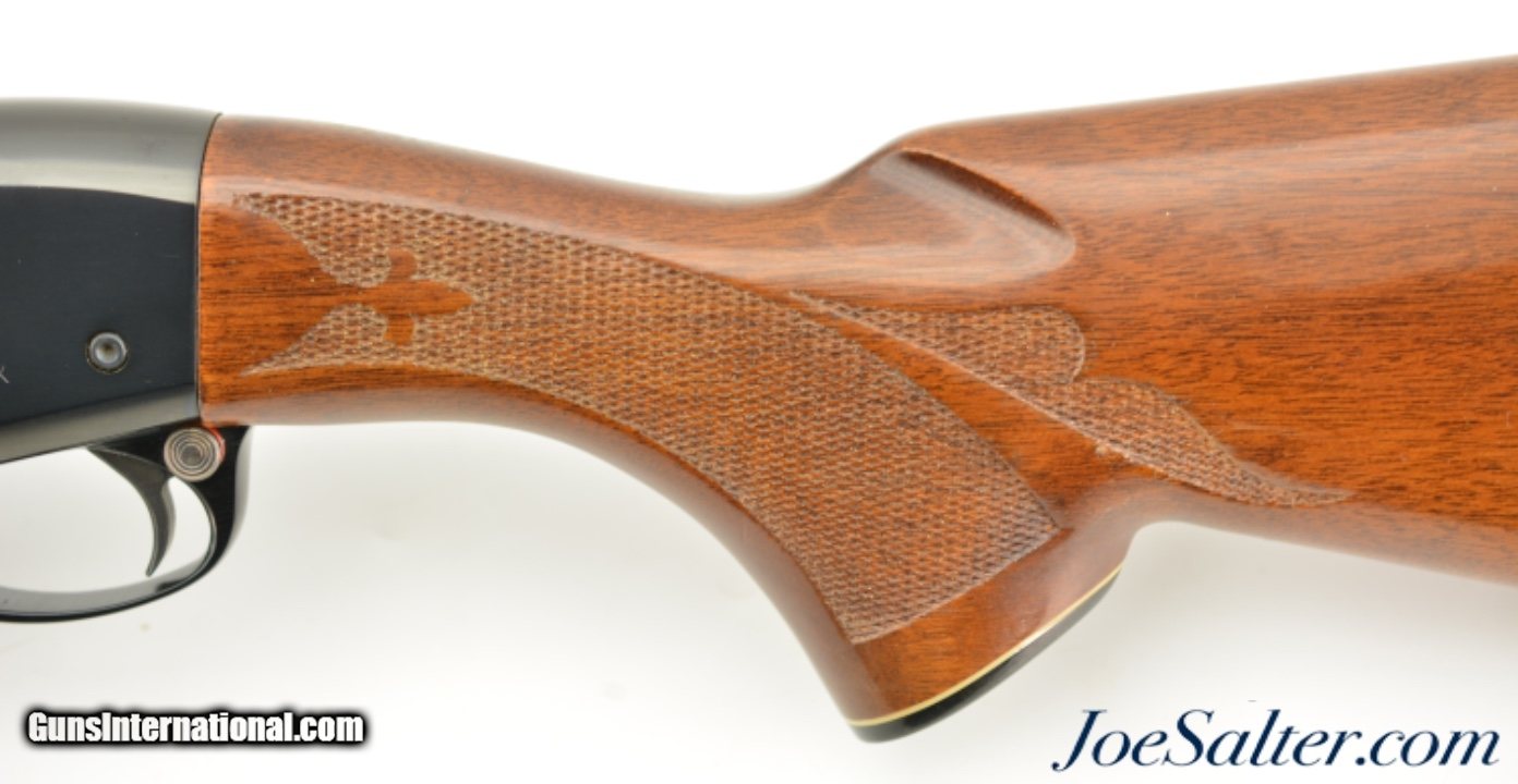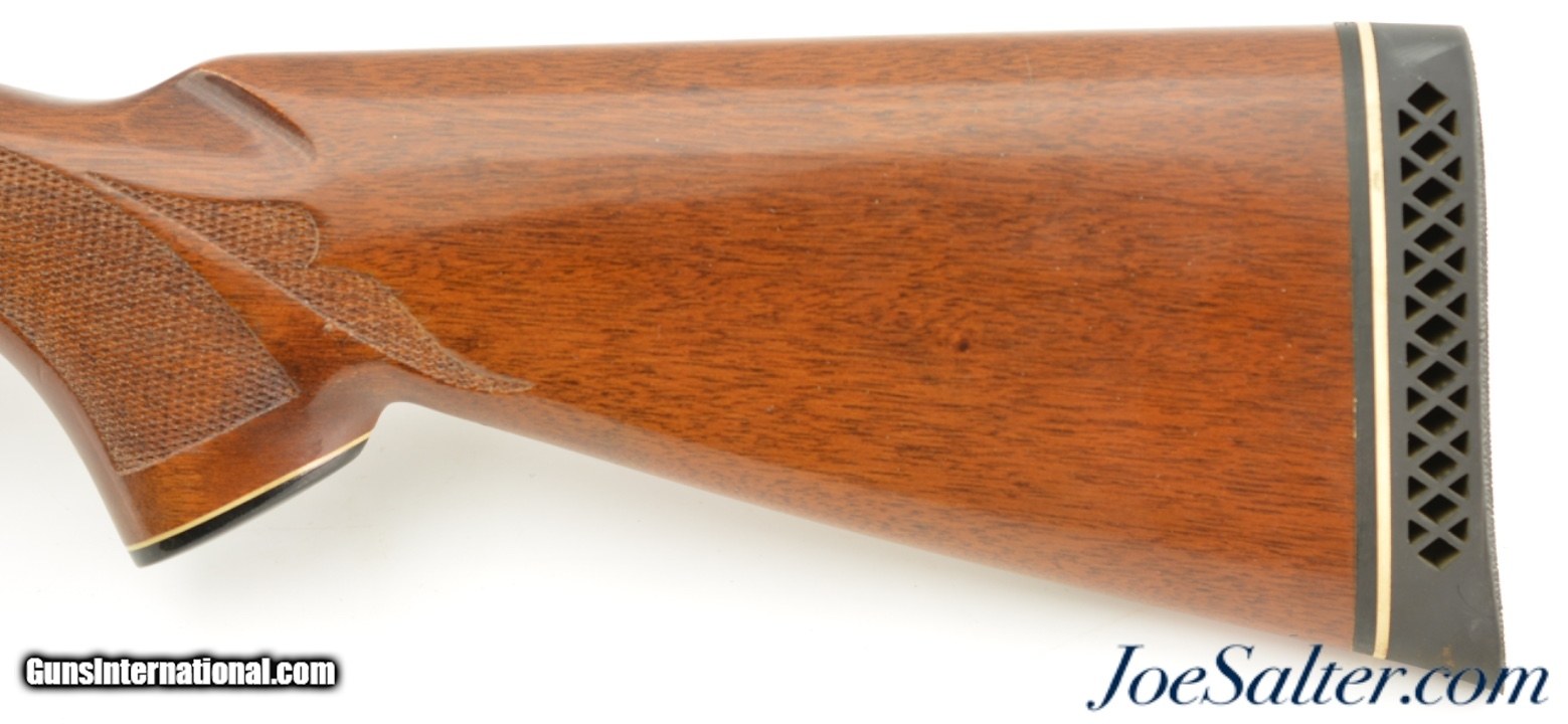 Description: Serial #L220228K, 20 Gauge (2 3/4" chamber), 27 ¾" vent rib barrel with a bright, excellent bore choked full. This is the Remington model 1100 semi-automatic shotgun manufactured by Remington. In excellent condition the barrel and frame retain about 94-96% of the original blue finish with some very minor use marks and some scattered tiny freckling on the receiver. The press checkered stock and forearm are likewise excellent with some minor nicks at the base of the forearm. The LOP is 14" over the original Remington rubber butt pad. A great upland bird gun! FFL SOLD |