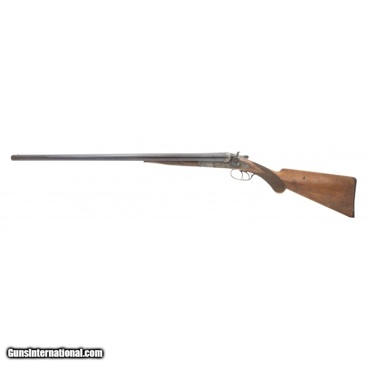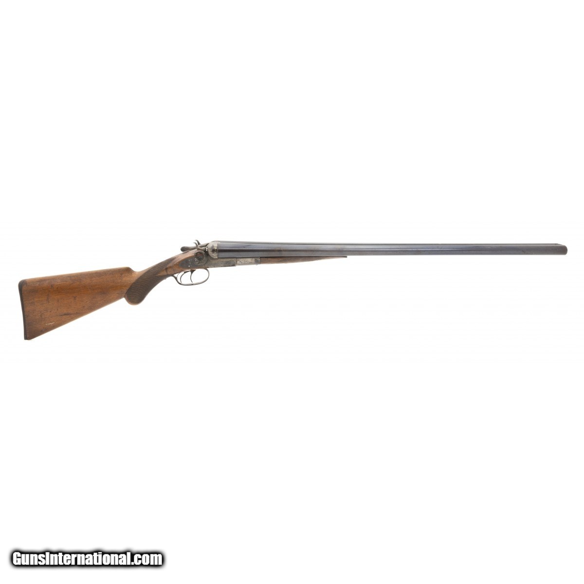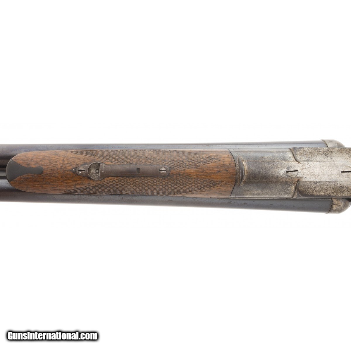 Description: "Made in 1890. 10 gauge with a 30" barrel. This gun has approximately 50% of the original blue mixed with an even plum colored patina. Good case colors remain on the lock that rates approximately 50%. Wood is very good, just showing normal handling wear. Bores are very good. Action functions perfectly. SOLD Antique: Yes |