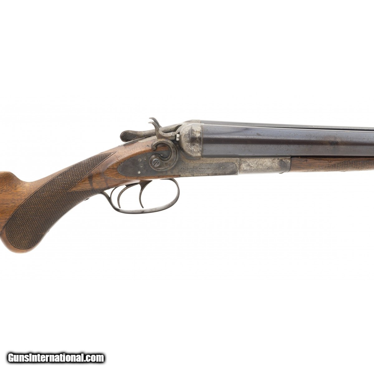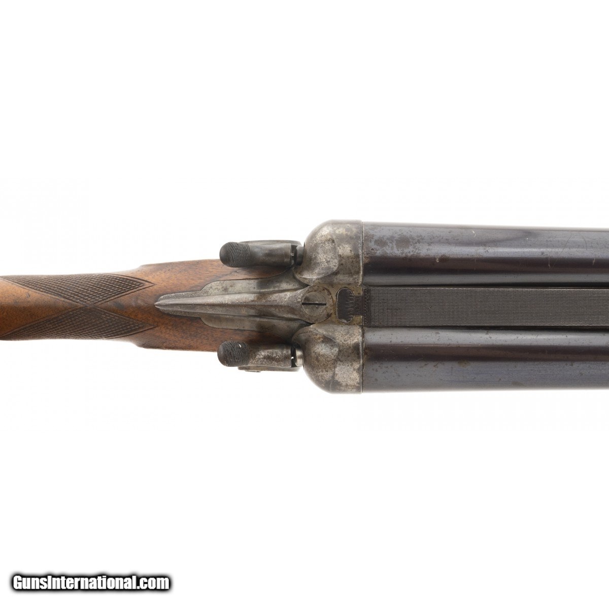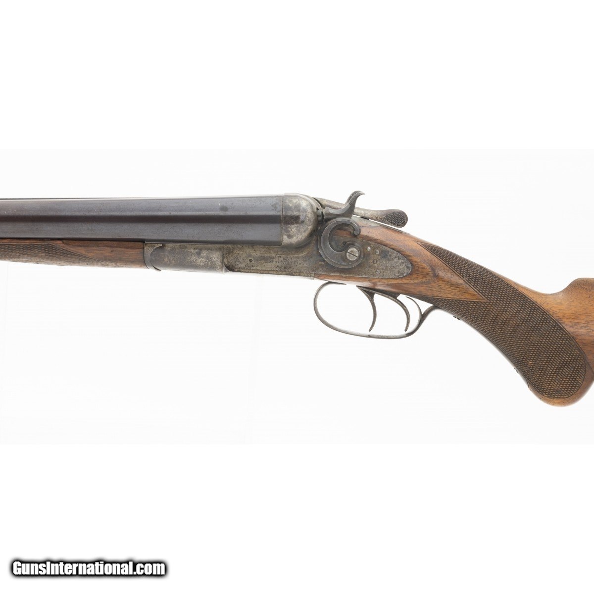 Description: "Made in 1890. 10 gauge with a 30" barrel. This gun has approximately 50% of the original blue mixed with an even plum colored patina. Good case colors remain on the lock that rates approximately 50%. Wood is very good, just showing normal handling wear. Bores are very good. Action functions perfectly. SOLD Antique: Yes |