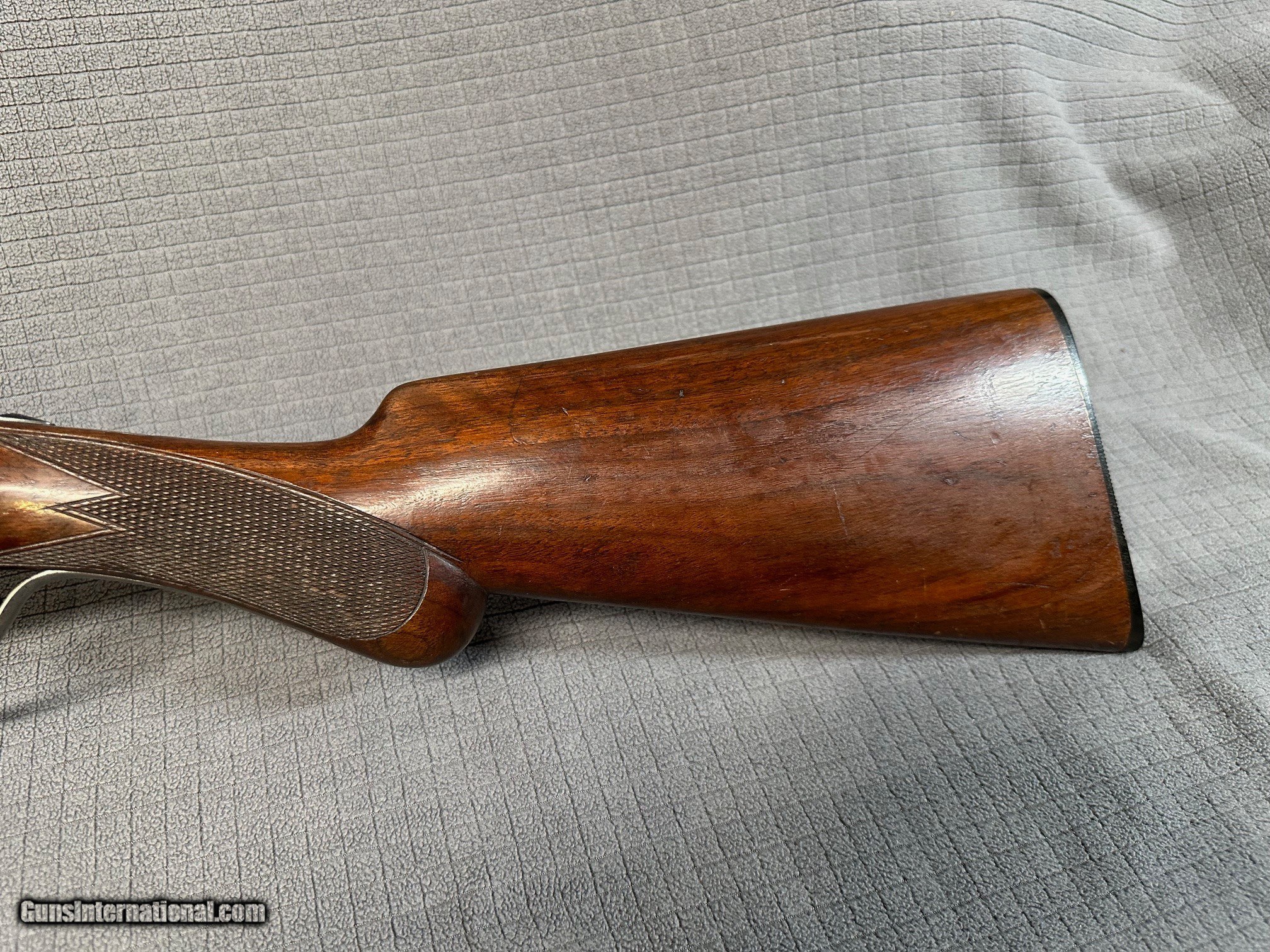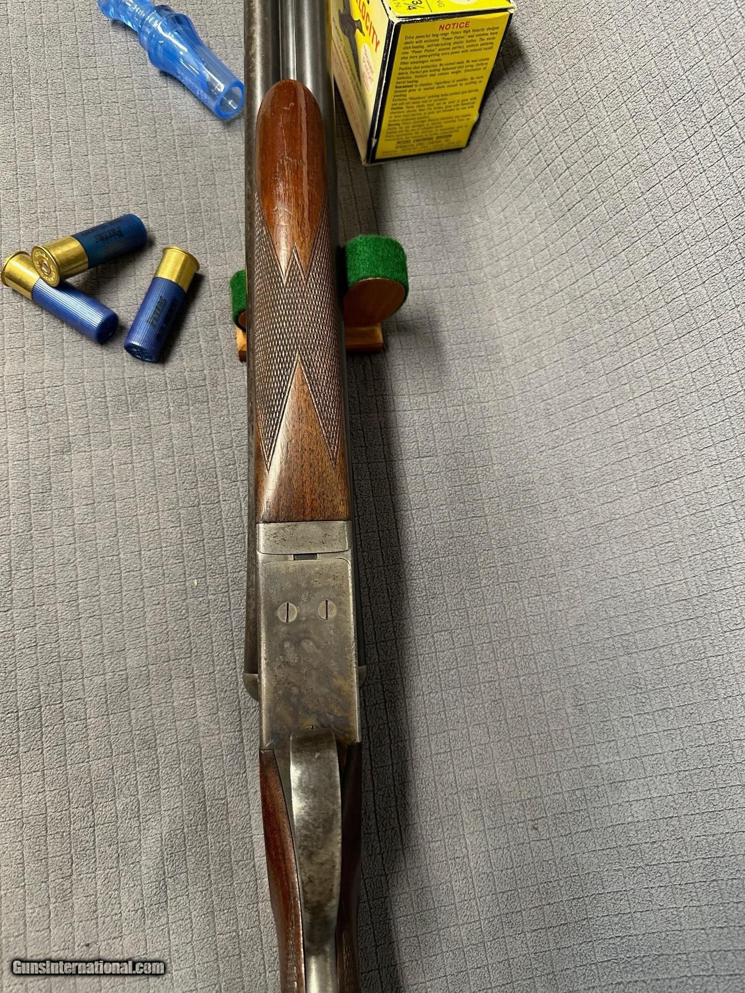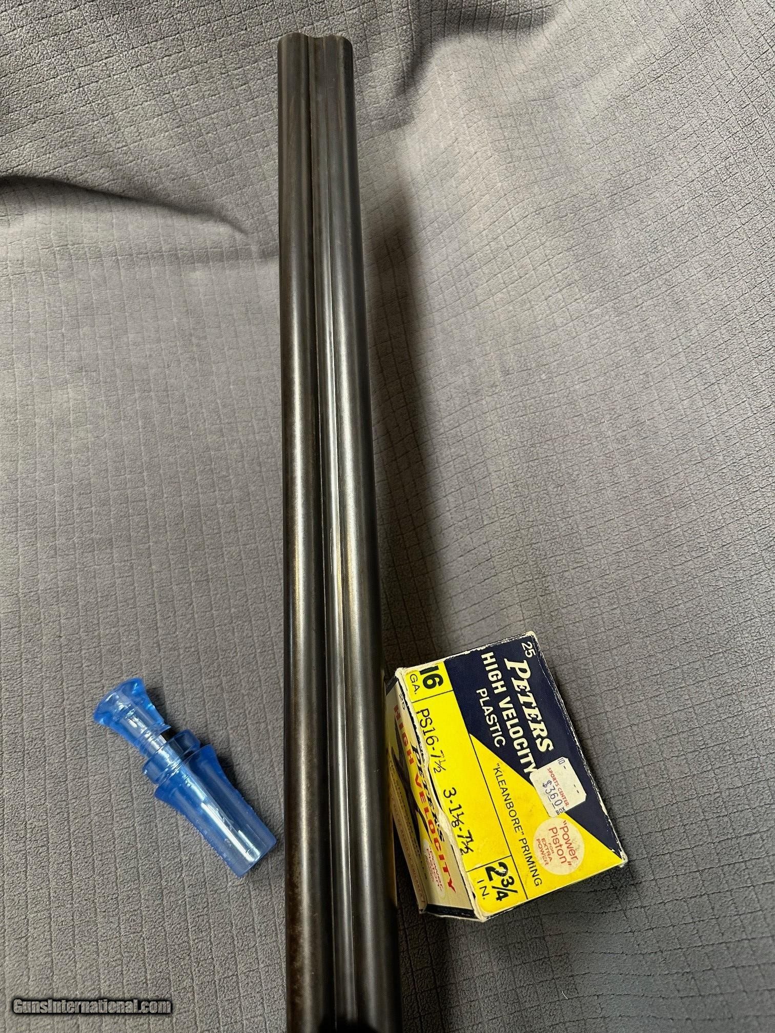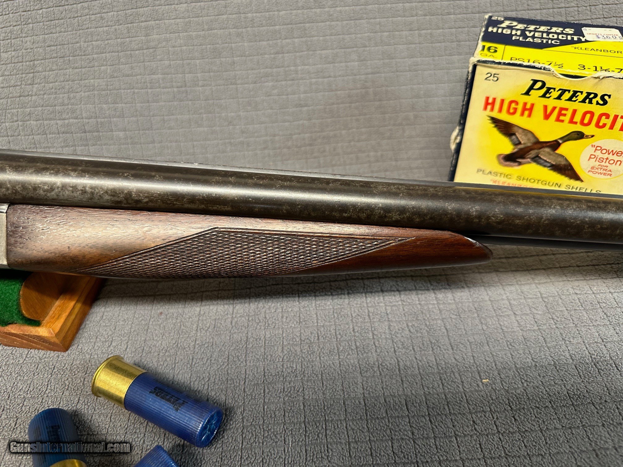 Description: NICE , Solid 16 ga. Remington SXS 1900 K Grade. circa 1905-10. All #'s are matching. Has DT/Extractors. 28" IC/M. Remington Steel barrels. Bores are absolutely mirror bright with zero imperfections. Chambers opened to 2 3/4". This guns action is rock solid. Blueing on right barrel has some very light erosion on the side on rearward half and rest of barrels quite good. Strong case colors still present. Wood appears to have had some refinishing at some time although checkering appears original and is very good.. LOP is 14" over replaced Remington Auto plate. Drop at comb is 2". Drop at heel is 3". All in All a very nice example of a classic early American double gun. $75.00 Shipping & insurance to your FFL(lower 48). No CA Sales. Thanks for looking. SOLD |