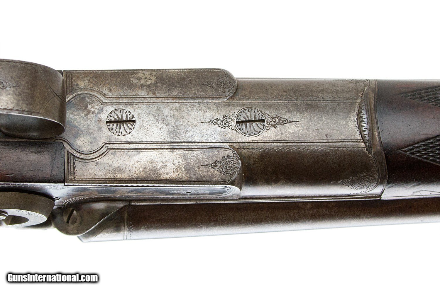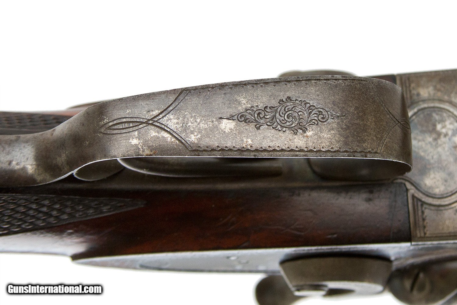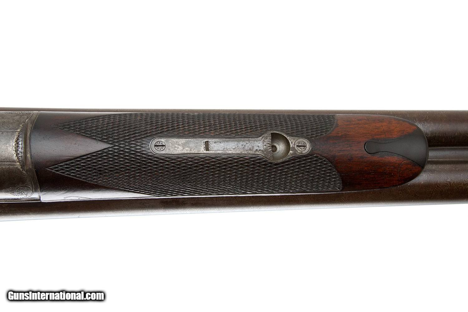 Description: 30" LAMINATED STEEL BARRELS WITH LIGHT PITTING FULL AND FULL 2 1/2" CHAMBERS DOUBLE TRIGGER EXTRACTORS SPLINTER FOREARM PISTOL GRIP ORIGINAL CONDITION WITH CASE COLORS HANDLING MARKS IN THE WOOD 8LBS 7 OZ 3 1/4 DAH 2 1/8 DAC 14 1/4 LOP SOLD |