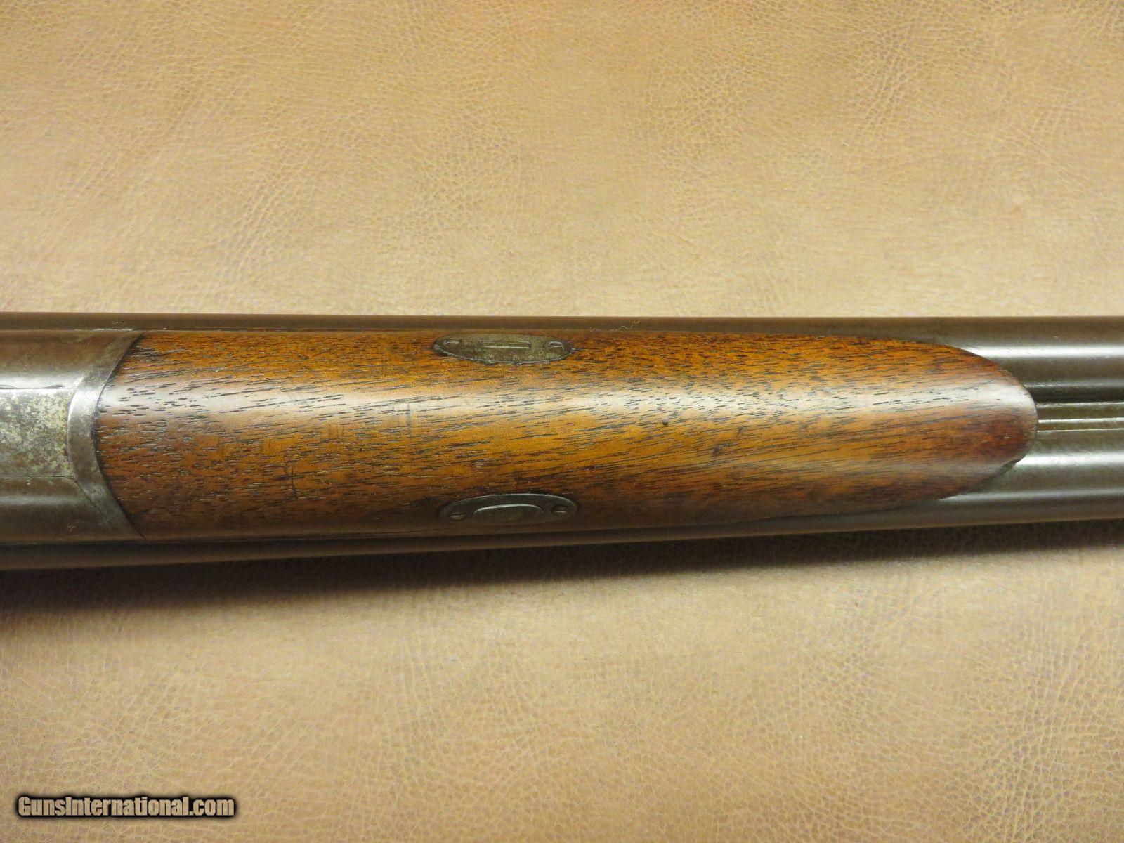 Description: 10 ga. side by side with 30 inch barrels. Push up on tang lever to open. Non checkered walnut with original steel butt plate. Serial number 41xx. SOLD |