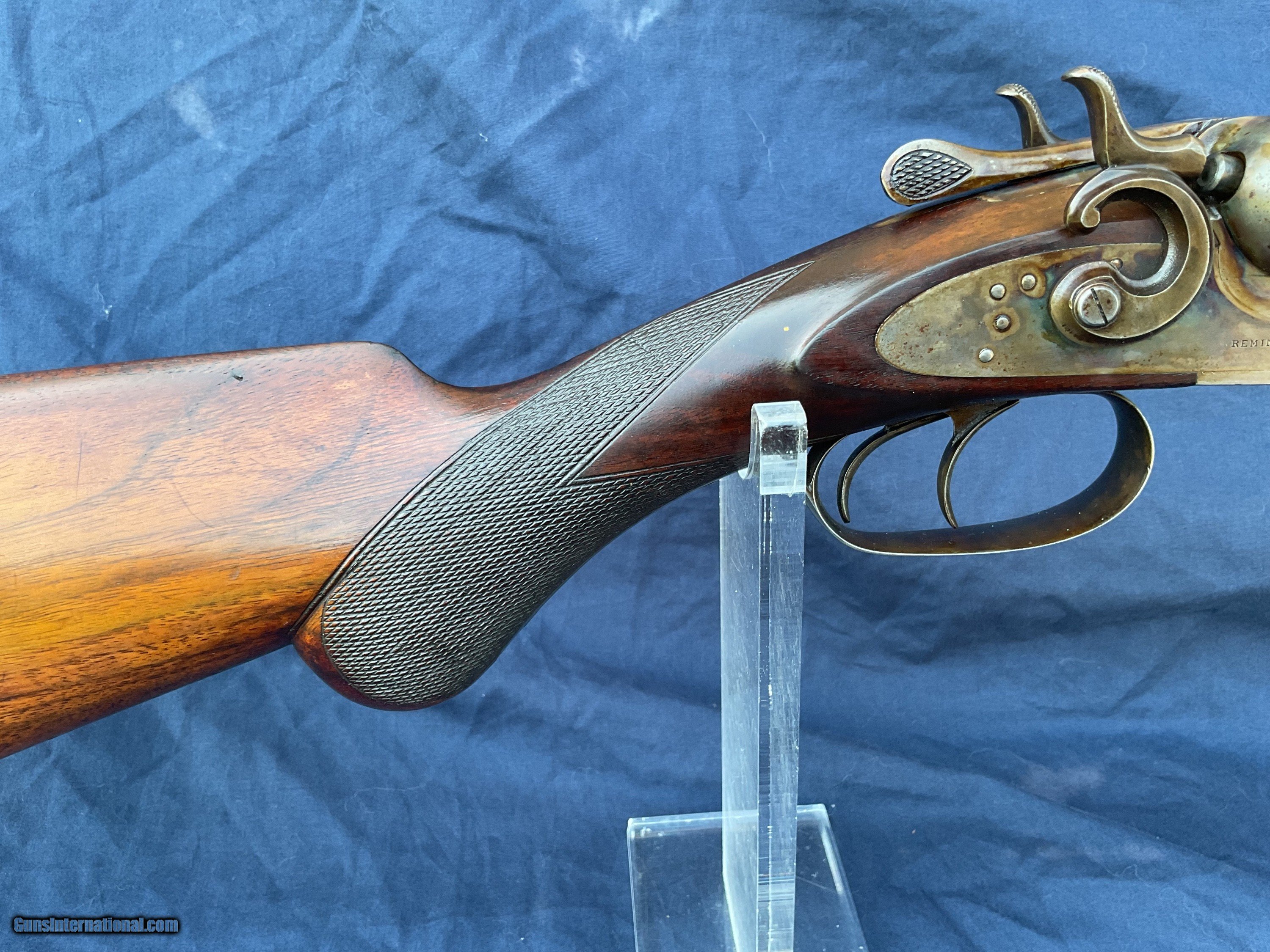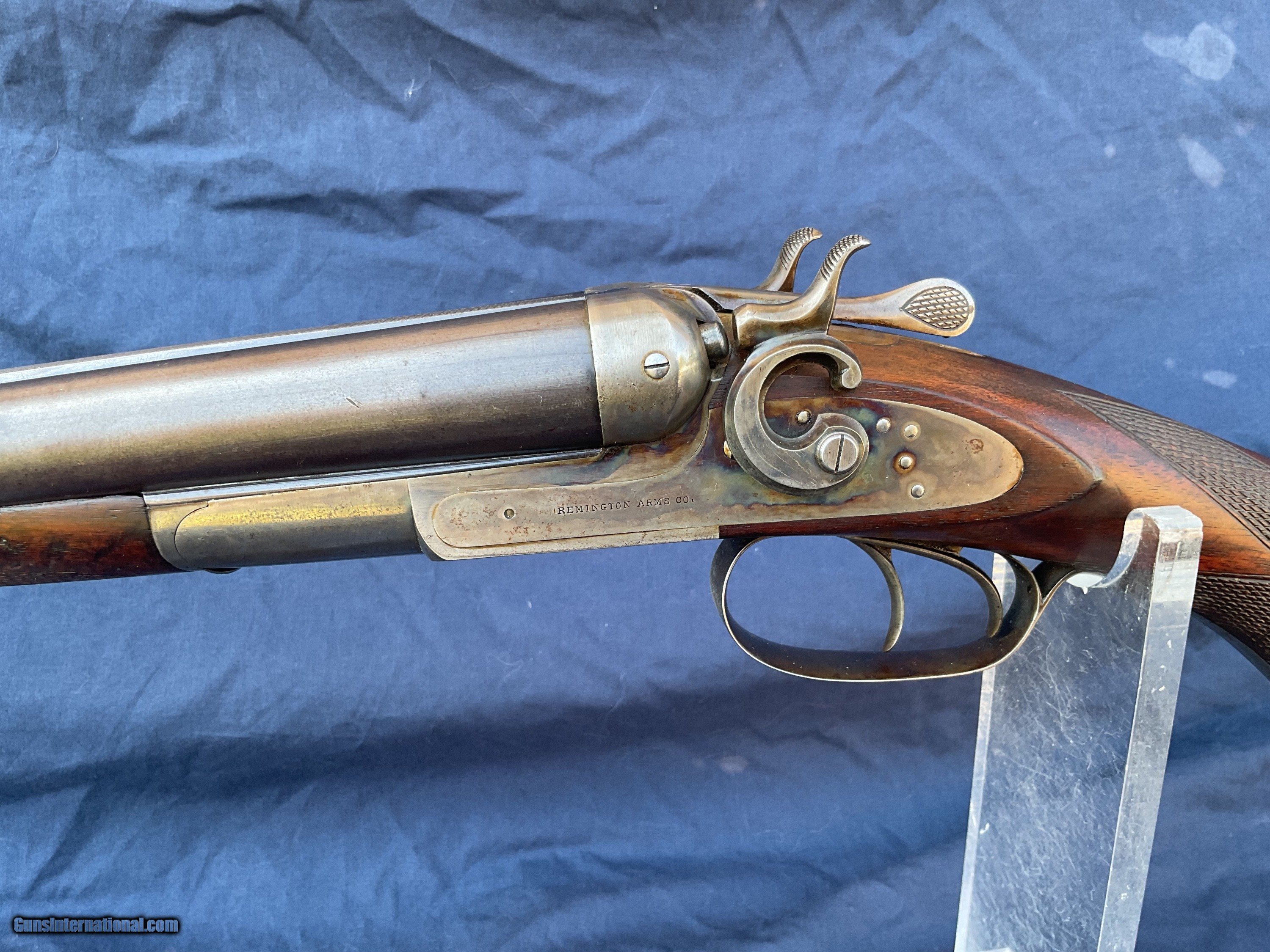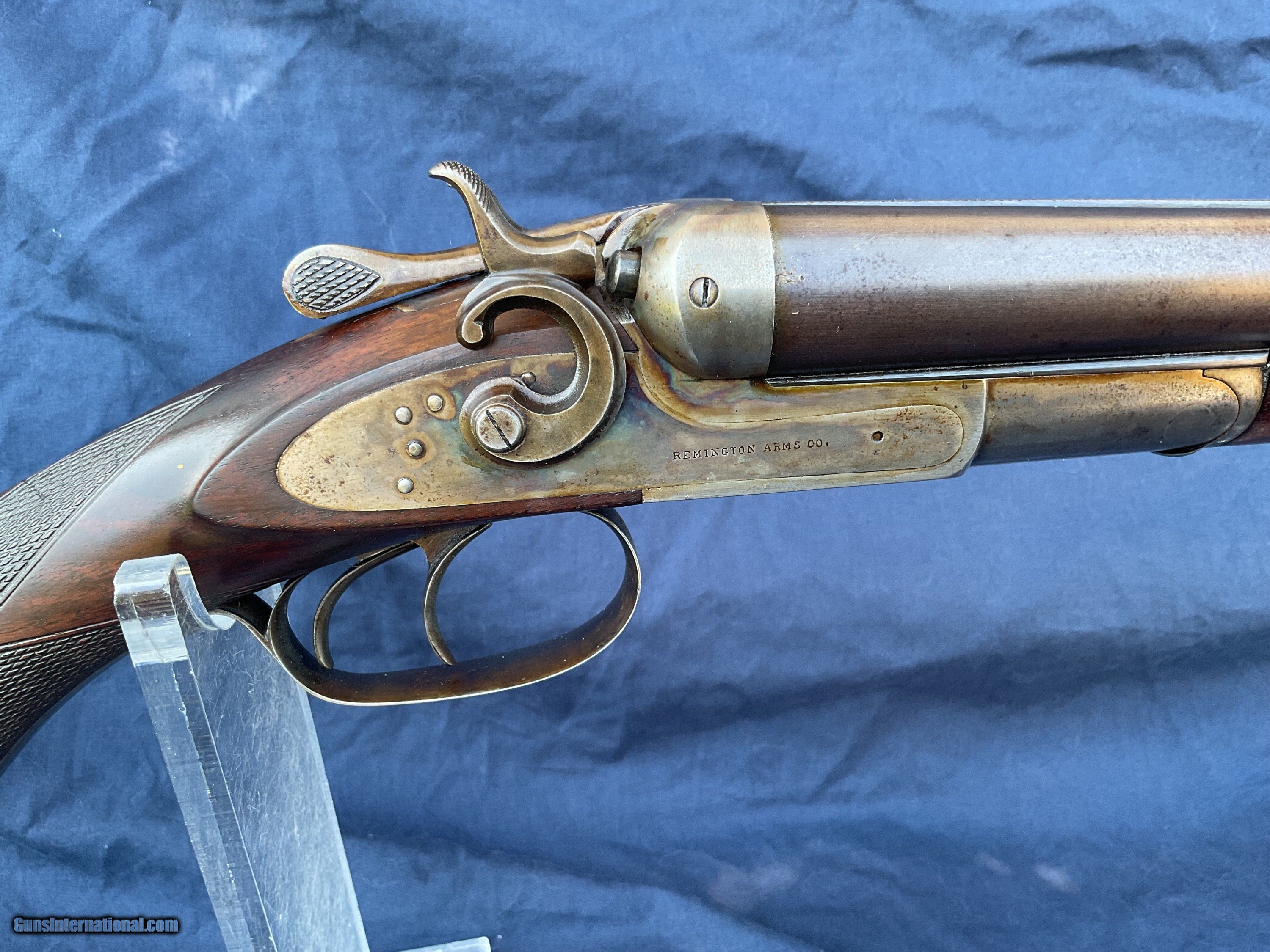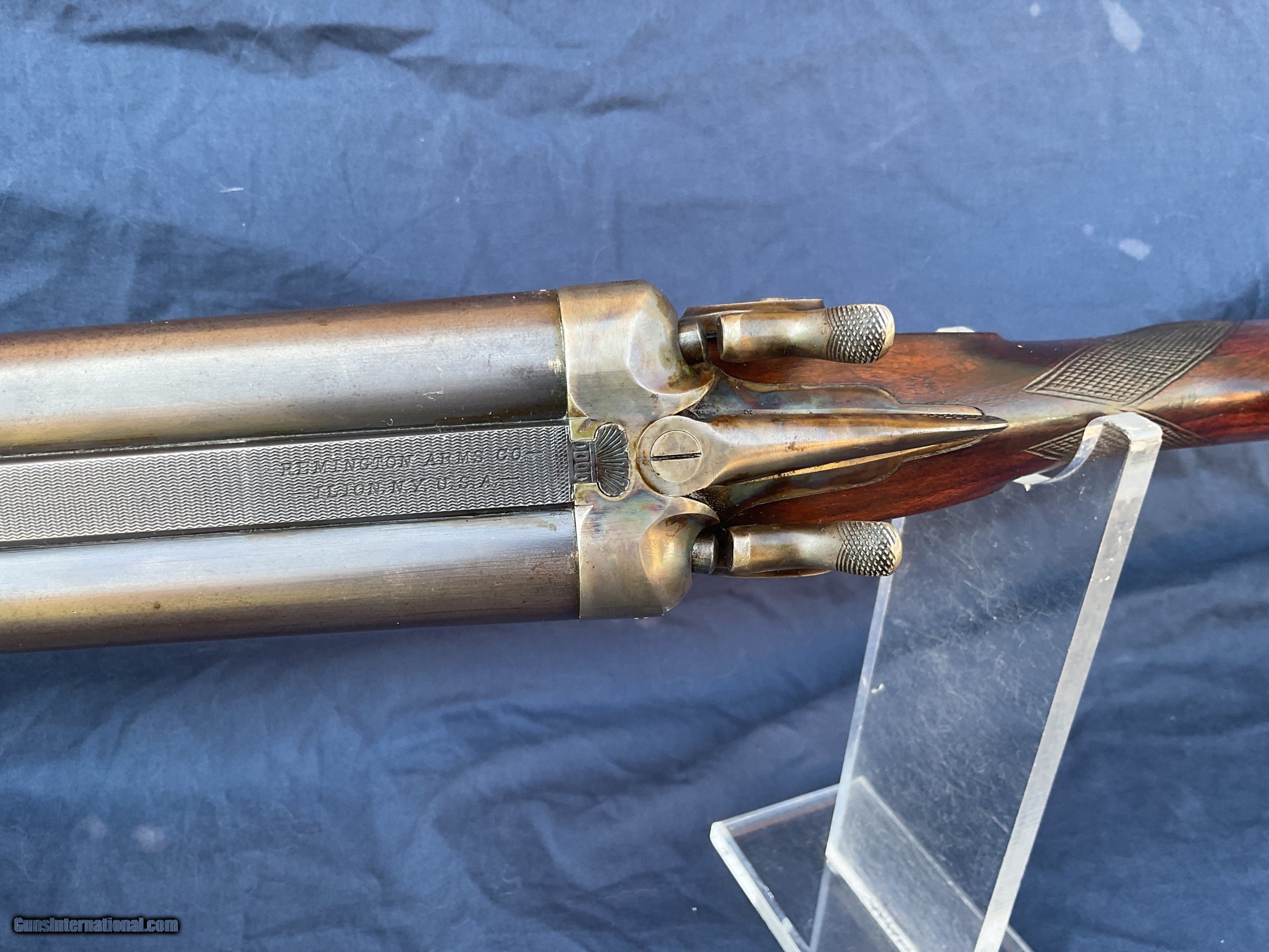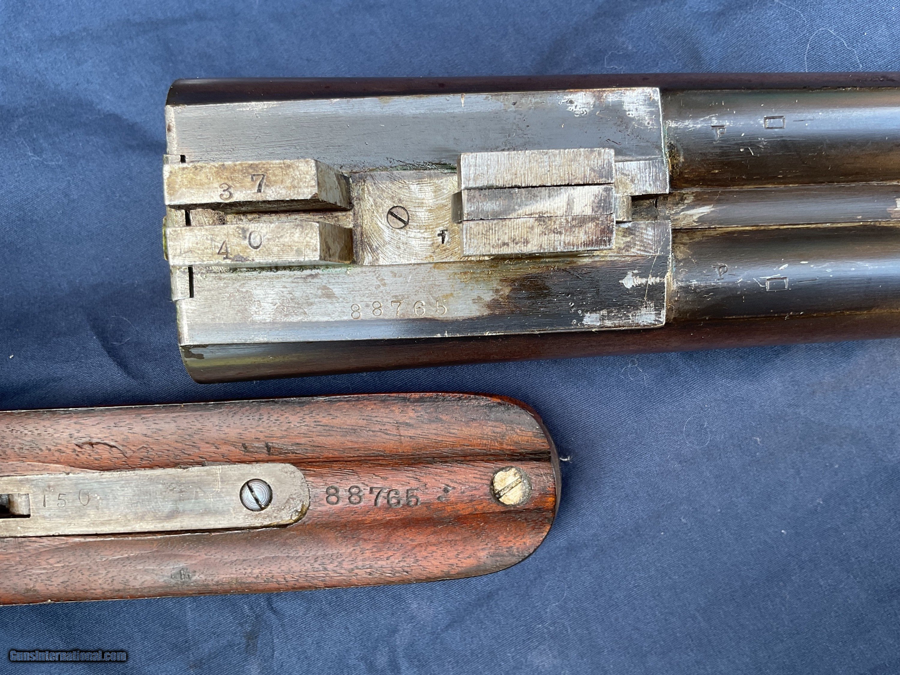 Description: Very nice condition Remington Model 1889 12 gauge hammer double barrel shotgun. Considered one of the finest shotguns of the period, the Remington Model 1889 proved popular through the 1890s. All serial numbers / assembly numbers match. Offered from plain to fancy grades, this example with serial number 88765 sports a checkered pistol grip stock and forend, case colored action and steel barrels. The forend also has a fancy inletted steel release lever for quick removal of the forend and barrels for cleaning, storing or traveling. Frequently, these pre-20th century shotguns are found in very hard used and often abused condition. This outstanding example still retains fine vivid case colors on the side plates, frame, lever lock, and hammers. Finding any original case color is unusual and desirable. The 30" barrels retain 60-65% original blue with remainder a nice brown / gray patina. The top of the barrels in front of the breech are marked “REMINGTON ARMS CO. ILION, NY USA” and each side lock plate are also marked “REMINGTON ARMS CO.” The stock and forend show fine checkering with the forend displaying a factory inletted forend cap. The wood is solid and in generally excellent condition. The butt stock is fitted with the correct factory hard rubber checkered butt plate with the attractive Remington logo embossed in the upper center. The action is extremely tight with no play between the barrels and receiver. Both hammers function perfectly with their corresponding triggers. Amazingly, both bores are in great condition with no pitting or corrosion, which is unusual for any shotgun from this period. These Remington made double guns are quite scarce now and are rarely found in this kind of condition. I offer a layaway plan and will consider trades. Please feel free to ask questions. SOLD Antique: Yes |