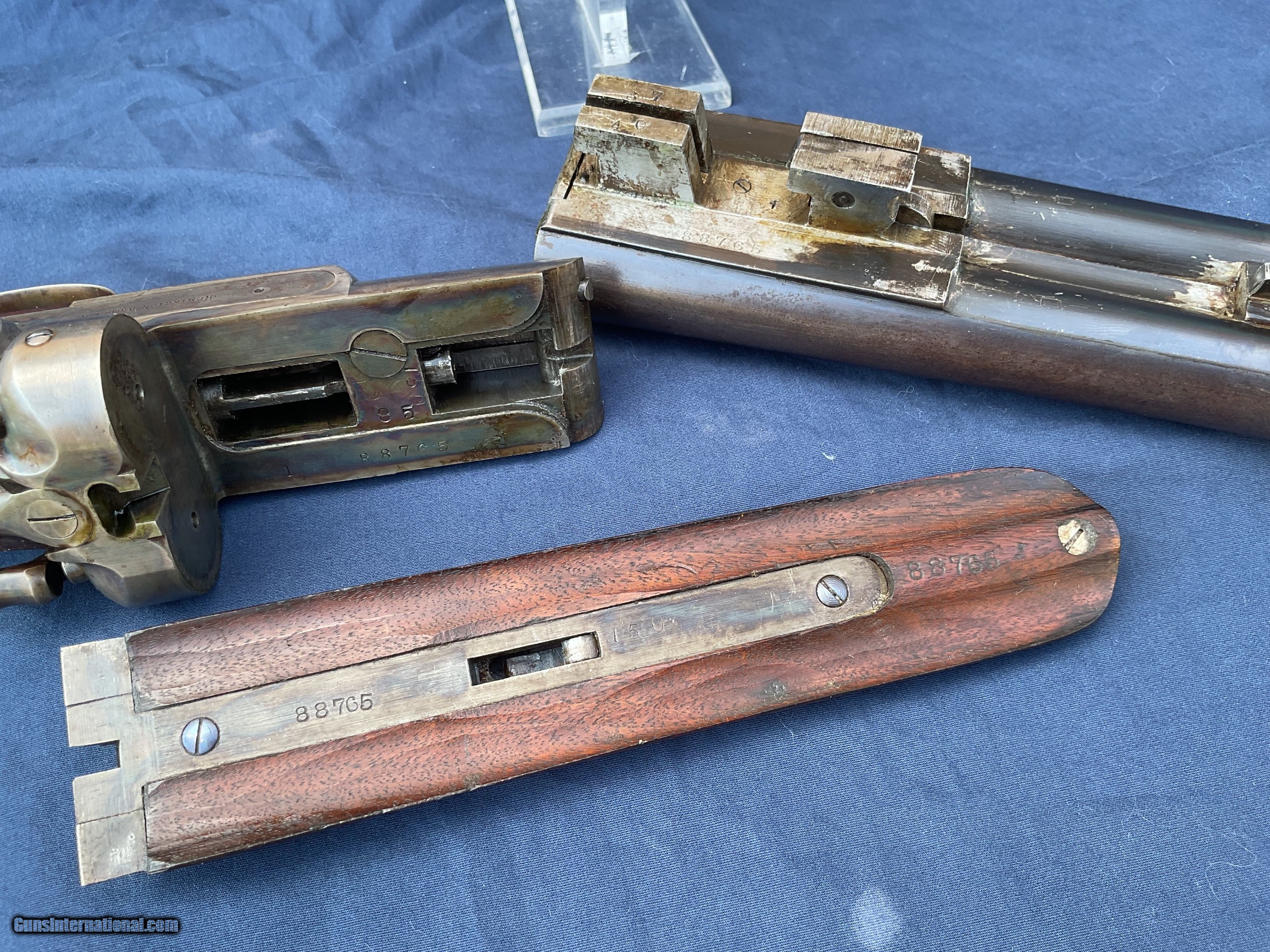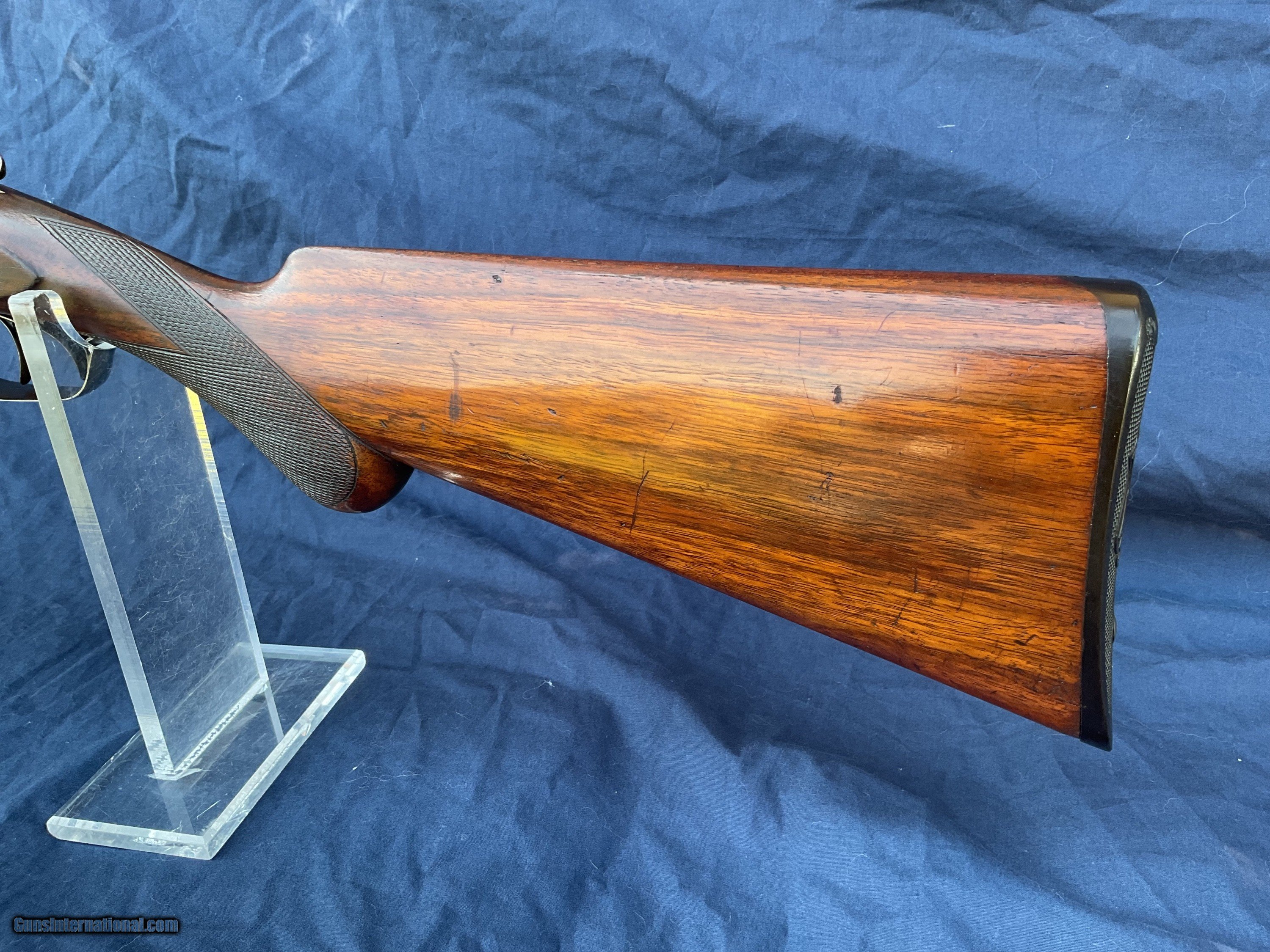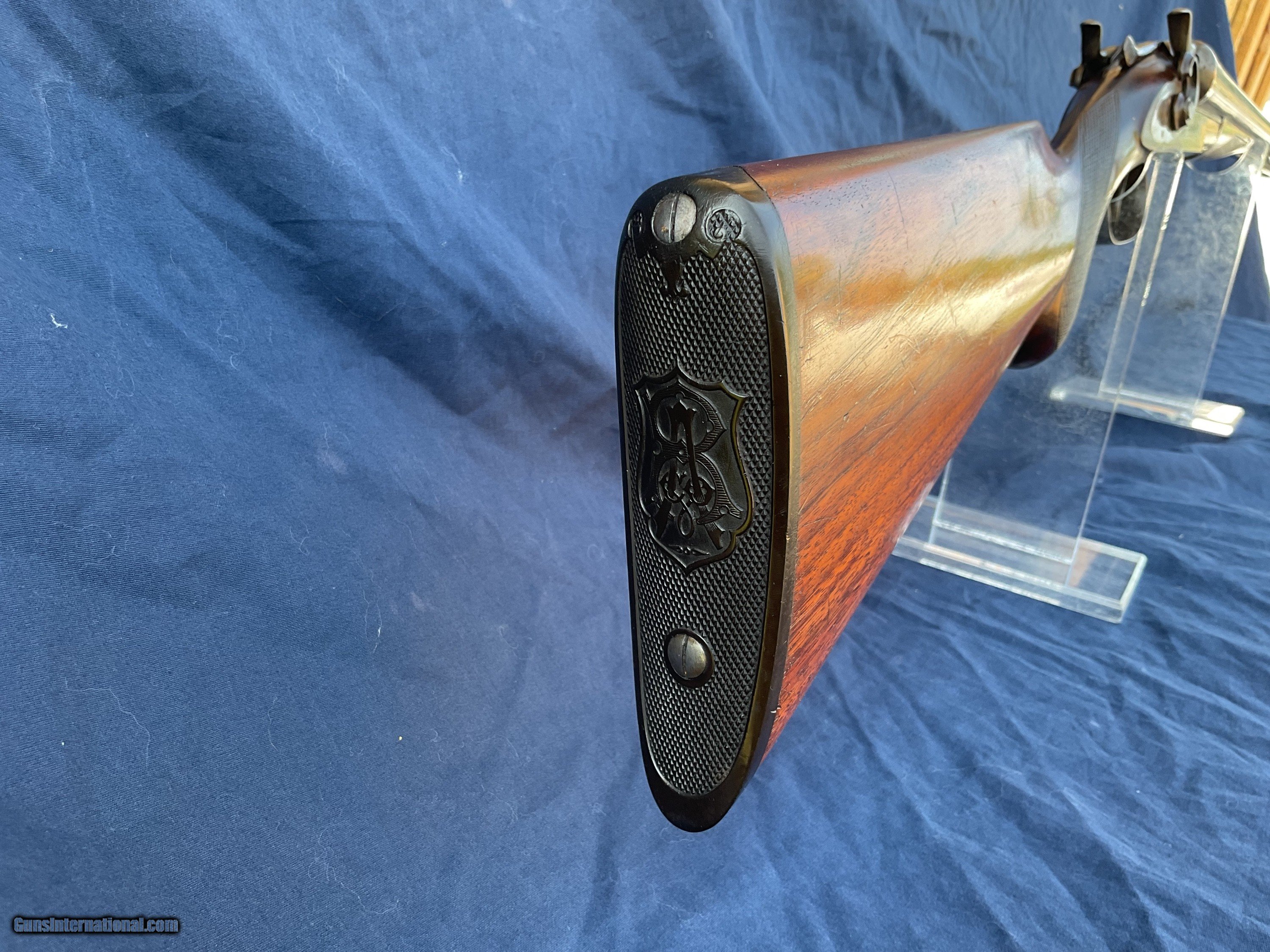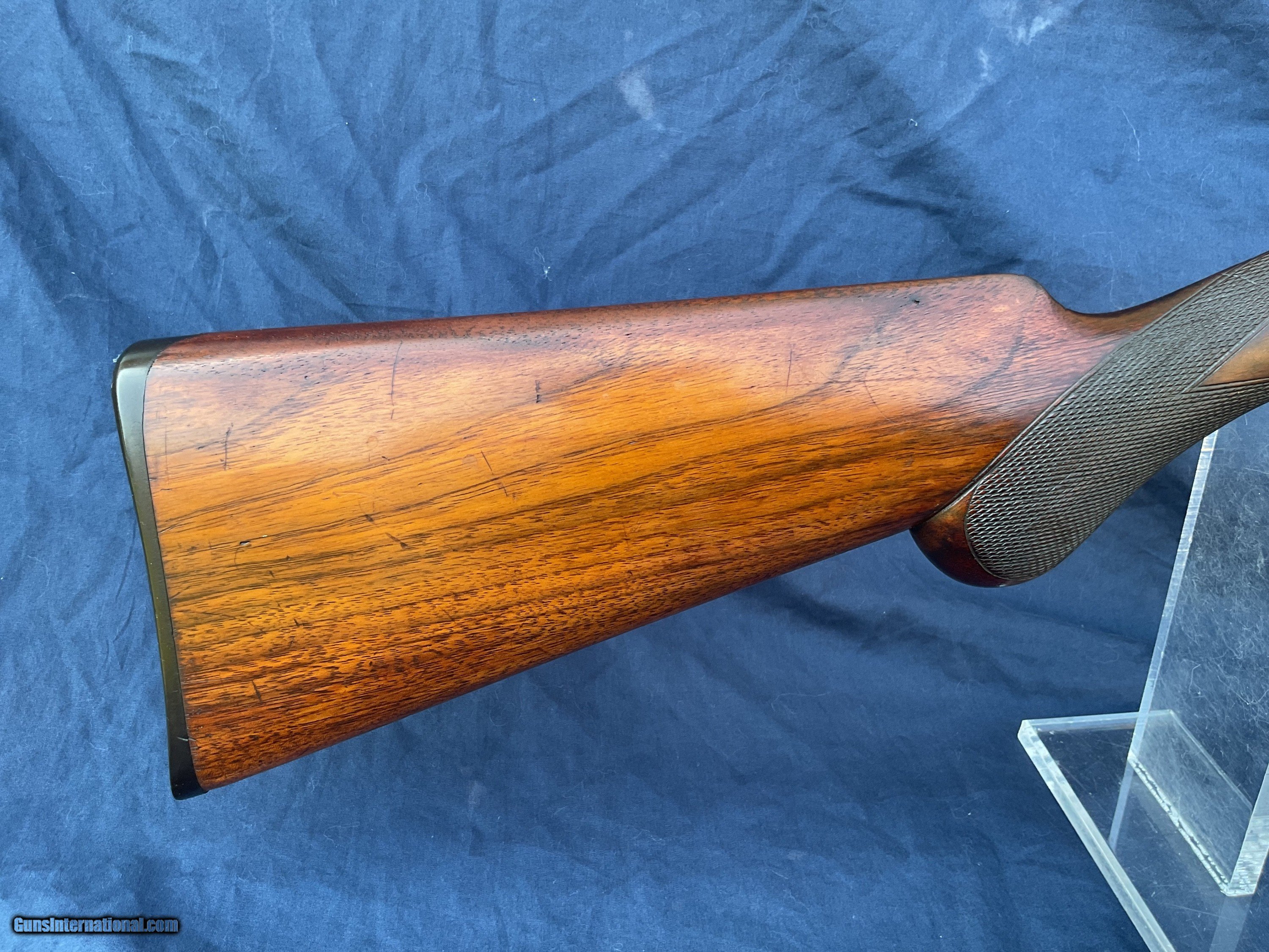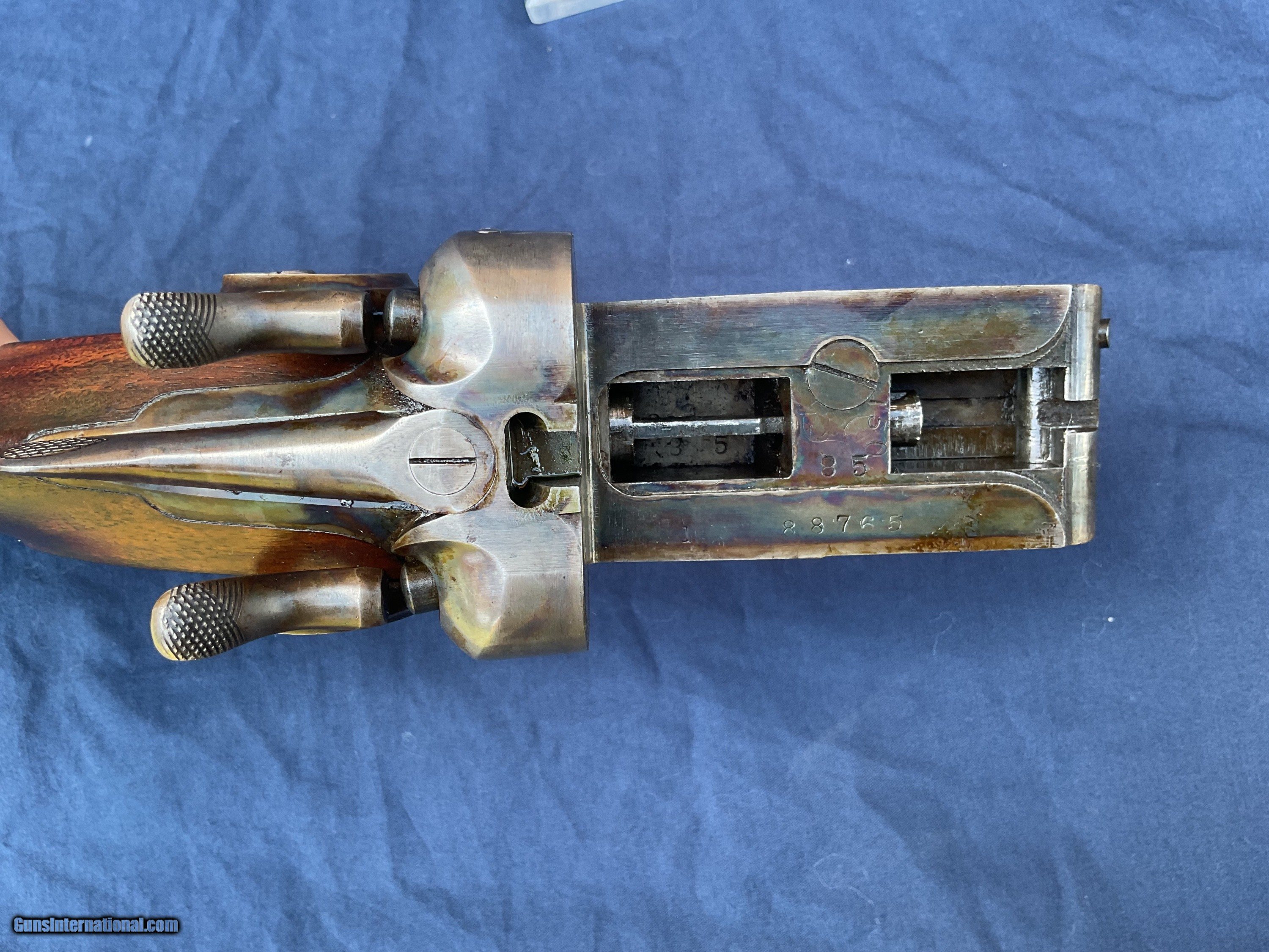 Description: Very nice condition Remington Model 1889 12 gauge hammer double barrel shotgun. Considered one of the finest shotguns of the period, the Remington Model 1889 proved popular through the 1890s. All serial numbers / assembly numbers match. Offered from plain to fancy grades, this example with serial number 88765 sports a checkered pistol grip stock and forend, case colored action and steel barrels. The forend also has a fancy inletted steel release lever for quick removal of the forend and barrels for cleaning, storing or traveling. Frequently, these pre-20th century shotguns are found in very hard used and often abused condition. This outstanding example still retains fine vivid case colors on the side plates, frame, lever lock, and hammers. Finding any original case color is unusual and desirable. The 30" barrels retain 60-65% original blue with remainder a nice brown / gray patina. The top of the barrels in front of the breech are marked “REMINGTON ARMS CO. ILION, NY USA” and each side lock plate are also marked “REMINGTON ARMS CO.” The stock and forend show fine checkering with the forend displaying a factory inletted forend cap. The wood is solid and in generally excellent condition. The butt stock is fitted with the correct factory hard rubber checkered butt plate with the attractive Remington logo embossed in the upper center. The action is extremely tight with no play between the barrels and receiver. Both hammers function perfectly with their corresponding triggers. Amazingly, both bores are in great condition with no pitting or corrosion, which is unusual for any shotgun from this period. These Remington made double guns are quite scarce now and are rarely found in this kind of condition. I offer a layaway plan and will consider trades. Please feel free to ask questions. SOLD Antique: Yes |