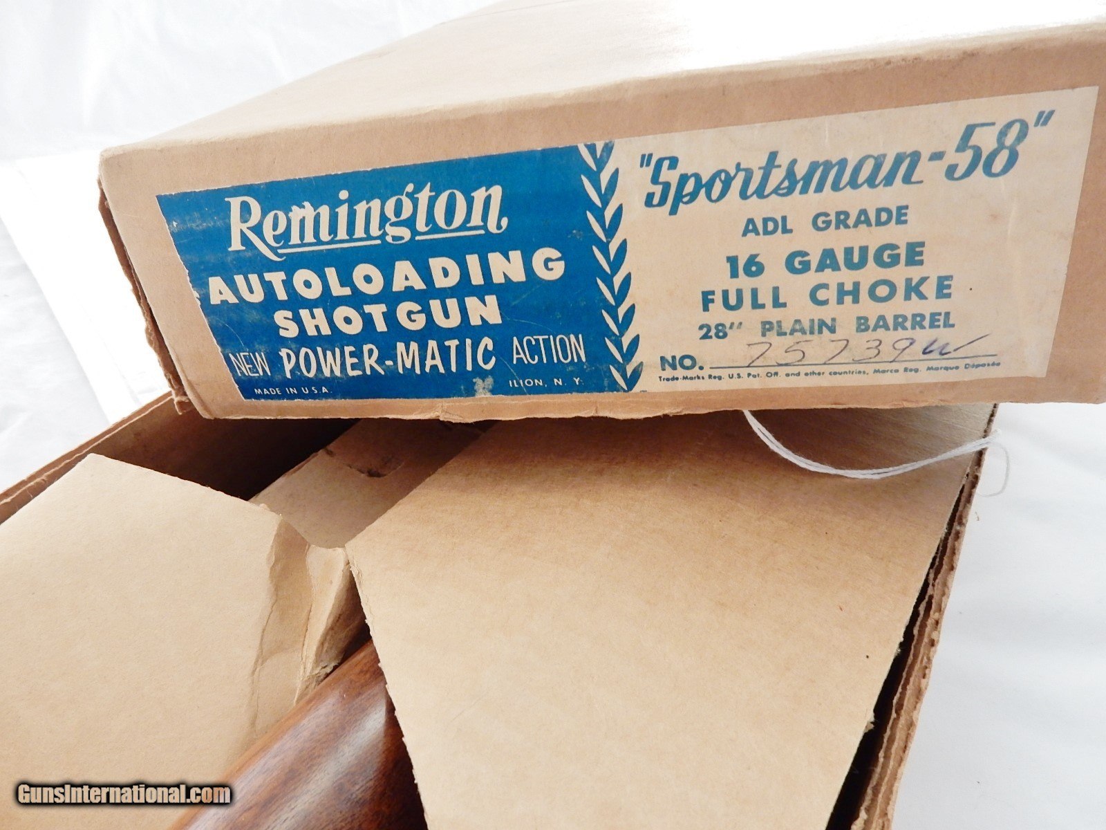 Description: This is a Remington sportsman 58 16 gauge with a 28 inch full choke barrel. This gun is 100% new in thew box. No upgrade possible. Barrel code is XC. Buyer pays 45.00 shipping. Thank you. 48-5-10 Remington's first gas operated shotgun with only 271,000 Model 58's produced from 1956-1963 as compared to over 4,000,000 Remington 1100's being produced. The vast majority of Model 58 Remington's were produced in 12 gauge. Investment grade. No upgrade possible. Correct, Complete, New. A true 64 year old timecapsule. SOLD |