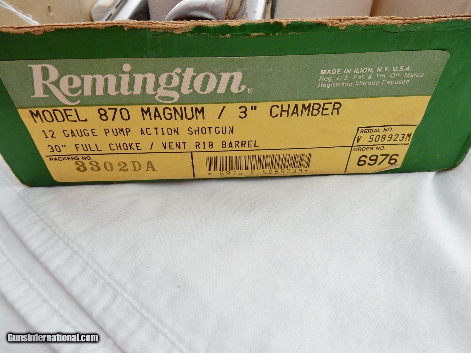 Description: This is a Remington 870 12 gauge magnum with a 30 inch full choke barrel. This gun is 99% in the box. Barrel code is DV. Buyer pays 35.00 shipping. Thank you. 48-15-5 SOLD |