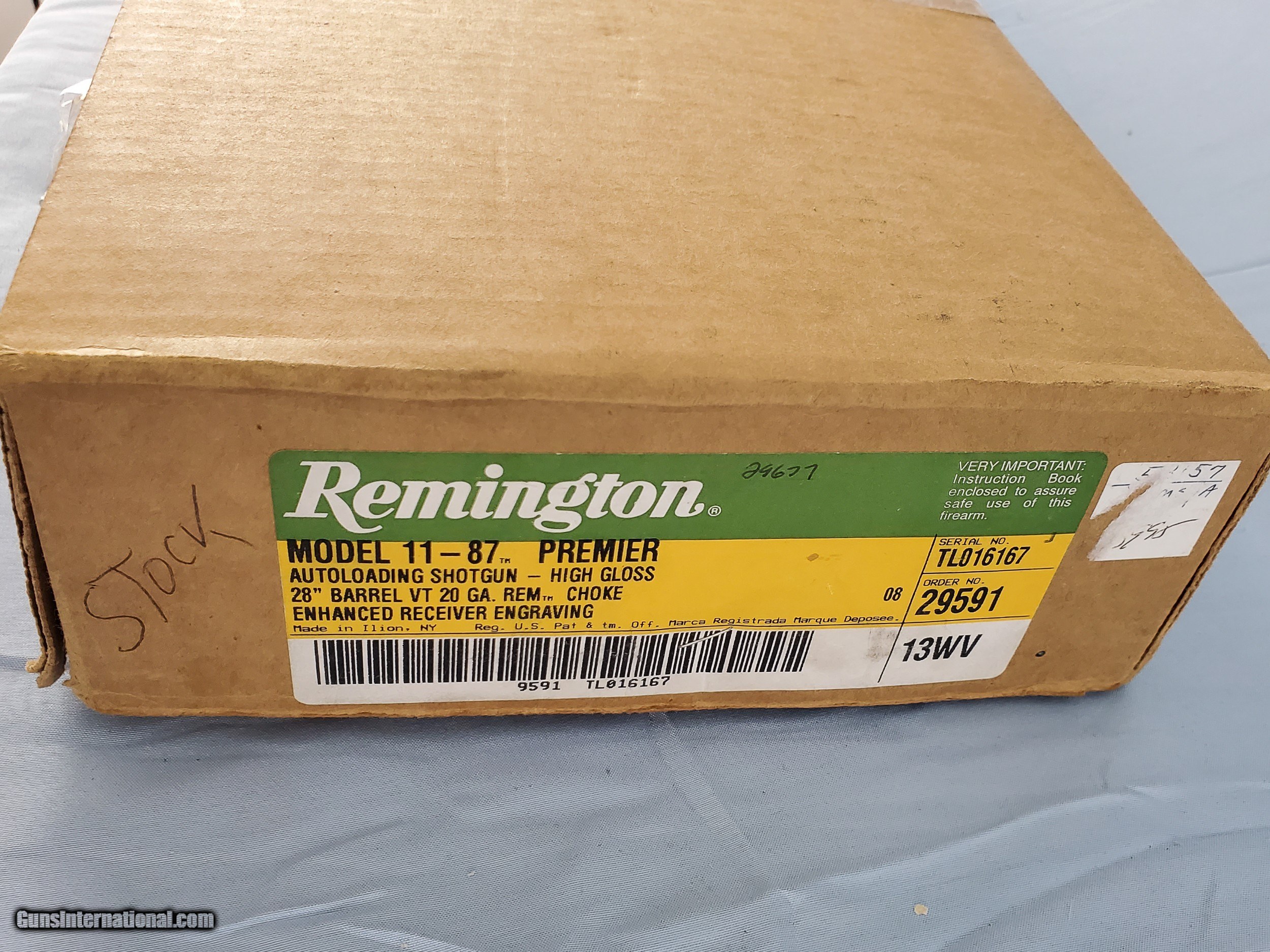 Description: MADE IN THE USA. BARREL IS 28'' WITH A VENT RIB AND SCREW IN CHOKES. INCLUDES WRENCH, PLUG, AND PAPERWORK. ALL FACTORY AND VERY GOOD CONDITION. PLEASE ADD $75 FOR SHIPPING. SOLD Shotgun Gauge: 20 Gauge Manufacturer: REMINGTON Model: 11-87 Condition: EXCELLENT Metal Condition: EXCELLENT Wood Condition: VERY GOOD Bore Condition: EXCELLENT LOP: 14 Case: FACTORY BOX |
