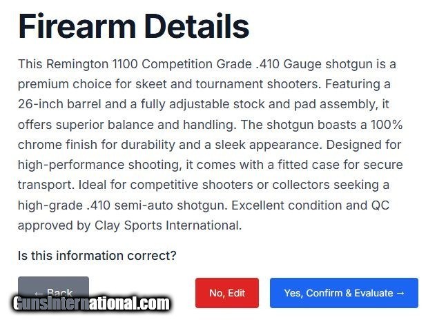 Description: Clay Sports Holiday Special Remington 1100 Competition 410 100% Chrome Plated Premier Walnut w/Adjustable Stock and Weighted Forearm Dockwiller Shop Tuned with High Gloss Finish Clay Sports International Consultants 321.259.7365 DockwillerGunsmiths This Remington 1100 Tournament Grade 410 Skeet shotgun is as Handsome as it is Functional with premier grade wood and an all metal coating of polished chrome for smooth action and extended durability. Not visible is the competition trigger job and internal parts QC at the shop. 100% Hard Chrome Finish Parts Included Dockwiller Shop Hand Fitted Adjustable Comb and Adjustable Butt/Pad This Ultra 410 has an adjustable comb with numerous settings and an adjustable Pad and Butt Plate with unlimited fitting selections to insure a comfortable setup for all shooter’s Physiology. This shotgun is 100% Pristine and looks very impressive with the polished chrome semi-gloss finish. With its adjustment versatility and choking the shotgun is perfect, of course, for skeet and will work well for sporting clays and regulated five-stand. This shotgun will provide enjoyment for many years and is available now at a very reasonable price. We always perform a pre-delivery Quality Control check to ensure that you shotgun is delivered in good working condition. To insure that your shot is delivered safely, we provide a free 2” Padded Military Cordura Case. Please feel free to contact us at 321-259-7365 for further information or to place your order. We look forward to working with you and appreciate your business. Happy Holidays Clay Sports International Terms & Conditions Once the Purchase has been confirmed by e-mail, the customer has three Calendar days to provide payment by Personal Check, Cashier’s Check, Money Order, USPS Money Order, Wire Transfer, or Cash. When the payment clears our bank, the shotgun is submitted to the Clay Sports Prep and Quality Control Shop to validate operation and apply glaze and Ruste Prufe Protection. The shipping group will then obtain a valid FFL and proceed to package your item for shipping. Shipping, Insurance, and method will be then negotiated with the customer to insure satisfaction. The shot gun will usually ship five days after the funds clear. Since the Shotgun will have been validated as above by QC, any returns for operational integrity must be approved by the QC group. Otherwise all sales are final. Customer Satisfaction is always our highest priority! That is because we appreciate your business. Contact: 321-259-7365 or 321-425-6699 Dockwiller Shop Happy Holidays! Clay Sports International Shotgun Gauge: .410 Gauge Manufacturer: Remington Model: 1100 410 Tournament Grade Skeet Barrel Length: 26 Bore Info: Excellent/Pristine Condition: Excellent/Pristine Metal Condition: Excellent/Pristine Wood Condition: Excellent/Pristine Bore Condition: Excellent/Pristine Barrels: Skeet Excellent/Pristine Barrel Type: Vent Skeet Action: Semi-Auto Triggers: Conditioned Tournament Stock: Adjustable Dockwiller Finish Stock Dimensions: Adjustable Stock Drop: Adjustable Stock Comb: Adjustable Stock Heel: Adjustable Fore End: Weighted Balanced Butt Pad: Adjustable Rib: Vented Finish: Dockwiller High Gloss Weight: 8 Sights: Bead Chokes: Skeet Engraving: Factory Extras: Adjustable Stock, Adj. Trigger, Chrome Finish, Cap Weight Case: Cordura Item Location: Brevard Florida Grips: Pistol Price: $2,995.00 Shipping: $49.00 Buy Now Contact Seller |