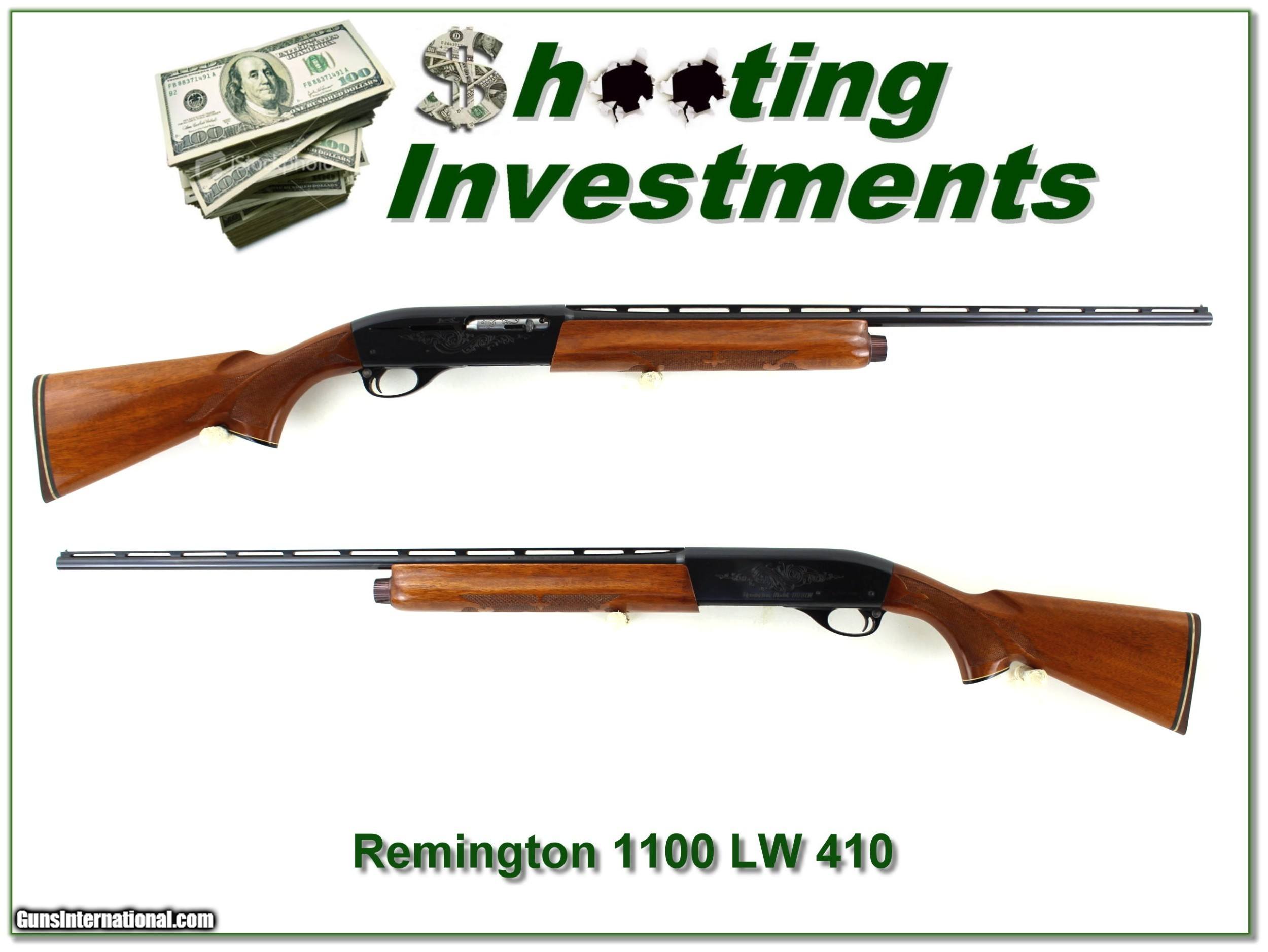 Description: Collectors, shooters and hunters, this is a near new and top condition Remington 1100 LW in 410 bore. I find no marks of note on the metal or wood. It has a 25in Vent Rib Modified choked barrel. The LOP was reduced to 12.5in making this one perfect for a youth or lady! It is a real Shooting Investment! Shipping and insurance is $39. Please email me with any questions or larger pictures. (Consign your quality firearms with Shooting Investments for only 12%! Let me know if you have any you would like to sell!) 21-1537 Payment: Payment is by Money Order, Cashiers Check or Personal Check. I can now also accept Credit Cards (MasterCard, Visa, Discover & American Express) with a 3% convenience fee. Shipping: The shipping charge will be listed in each description. It is $39 for most firearms. Some heavy guns or those insured for over $2000 will be higher. Shipments to Alaska and Hawaii are higher because air shipment is required. Most firearms are shipped on Tuesday and Thursday and usually in 5 days of receipt of payment. We package all shipments carefully and insure them. Optics are shipped Priority Mail and most other non-firearm shipments are shipped First Class. Returns: Our return policy is simple. If for any reason you are not pleased with your purchase, you may return your item for a full refund of purchase price. Ammunition cannot be returned. It is important to us that you are happy. Guns cannot be fired or dissembled before returning them and they must be returned in the same condition as received. Notification of a return must occur with-in 3 days of receipt at your dealer. Shipping, convenience and dealer fees are not refundable and are the responsibility of the buyer. Lay-a-way: If needed, we offer a 60 day lay-a-way option on most firearms. It is 1/3 now, 1/3 in 30 days and 1/3 in 60 days. Lay-a-way firearm sales are final and if not completed the first payment cannot be returned. Consigning your firearms with Shooting Investments: We will help you get top dollar for your firearms. While most local guns shops charge 20% or more, our fee is only 12% with a minimum of $75. At your local gun shop it might take months to sell. Selling on-line provides instant access to thousands of interested buyers. You won’t find any other on-line dealer willing to sell your firearms for only 12% or listing every gun on 3 separate s. Selling through an House typically costs the seller 15% and the buyer an addition 15% (so 30%) and you have to wait several months to sell and longer to receive funds. If properly priced, we will sell your firearms in a few weeks. Send us an email or give us a call and we’ll explain how easy it is for you to get top dollar. Trading: Trading for use is really just buying your gun to re-sell. If you have a gun you want to trade, please email a picture and we will let you know what we can give or it. You will always get more if we sell it for you on consignment. Help for California Buyers: We are happy to ship to California. It is the buyer’s responsibility to make sure any item you buy is legal in your state. We are also happy to help with your purchase of a firearm from someone other than us. If you see a gun you would like to buy but the seller can’t or won’t ship to California they can ship to use and we’ll then ship it to your California dealer. The cost for this service is only $30 + shipping. Let us know if we can help! SOLD |