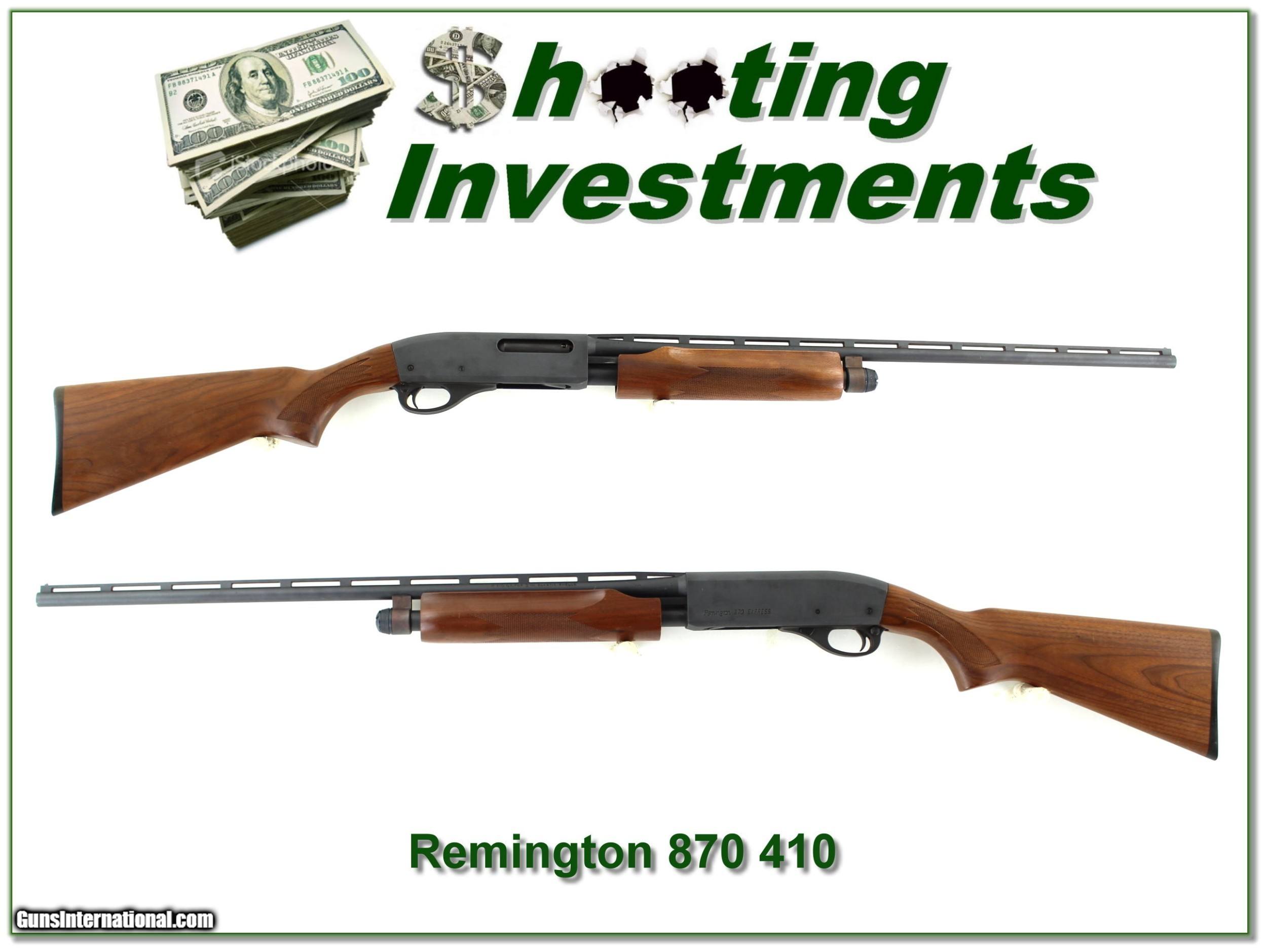 Description: This is a very nice Remington 870 Express in 410 bore. I am sure only a few shells ever fired. It shoots 3in shells and has a 25in Vent Rib full barrel. The has outstanding grain and I find only a couple insignificant marks. Otherwise it looks new. I am selling this one on consignment and as such lay-a-way can’t be used. It does of course have the standard 3-day inspection. Shipping and insurance is $39. Please email me with any questions or larger pictures. (Consign your quality firearms with Shooting Investments for only 12%! Let me know if you have any you would like to sell!) 21-0600 Payment: Payment is by Money Order, Cashiers Check or Personal Check. I can now also accept Credit Cards (MasterCard, Visa, Discover & American Express) with a 3% convenience fee. Shipping: The shipping charge will be listed in each description. It is $39 for most firearms. Some heavy guns or those insured for over $2000 will be higher. Shipments to Alaska and Hawaii are higher because air shipment is required. Most firearms are shipped on Tuesday and Thursday and usually in 5 days of receipt of payment. We package all shipments carefully and insure them. Optics are shipped Priority Mail and most other non-firearm shipments are shipped First Class. Returns: Our return policy is simple. If for any reason you are not pleased with your purchase, you may return your item for a full refund of purchase price. Ammunition cannot be returned. It is important to us that you are happy. Guns cannot be fired or dissembled before returning them and they must be returned in the same condition as received. Notification of a return must occur with-in 3 days of receipt at your dealer. Shipping, convenience and dealer fees are not refundable and are the responsibility of the buyer. Lay-a-way: If needed, we offer a 60 day lay-a-way option on most firearms. It is 1/3 now, 1/3 in 30 days and 1/3 in 60 days. Lay-a-way firearm sales are final and if not completed the first payment cannot be returned. Consigning your firearms with Shooting Investments: We will help you get top dollar for your firearms. While most local guns shops charge 20% or more, our fee is only 12% with a minimum of $75. At your local gun shop it might take months to sell. Selling on-line provides instant access to thousands of interested buyers. You won’t find any other on-line dealer willing to sell your firearms for only 12% or listing every gun on 3 separate s. Selling through an House typically costs the seller 15% and the buyer an addition 15% (so 30%) and you have to wait several months to sell and longer to receive funds. If properly priced, we will sell your firearms in a few weeks. Send us an email or give us a call and we’ll explain how easy it is for you to get top dollar. Trading: Trading for use is really just buying your gun to re-sell. If you have a gun you want to trade, please email a picture and we will let you know what we can give or it. You will always get more if we sell it for you on consignment. Help for California Buyers: We are happy to ship to California. It is the buyer’s responsibility to make sure any item you buy is legal in your state. We are also happy to help with your purchase of a firearm from someone other than us. If you see a gun you would like to buy but the seller can’t or won’t ship to California they can ship to use and we’ll then ship it to your California dealer. The cost for this service is only $30 + shipping. Let us know if we can help! SOLD |