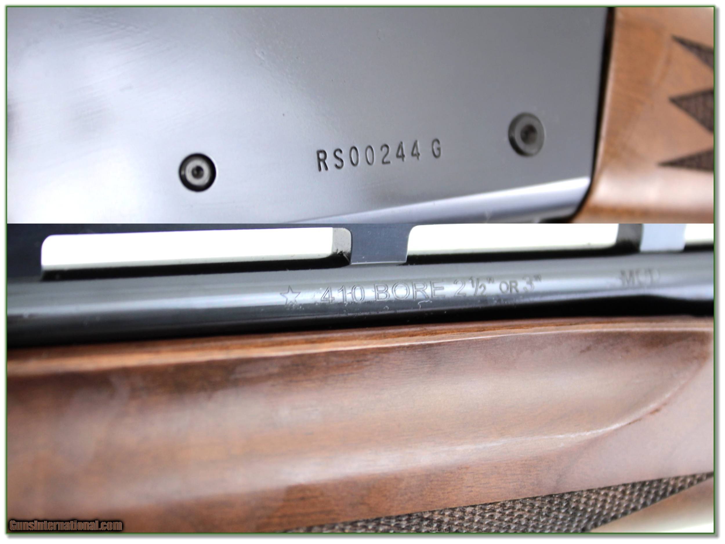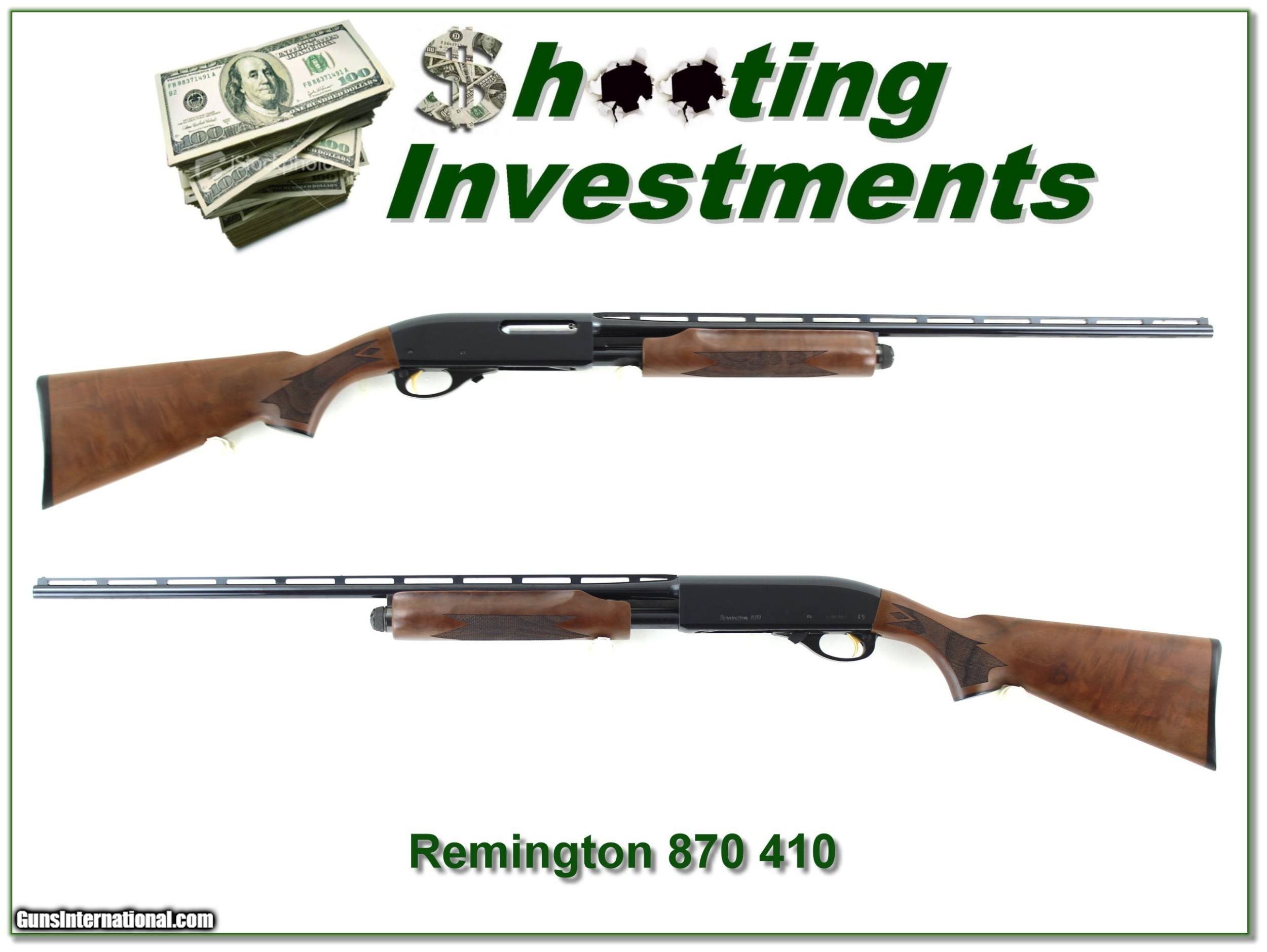 Description: Shooters and collectors, this is a new condition and unfired Remington 870 Lightweight in 410 bore. It has MUCH nicer wood than most and a 25in Vent Rib Modified choked barrel. It will make a fine addition to your collection of be a nice field gun. I am selling this one on consignment and as such lay-a-way can’t be used. It does of course have the standard 3-day inspection. Shipping and insurance is $39. Please email me with any questions or larger pictures. (Consign your quality firearms with Shooting Investments for only 12%! Let me know if you have any you would like to sell!) 20-1259 Payment: Payment is by Money Order, Cashiers Check or Personal Check. I can now also accept Credit Cards (MasterCard, Visa, Discover & American Express) with a 3% convenience fee. Shipping: The shipping charge will be listed in each description. It is $39 for most firearms. Some heavy guns or those insured for over $2000 will be higher. Shipments to Alaska and Hawaii are higher because air shipment is required. Most firearms are shipped on Tuesday and Thursday and usually in 5 days of receipt of payment. We package all shipments carefully and insure them. Optics are shipped Priority Mail and most other non-firearm shipments are shipped First Class. Returns: Our return policy is simple. If for any reason you are not pleased with your purchase, you may return your item for a full refund of purchase price. Ammunition cannot be returned. It is important to us that you are happy. Guns cannot be fired or dissembled before returning them and they must be returned in the same condition as received. Notification of a return must occur with-in 3 days of receipt at your dealer. Shipping, convenience and dealer fees are not refundable and are the responsibility of the buyer. Lay-a-way: If needed, we offer a 60 day lay-a-way option on most firearms. It is 1/3 now, 1/3 in 30 days and 1/3 in 60 days. Lay-a-way firearm sales are final and if not completed the first payment cannot be returned. Consigning your firearms with Shooting Investments: We will help you get top dollar for your firearms. While most local guns shops charge 20% or more, our fee is only 12% with a minimum of $75. At your local gun shop it might take months to sell. Selling on-line provides instant access to thousands of interested buyers. You won’t find any other on-line dealer willing to sell your firearms for only 12% or listing every gun on 3 separate s. Selling through an House typically costs the seller 15% and the buyer an addition 15% (so 30%) and you have to wait several months to sell and longer to receive funds. If properly priced, we will sell your firearms in a few weeks. Send us an email or give us a call and we’ll explain how easy it is for you to get top dollar. Trading: Trading for use is really just buying your gun to re-sell. If you have a gun you want to trade, please email a picture and we will let you know what we can give or it. You will always get more if we sell it for you on consignment. Help for California Buyers: We are happy to ship to California. It is the buyer’s responsibility to make sure any item you buy is legal in your state. We are also happy to help with your purchase of a firearm from someone other than us. If you see a gun you would like to buy but the seller can’t or won’t ship to California they can ship to use and we’ll then ship it to your California dealer. The cost for this service is only $30 + shipping. Let us know if we can help! SOLD |