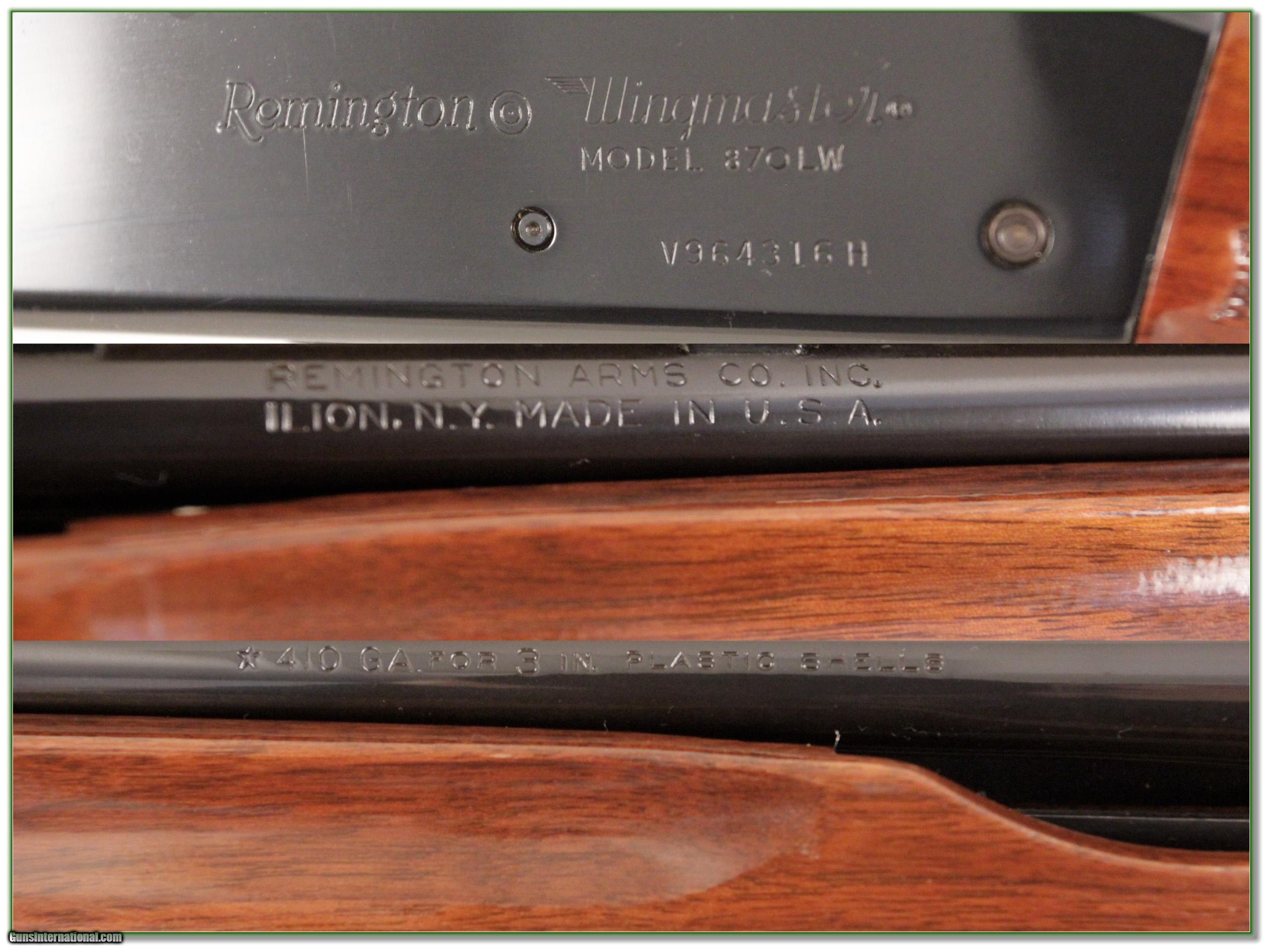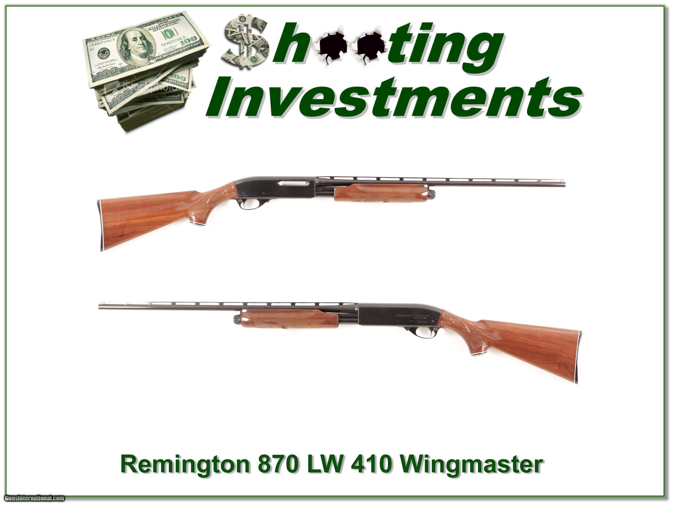 Description: This is a very nice 870 LW (Light Weight) in the very hard to find 410. It has a 25in Vent Rib full barrel. The wood is excellent with only a couple insignificant handing marks. The blue has no edge wear and I’m sure never fired many shells. Only a couple light freckles and handing marks. It will make a nice addition to your collection or be a classic field gun. I am selling this one on consignment and as such, lay-a-way can’t be used. It does of course have the standard 3 day inspection. Shipping and insurance is $35 or $15 more if you want it shipped in a new Plano hard case. Please email me with any questions or larger pictures. (I now consign quality firearms only 10%! Let me know if you have any you would like to sell!) [16-1190] Payment: Payment is by Money Order, Cashiers Check or Personal Check. I can now also accept MasterCard and Visa with a 3% convenience fee. PayPal can be used for some items but never firearms. Please let us know if you would like to pay via PayPal. Shipping: The shipping charge will be listed in each description. It is $35 for most guns. Some heavy guns or those insured for over $2000 will be higher. Shipments to Alaska and Hawaii are higher because air shipment is required. Most firearms are shipped within 5 days of receipt of payment. We prefer shipping at the beginning of the week to avoid firearms in transit over weekends. We package all shipments carefully and insure them for the full purchase price, rounded up to the next $100. In the unlikely event that damage occurs, it is important that you save all packaging material for the claims process. Optics are shipped Priority Mail and most other non-firearm shipments are shipped First Class. Returns: Our return policy is simple. If for any reason you are not pleased with your purchase, you may return your item for a refund. The only exception is ammunition, it cannot be returned. It is important to us that you are happy. Guns cannot be fired or dissembled before returning them and must be returned in the same condition as received. Notification of a return must occur with-in 3 days of receipt at your dealer. Shipping, convenience and dealer fees are not refundable and are the responsibility of the buyer. Lay-a-way: If needed, we offer a 60 day lay-a-way option on most firearms. It is 1/3 now, 1/3 in 30 days and 1/3 in 60 days. Lay-a-way firearm sales are final. Consigning your firearms with Shooting Investments: We will help you get top dollar for your firearms. While most local guns shops charge 20% or more, our fee is only 10% with a minimum of $50. At your local gun shop it might take months to sell. Selling on-line provides instant access to thousands of interested buyers. You won’t find any other on-line dealer willing to sell your firearms for only 10% or listing every gun on 4 separate s. Selling through an House typically costs the seller 15% and the buyer an addition 15% (so 30%) and you have to wait several months to sell and longer to receive funds. If properly priced, we will sell your firearms in a week or two. Send us an email or give us a call and we’ll explain how easy it is for you to get top dollar. Trading: We collect guns and usually just trade for guns we want to add to our collections. We often sell guns for others wanting to purchase one of ours. We find this the most fair to both of us. Our Commission is only 10% and we hold the gun you want until yours sells. Please contact us if you want to sell one of yours to buy one of ours. Help for California Buyers: We are happy to ship to California. It is the buyer’s responsibility to make sure any item you buy is legal in your state. We are also happy to help with your purchase of a firearm from someone other than us. If you see a gun you would like to buy but the seller can’t or won’t ship to California we can help. You buy the gun and have it shipped to us. We’ll then ship it to your California dealer. The cost for this service is only $30 + shipping. Let me know if we can help! SOLD |